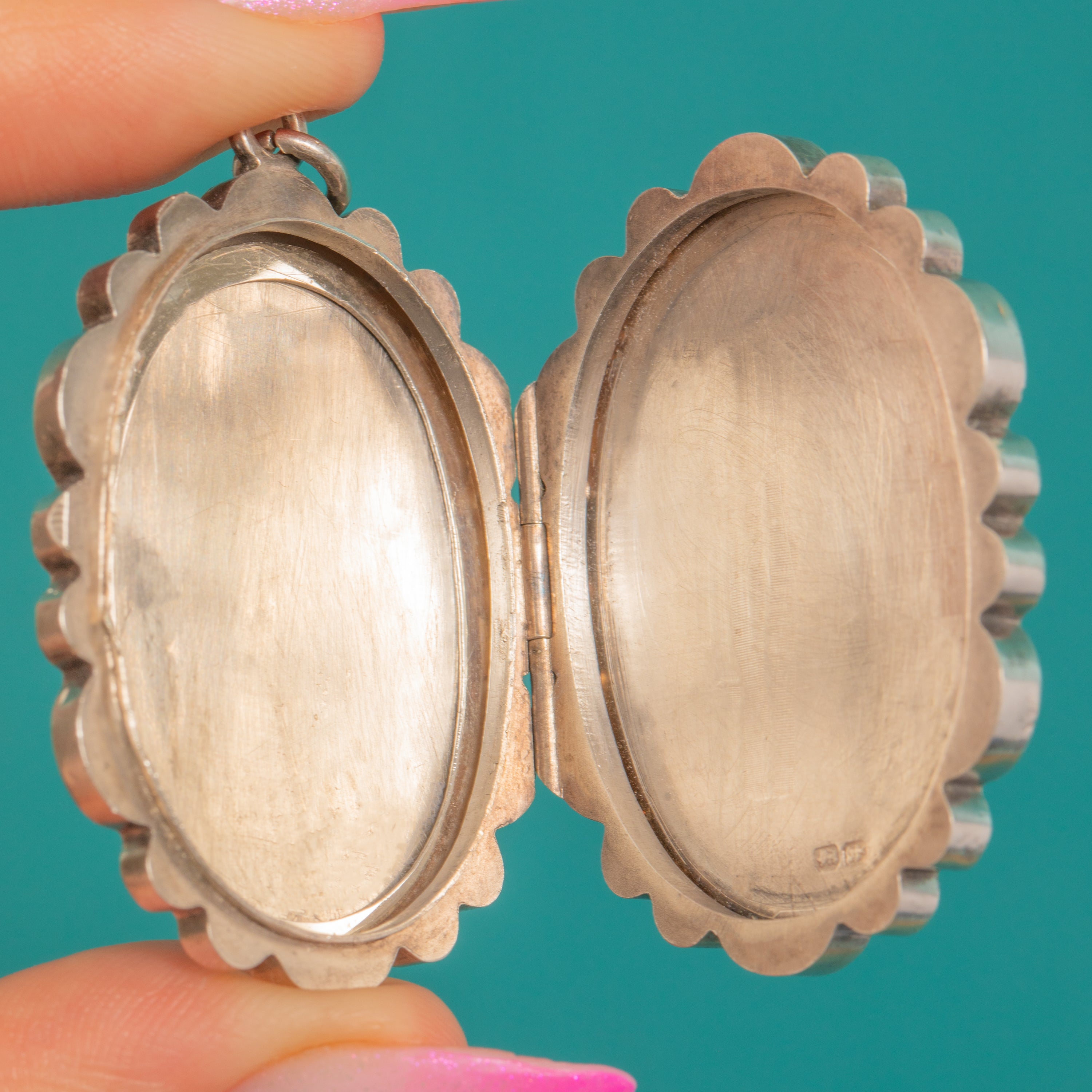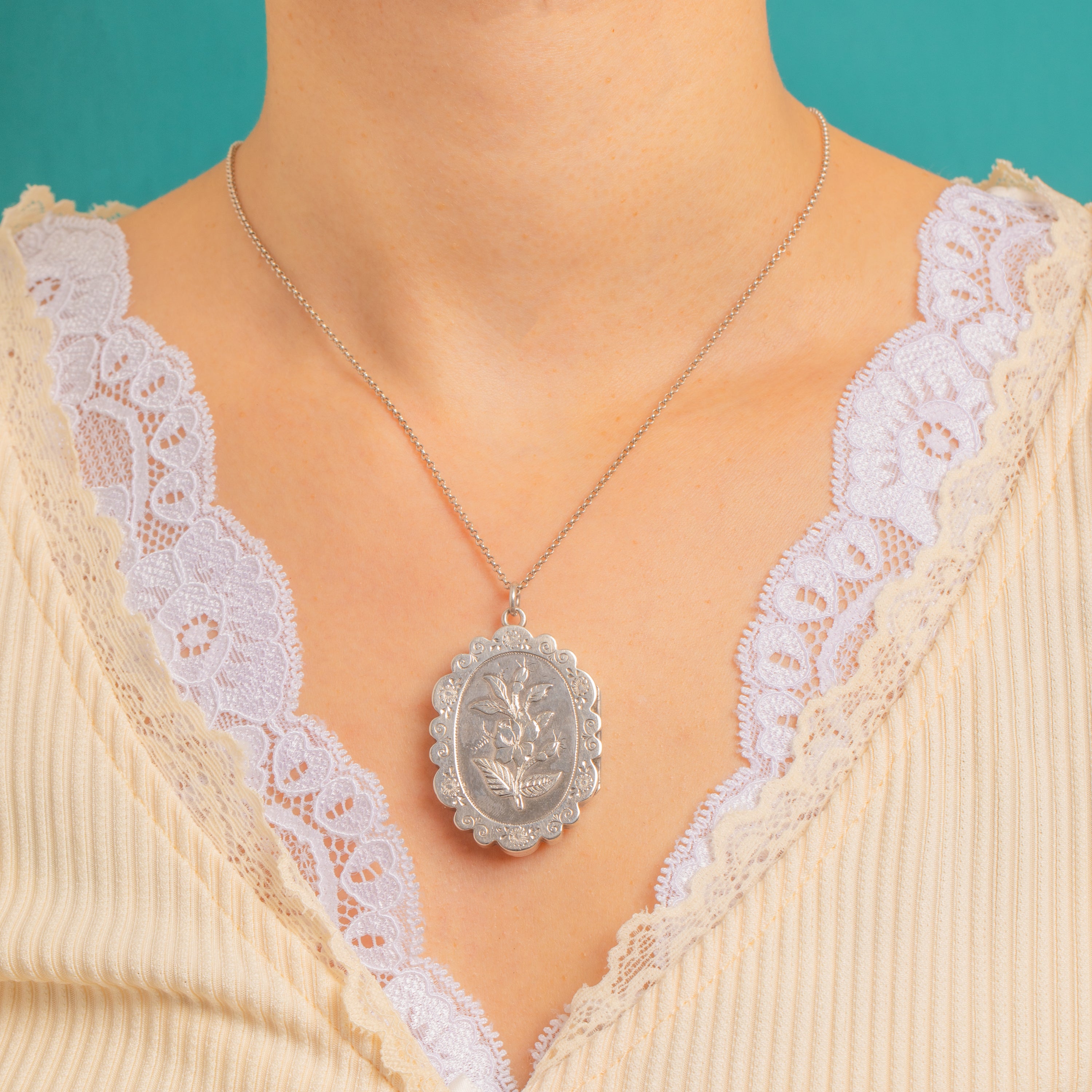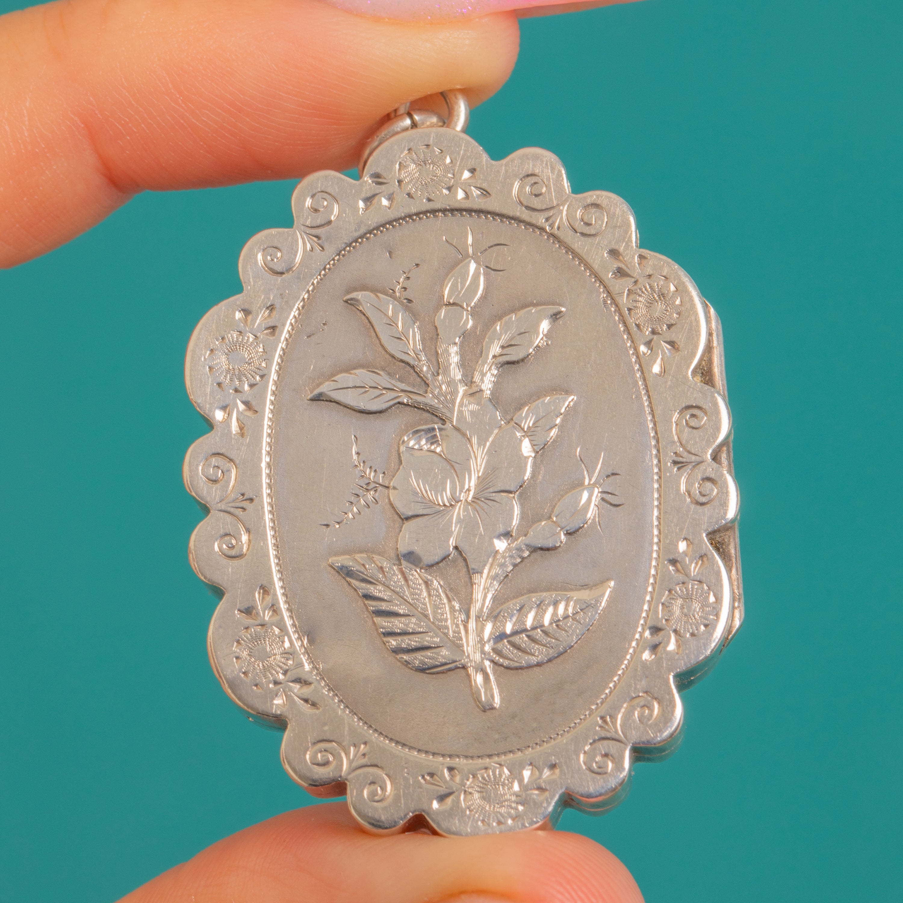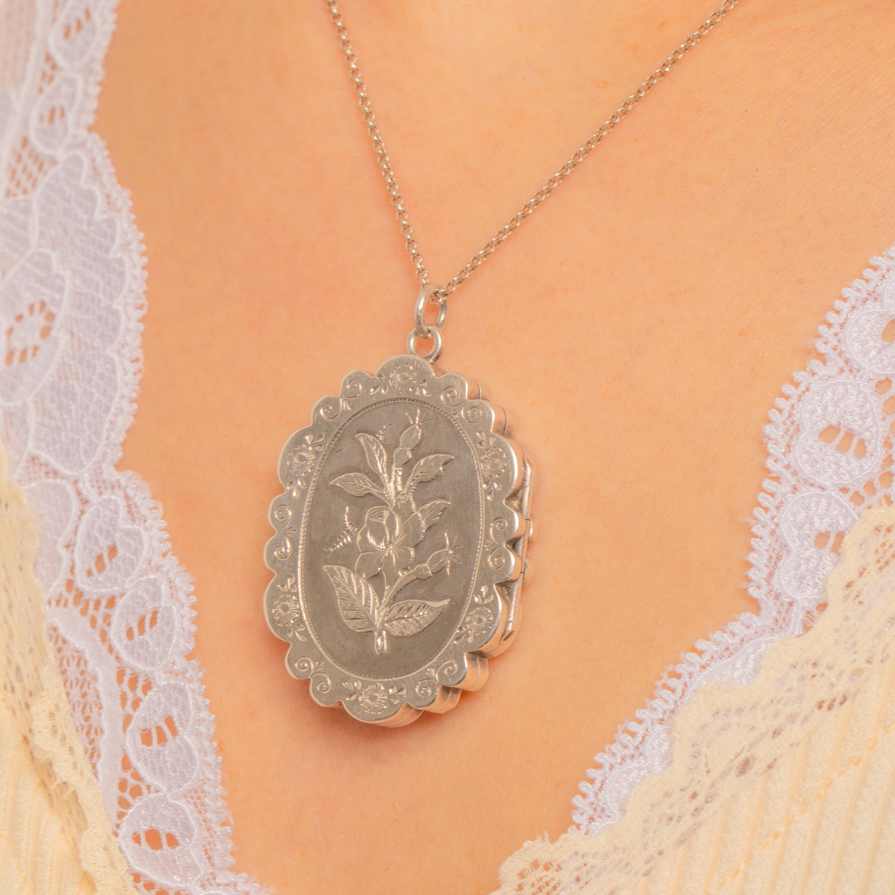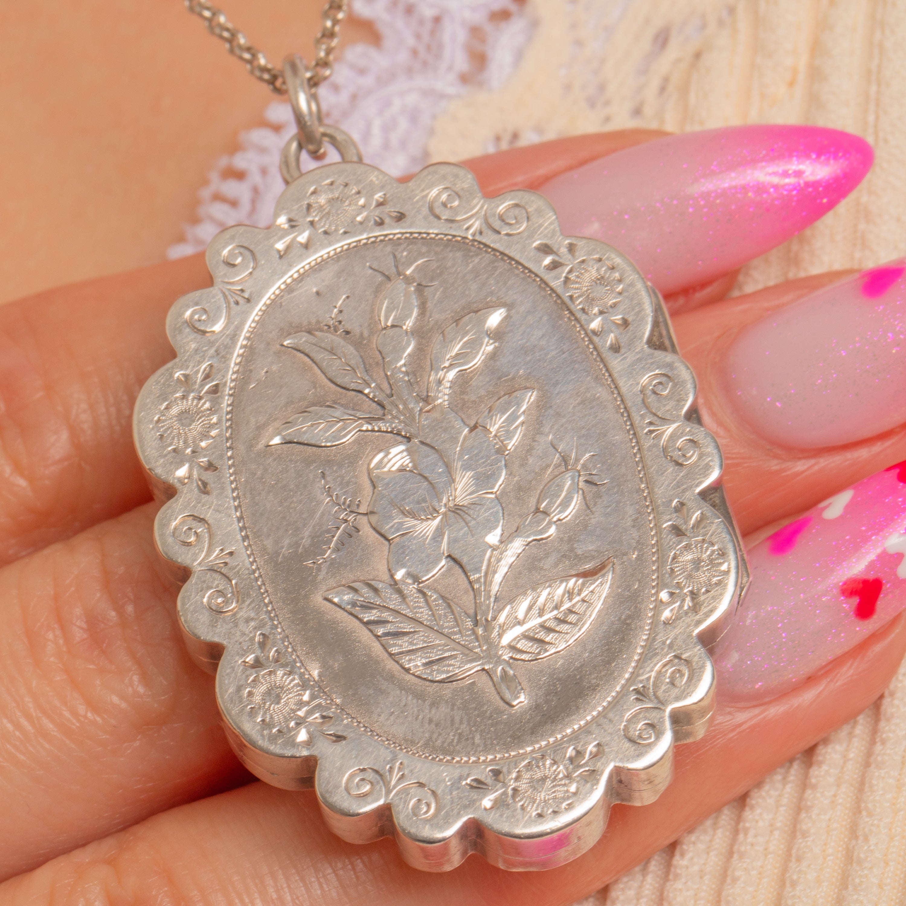 Romantic and refined, this Victorian Aesthetic Silver locket is adorned with a delicately chased floral centrepiece framed by a beaded reserve and a scalloped, rosette-punched border. Its softly domed oval silhouette and crisp decoration capture the elegance of the era with a charming, sentimental flourish.