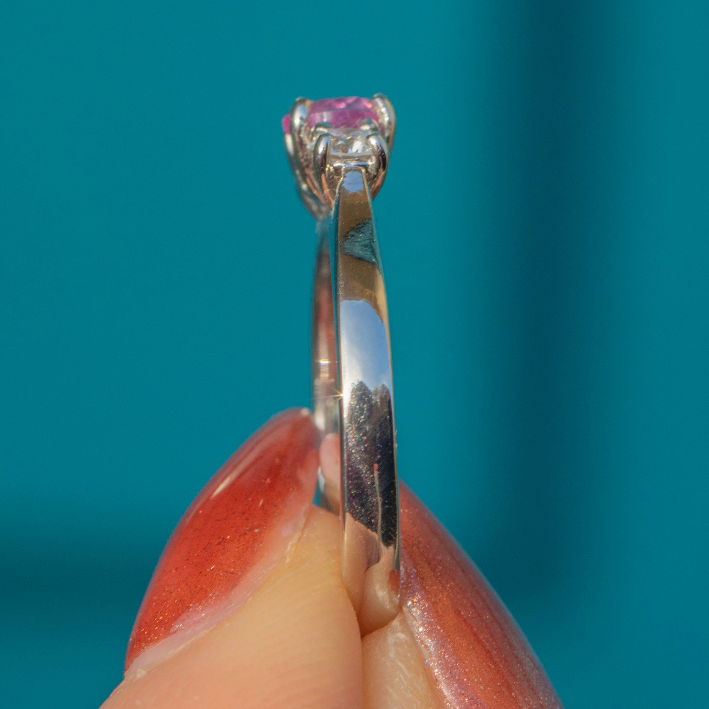 Crafted from cool, smooth Platinum settings, her sleek design glides onto your finger like a dream, making her perfect for daily wear. This Pink Sapphire ring is a dazzling piece and would make a fine choice for a unique engagement ring!