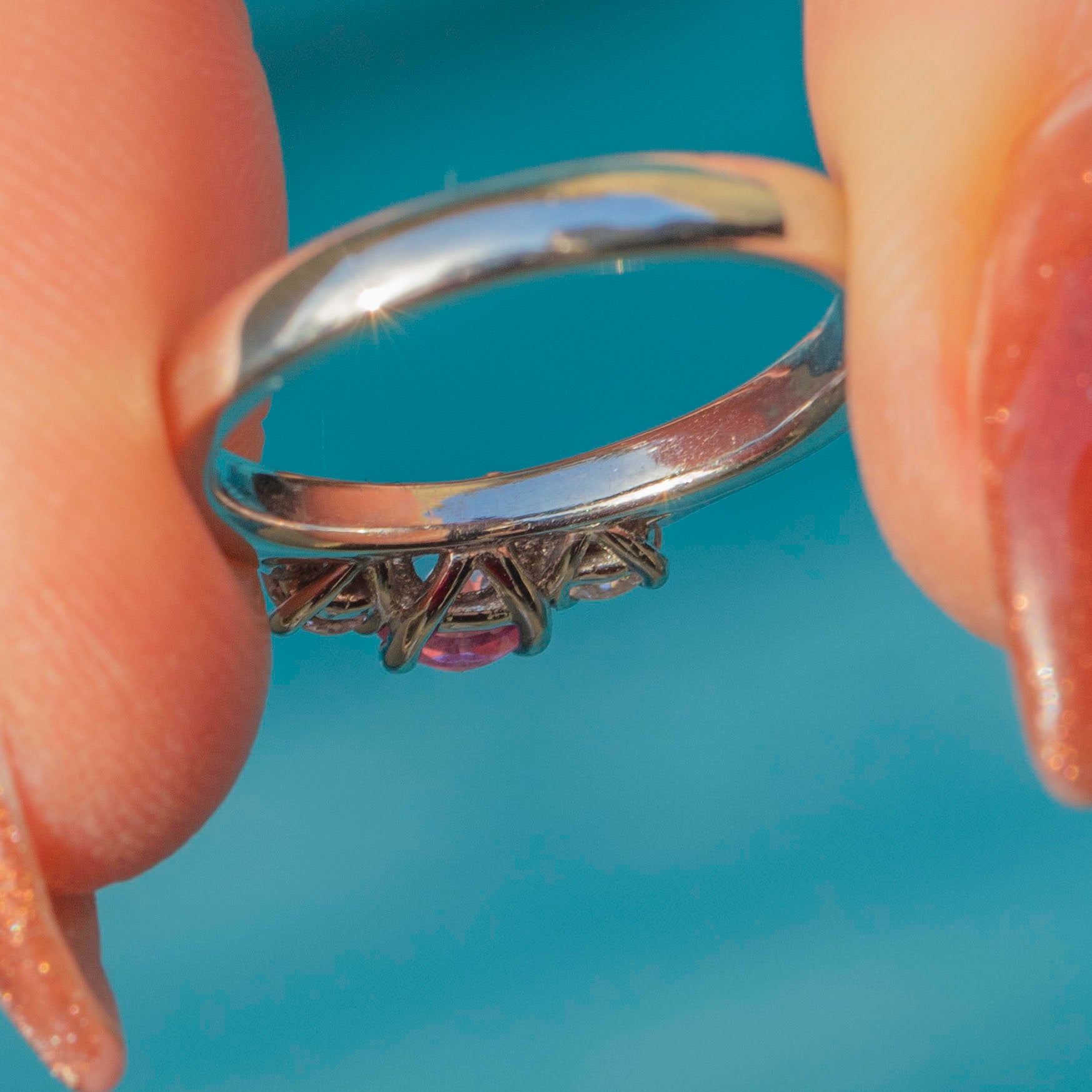 Platinum Pink Sapphire Diamond trilogy ring is in very good condition! The gemstones are completely free from any chips or fleabites, each one securely set within its Platinum settings. The Platinum is smooth and bright. The band has retained its rounded form, with only a small resize mark visible on the back. This is a robust and feminine ring, perfect for everyday wear!