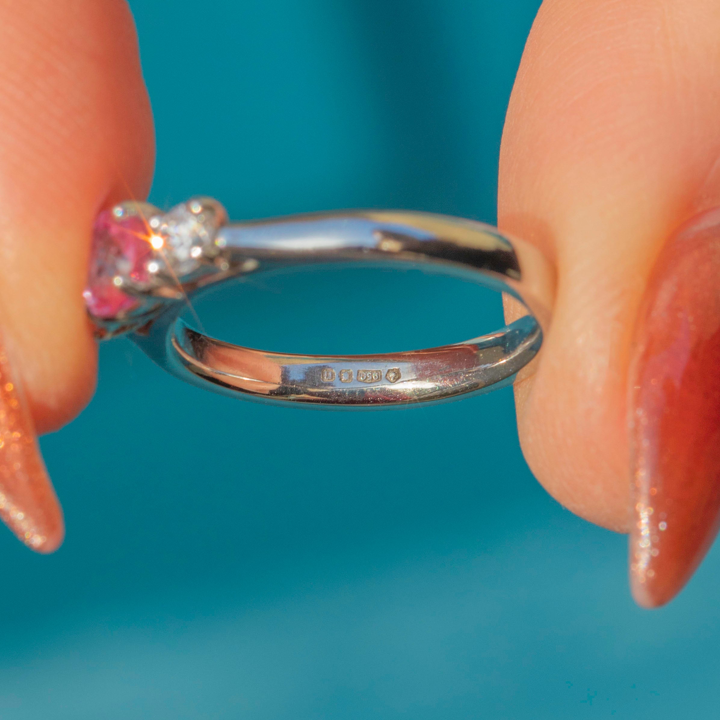 MATERIALS: Tests as Platinum, Pink Sapphire (0.35ct), Diamonds (0.20ct).