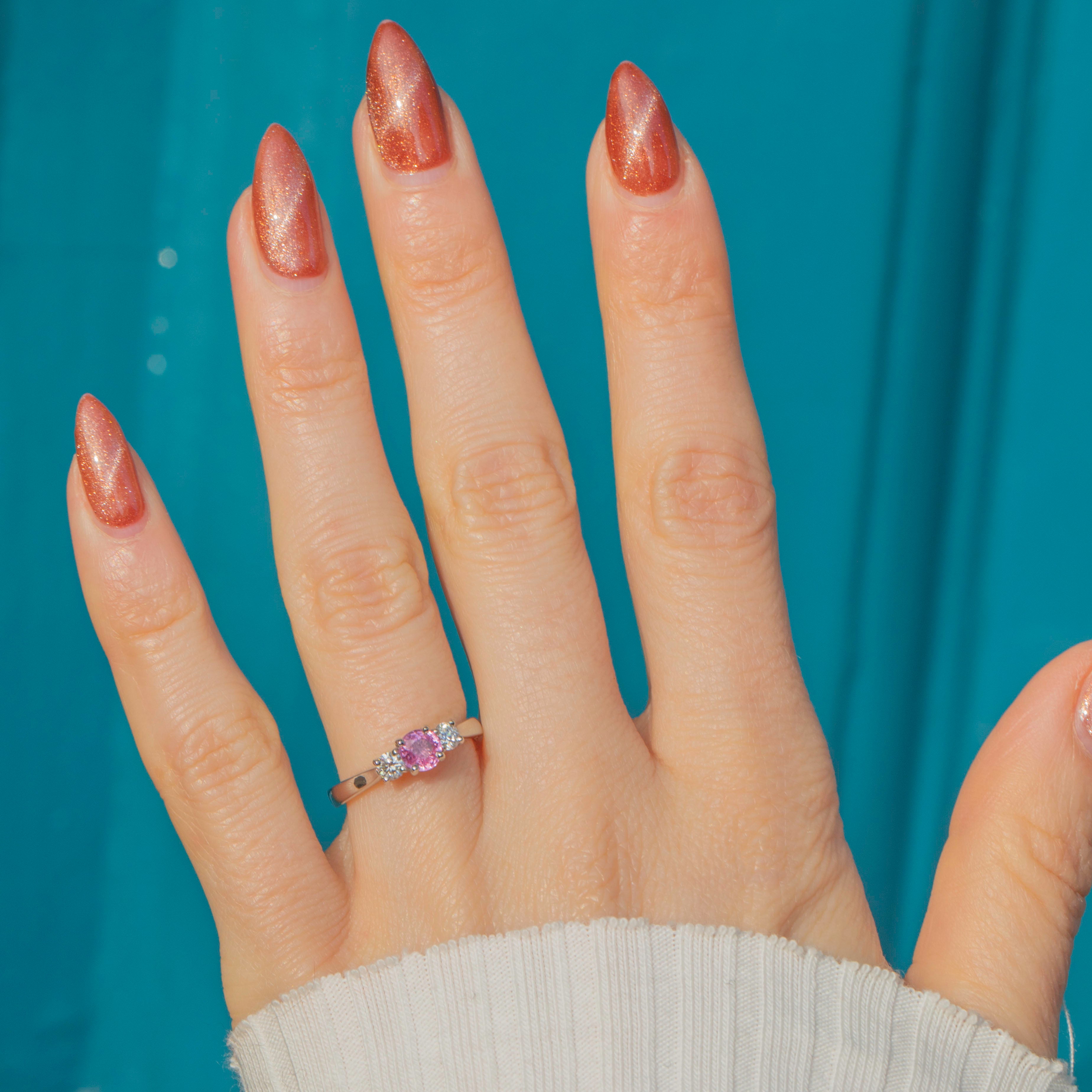 This Platinum Pink Sapphire Diamond trilogy ring is a stunning piece! As if plucked from a blossoming springtime field, this ring boasts a mesmerising 0.35ct pink Sapphire with a baby pink hue flanked by scintillating 0.10ct Diamonds.