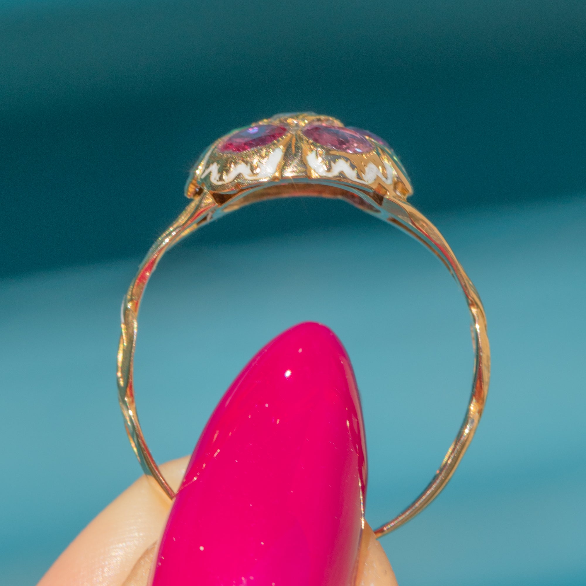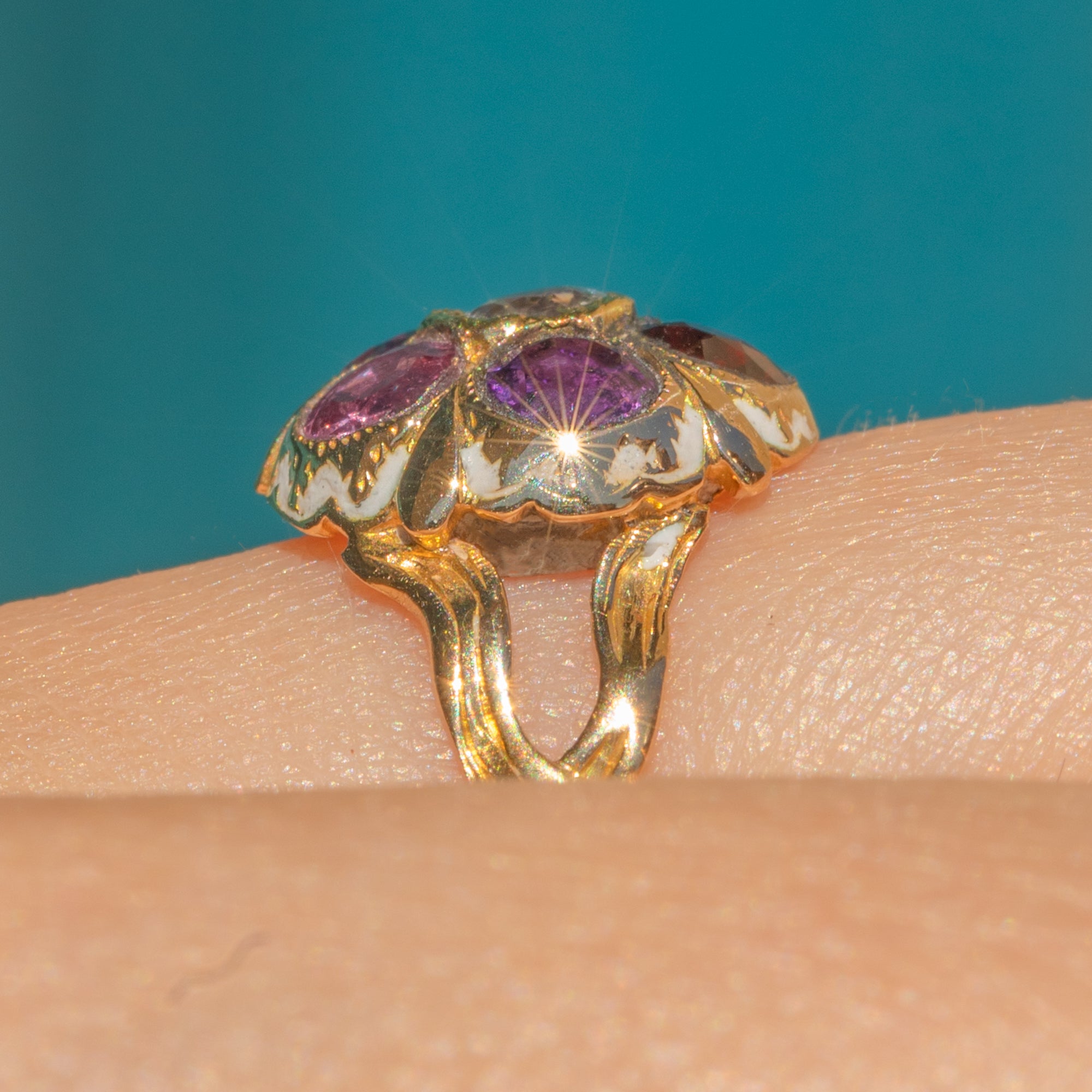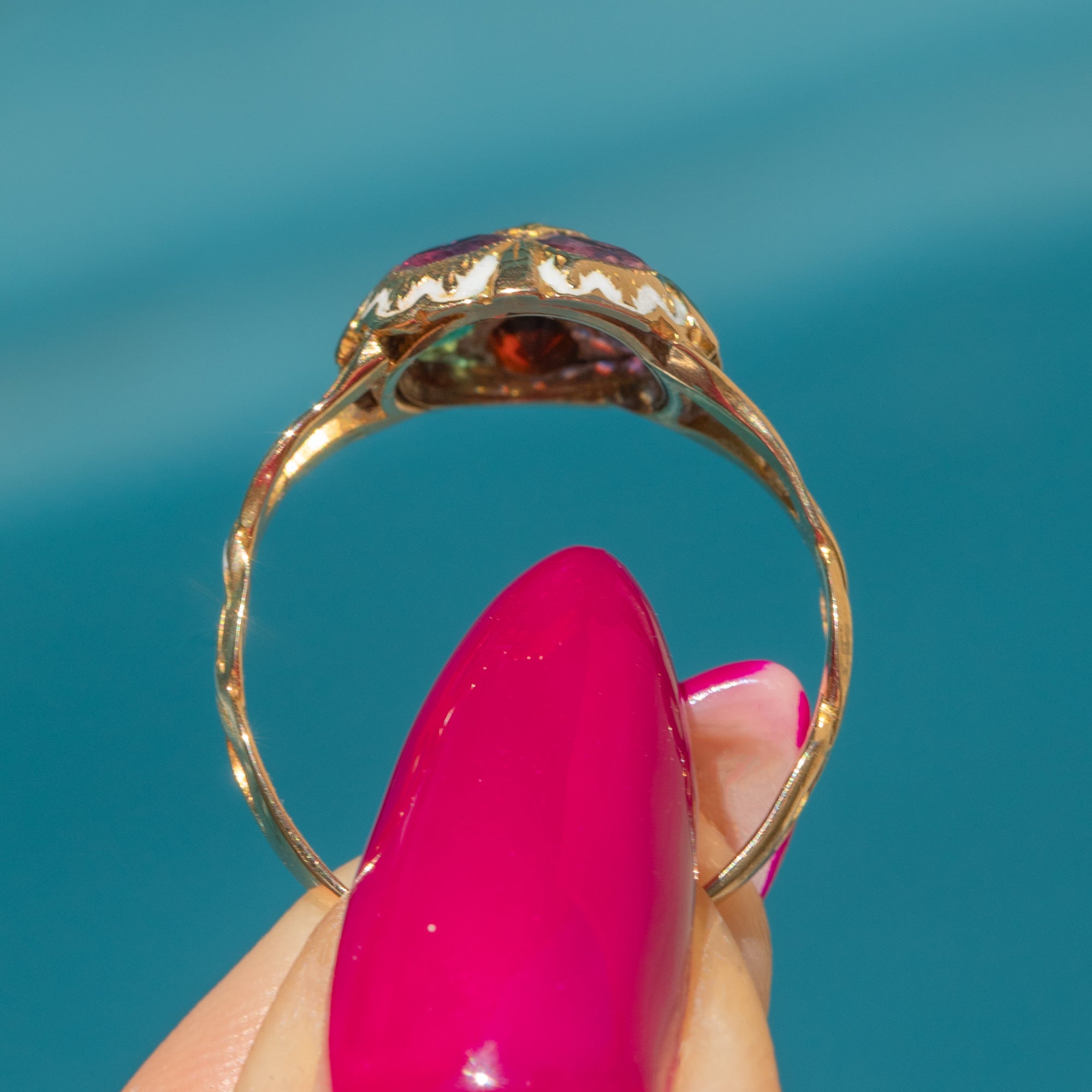 GOOD: The ring is in good condition, with some loss to the white Enamel visible upon close inspection. The 15ct Gold band remains sturdy, and although the ring band shows slight warping consistent with its age, it remains a beautiful and wearable piece. The Emerald, Garnet, Amethyst, Rubies, and Diamond are all securely set, though the stones show some surface wear consistent with age and gentle use. Despite this, they are still bright and beautiful, she will be enjoyed for generations to come!