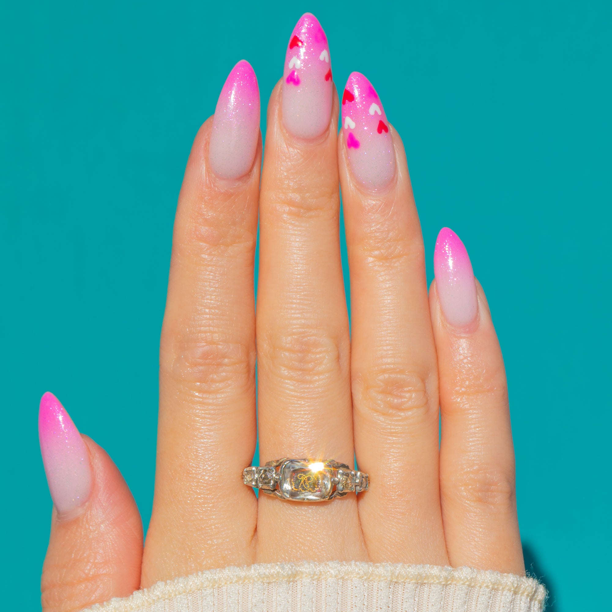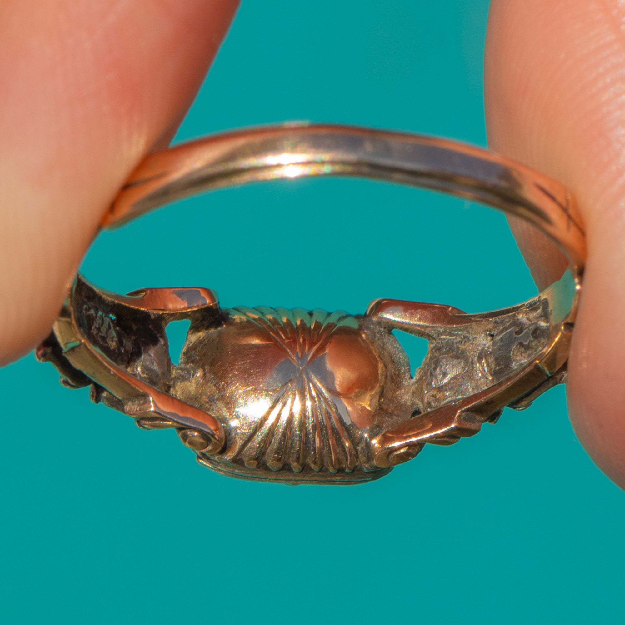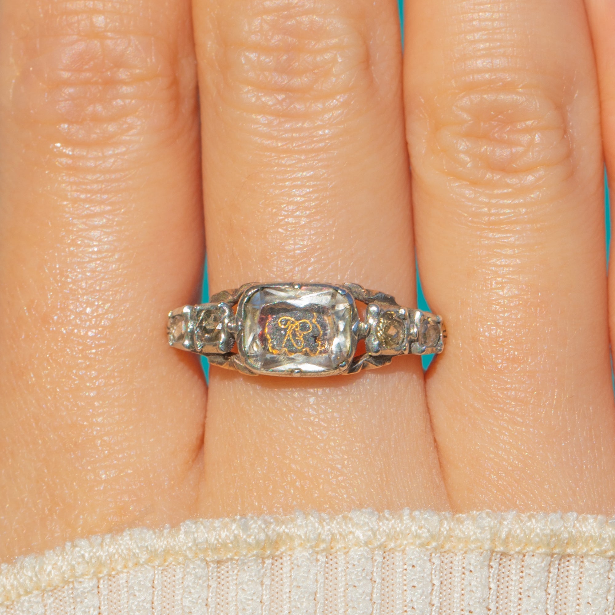The head is neatly collet-set with a pierced gallery and graceful foliate-engraved shoulders, all executed with the refined hand-finishing collectors love in antique sentimental jewels. Petite in scale yet brimming with character, this ring offers a rare glimpse into historic love tokens, ready to be treasured anew.