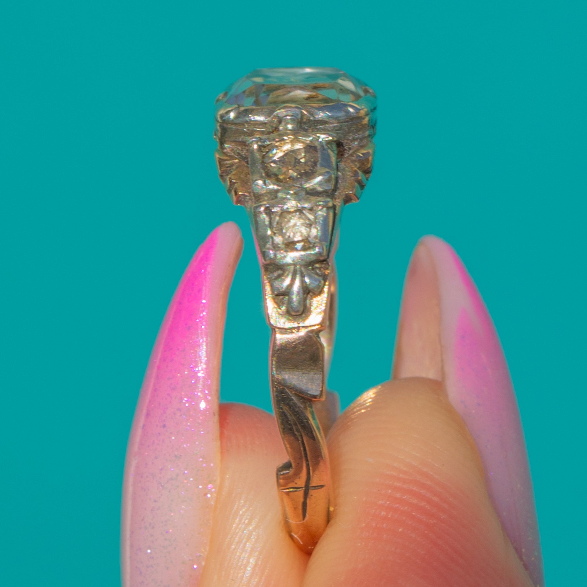 A captivating Georgian “Stuart crystal” ring, c.1780, crafted in 15ct Gold with charming Silver settings. At its heart lies a clear Rock Crystal tablet backed by pink foil for a soft, romantic glow, flanked by petite old-cut Diamond accents that lend a delicate sparkle. The two-tone palette of Silver and Gold brings beautiful contrast and period allure.