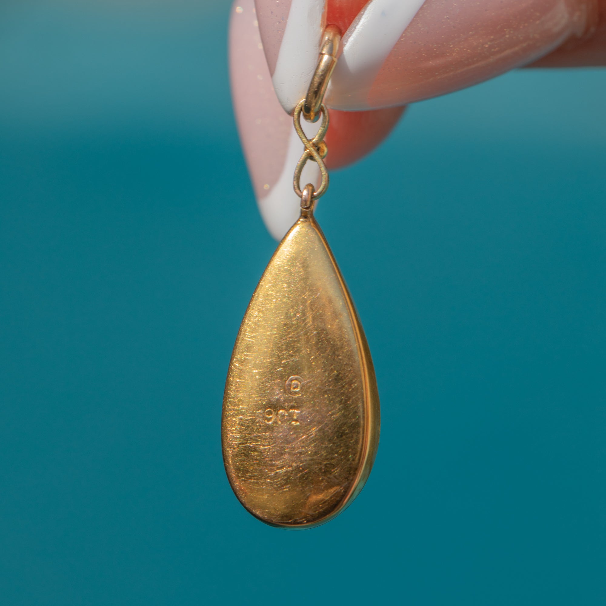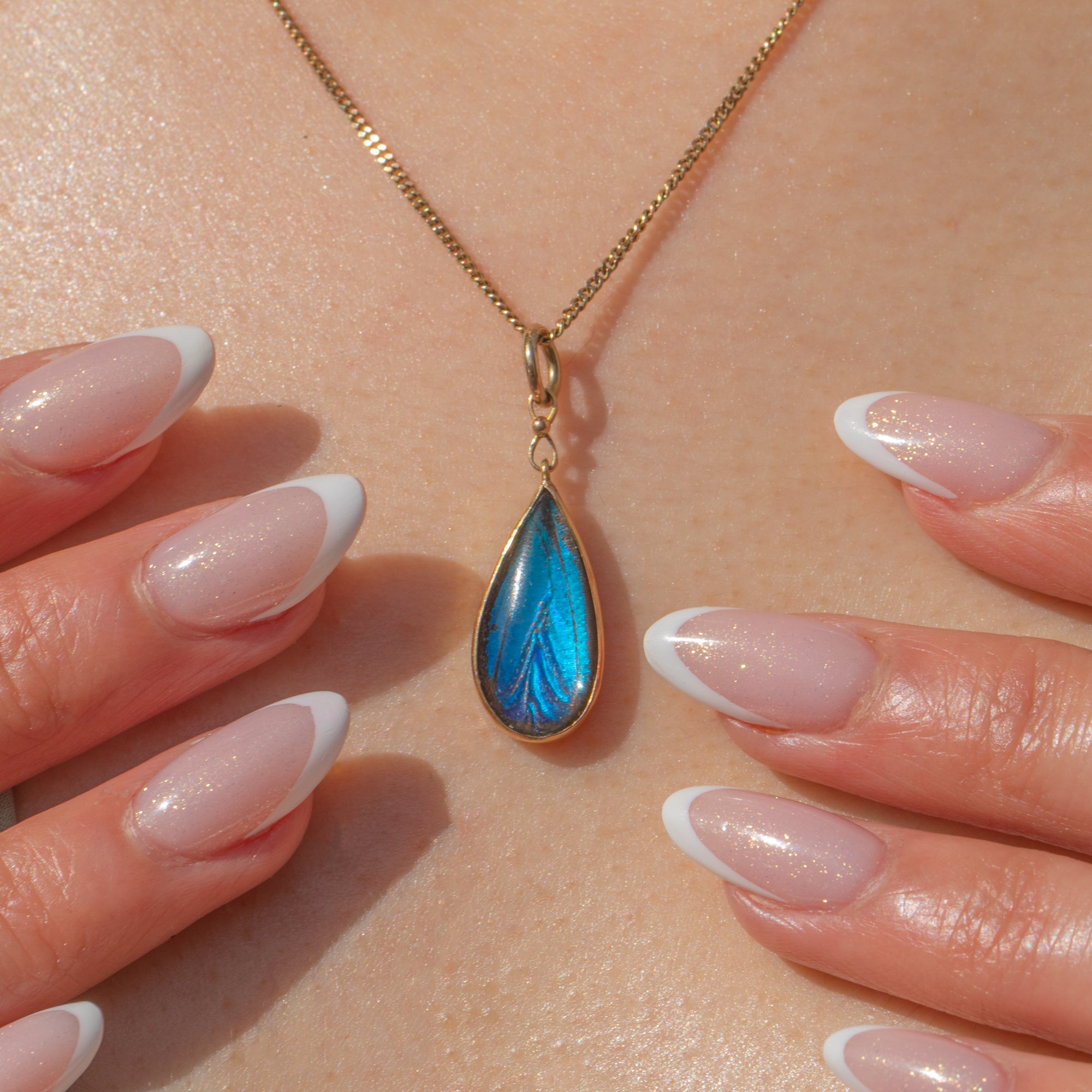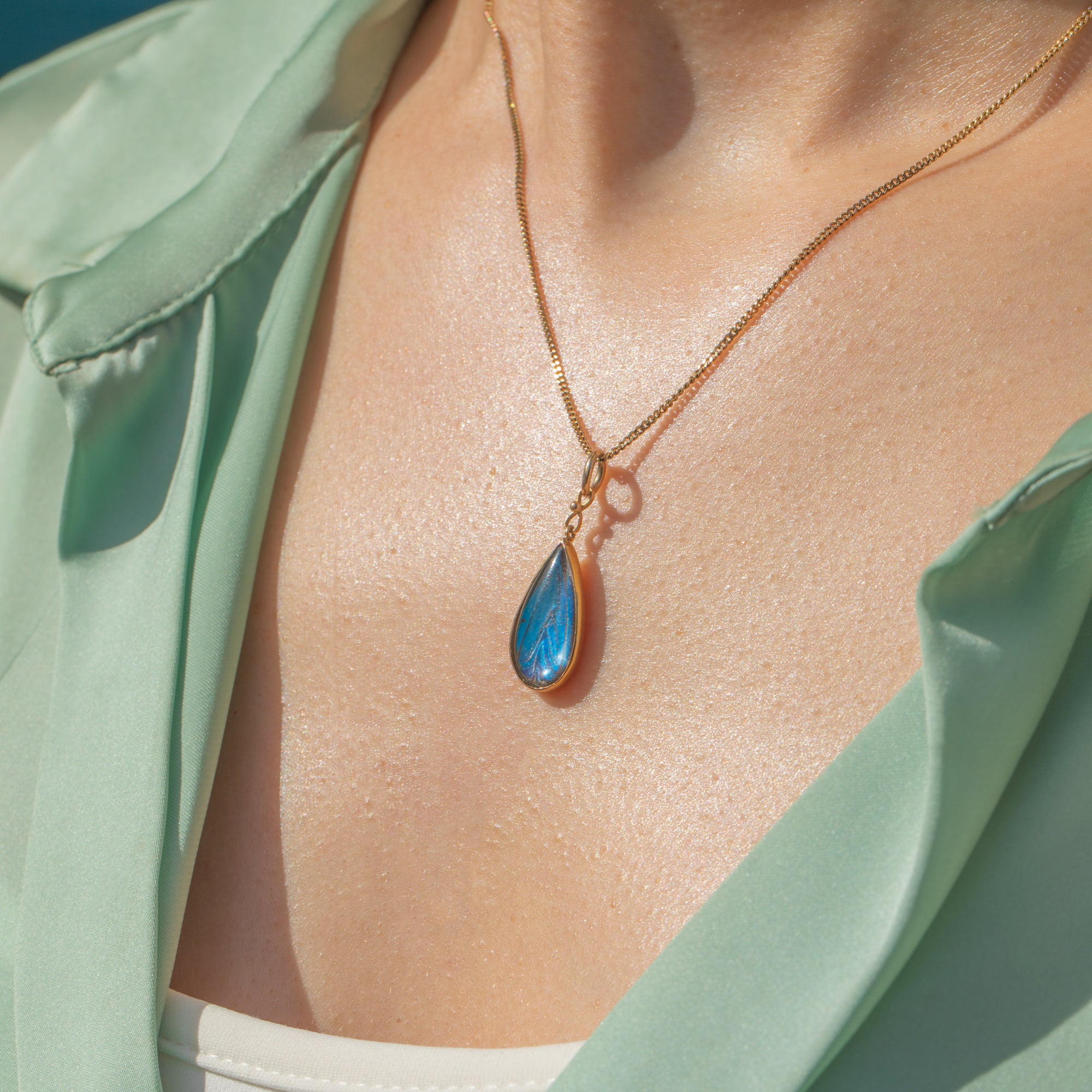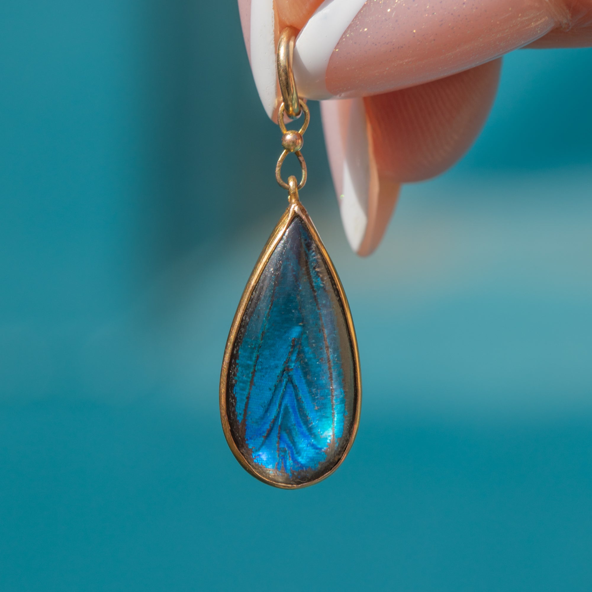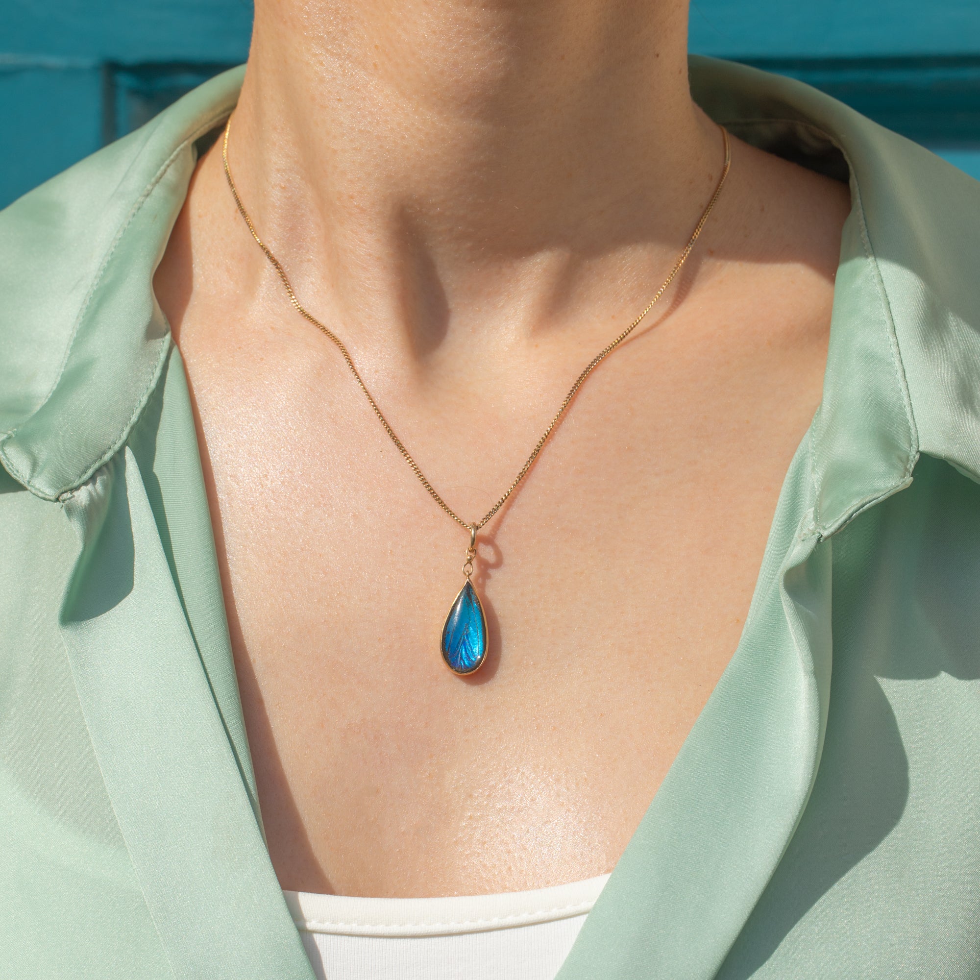 The iridescent wing is encased in a buttery 9ct Gold bezel setting in an elegant teardrop shape. The vibrance of this antique butterfly wing pendant will ensure that you stand out from the crowd when it's adoring your décolletage!