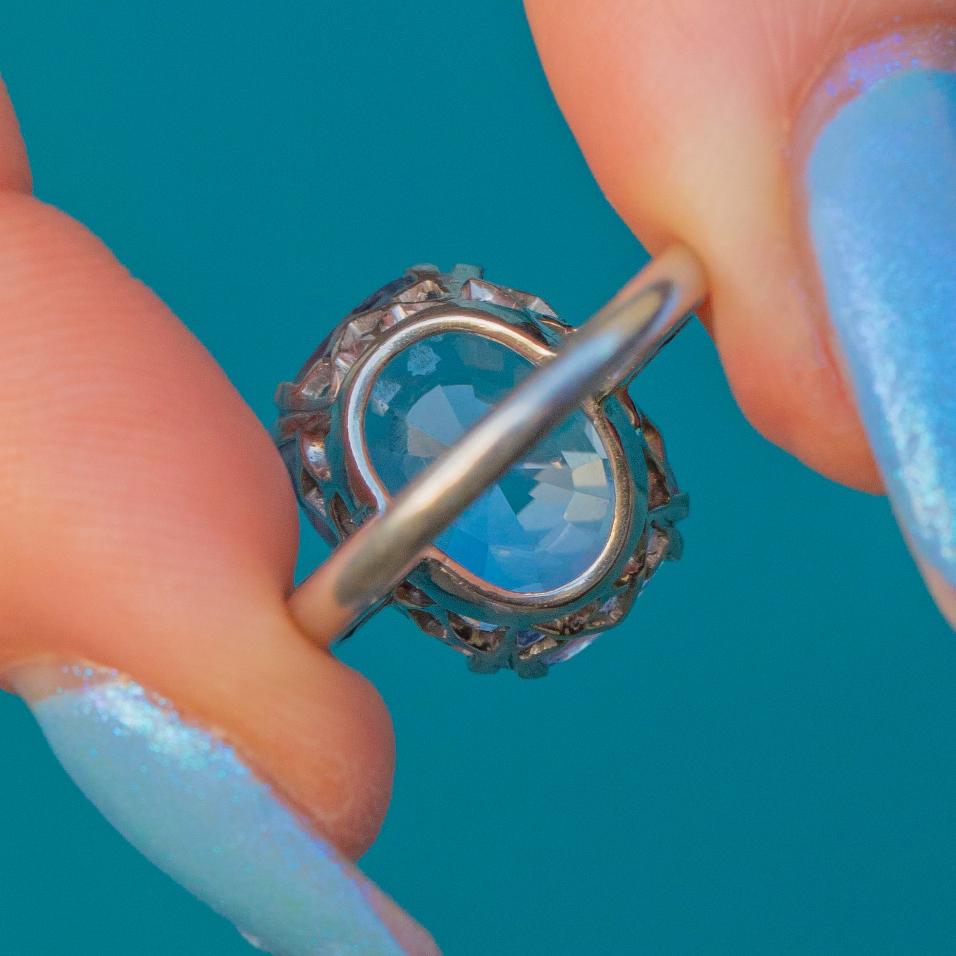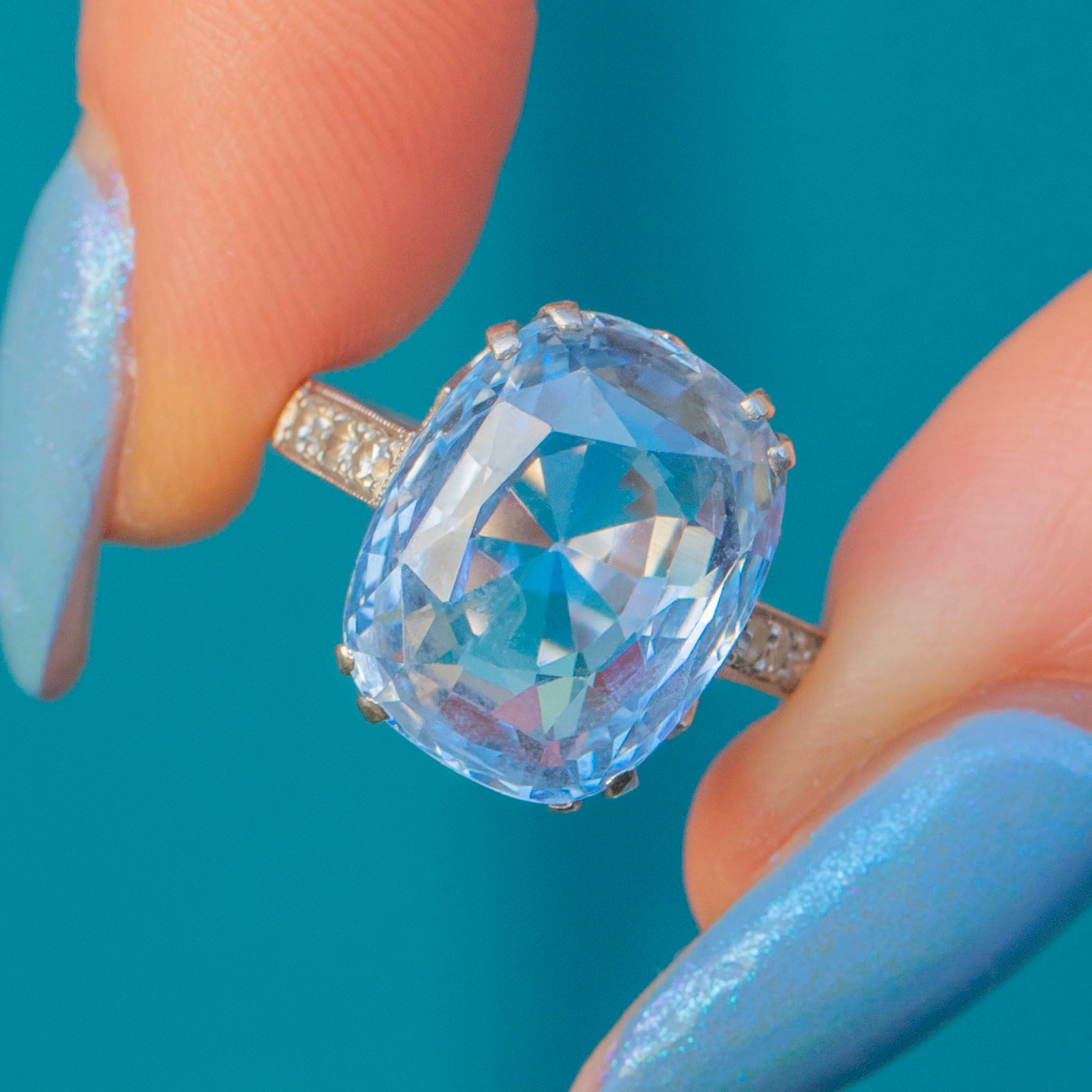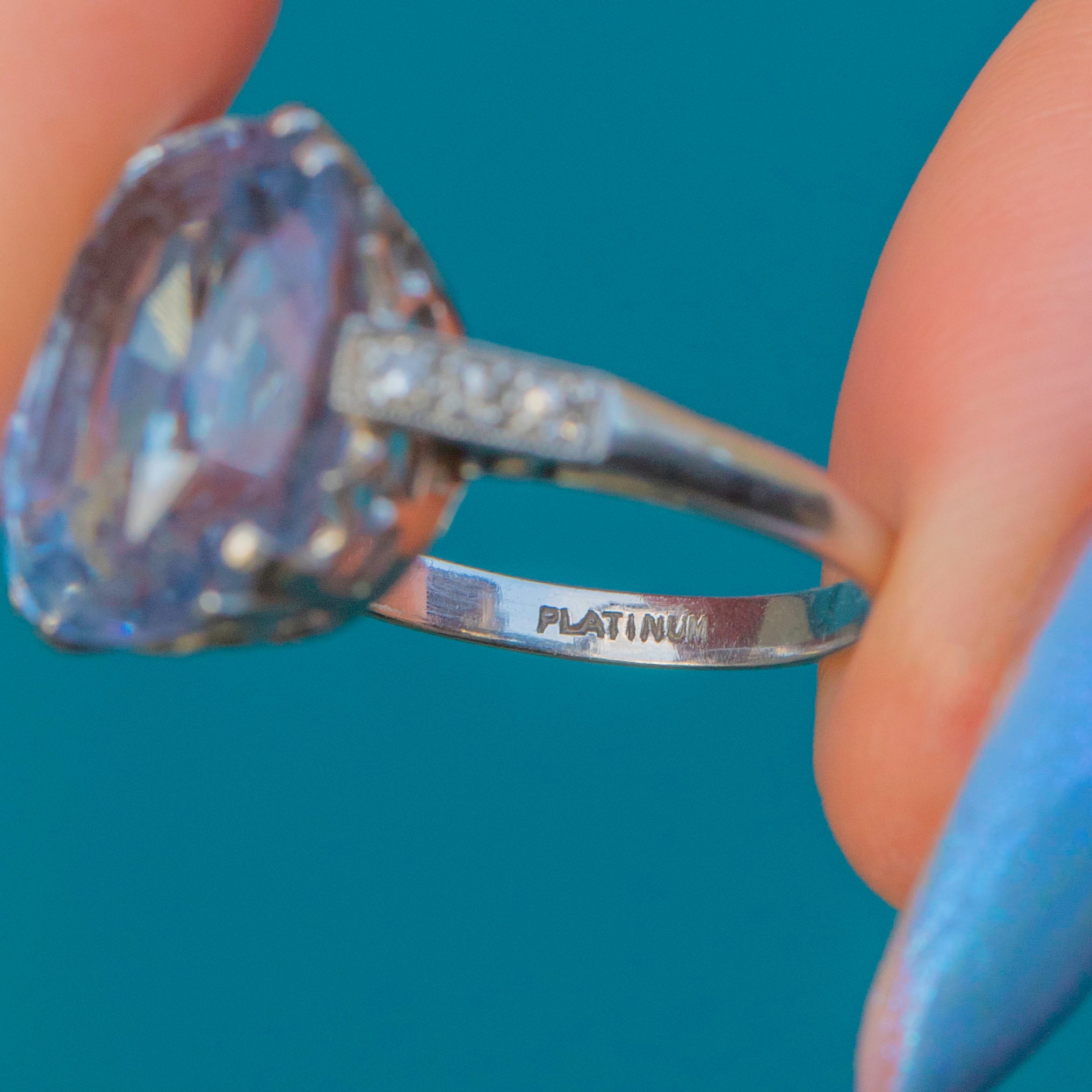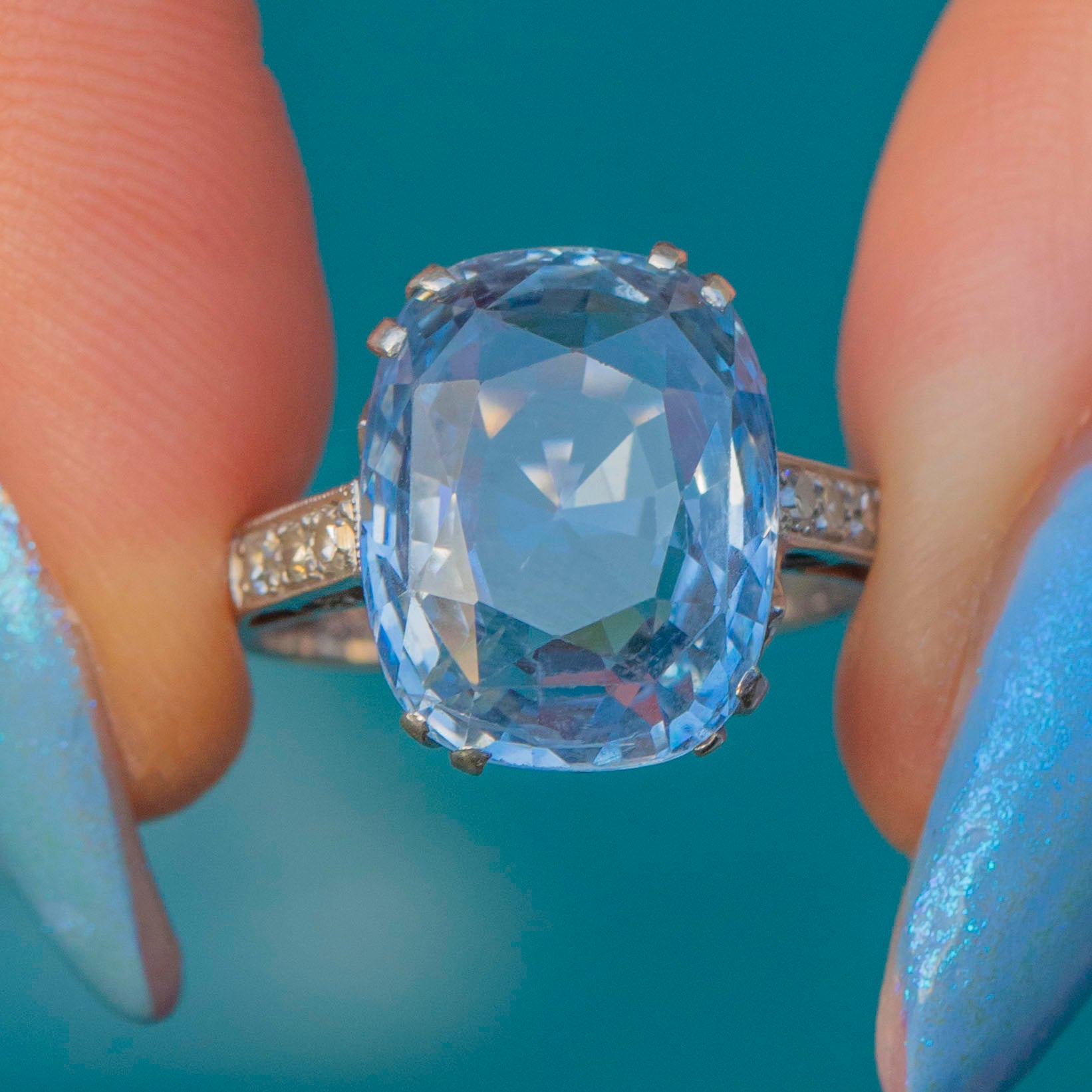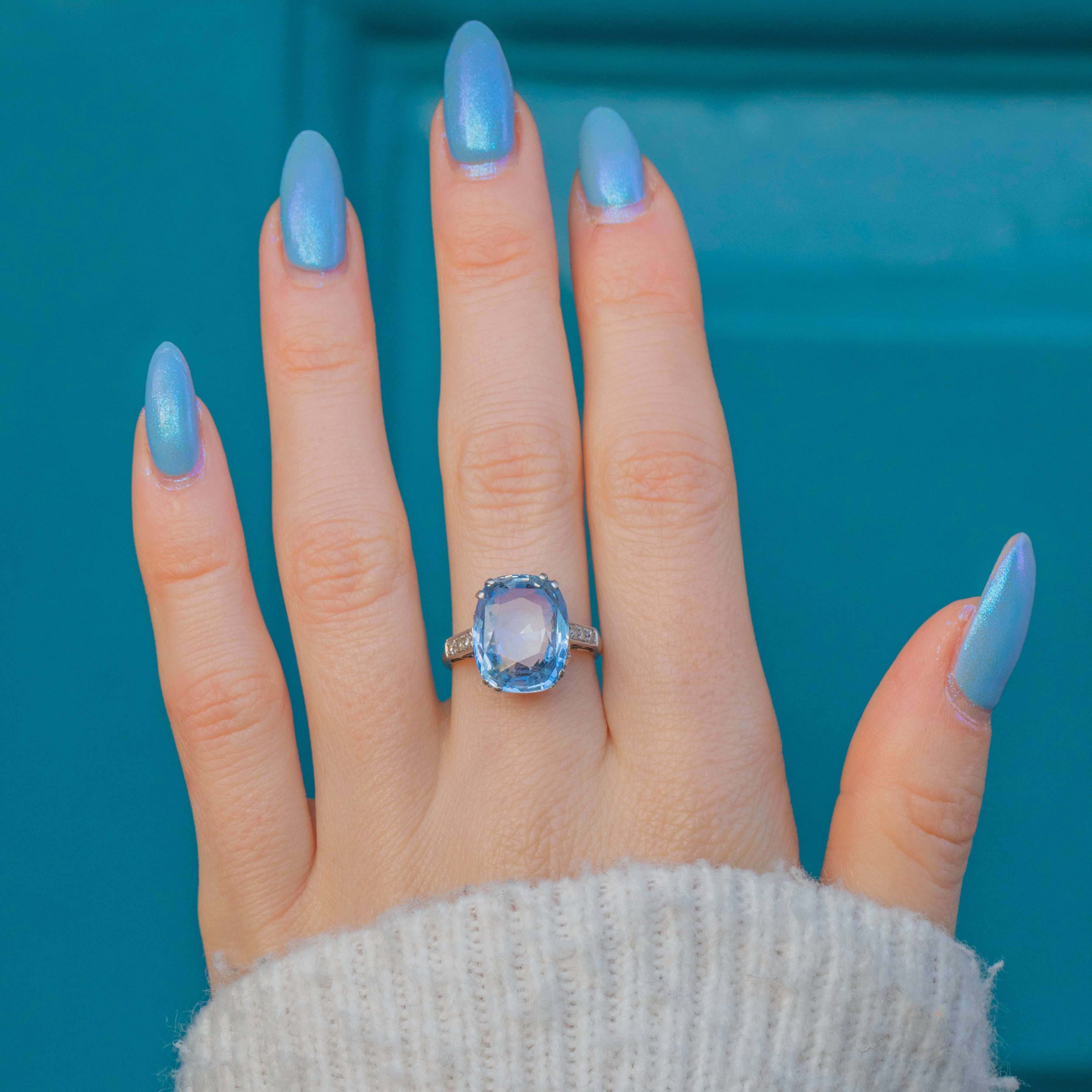 EXCELLENT. This Rare Art Deco Platinum cornflower Blue Natural Sapphire Diamond ring is in excellent condition, with the Platinum showing minimal wear and retaining her intricate detailing. The 8.00ct Sapphire is vibrant and free from noticeable scratches or chips. Likewise, all Diamonds are securely set, sparkling brilliantly without any damage. There is some evidence of resizing in the past but this is hardly noticable unless under close inspection. She's a delightful one!