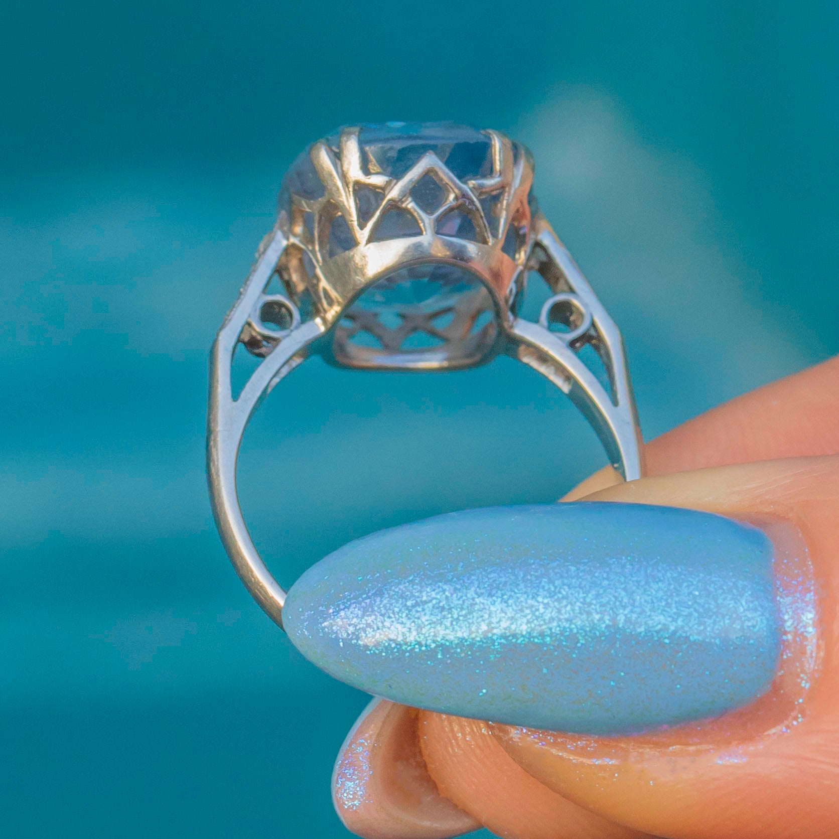 This exquisite rare Art Deco Platinum cornflower Blue Natural Sapphire Diamond ring features a whopping 8.00ct natural cornflower blue Sapphire, her delicate light sky-blue hue radiating an ethereal beauty. The Sapphire is set within stylistic double claws and held proudly from the finger in a decorative openwork basket that allows the light to beam through from every angle.