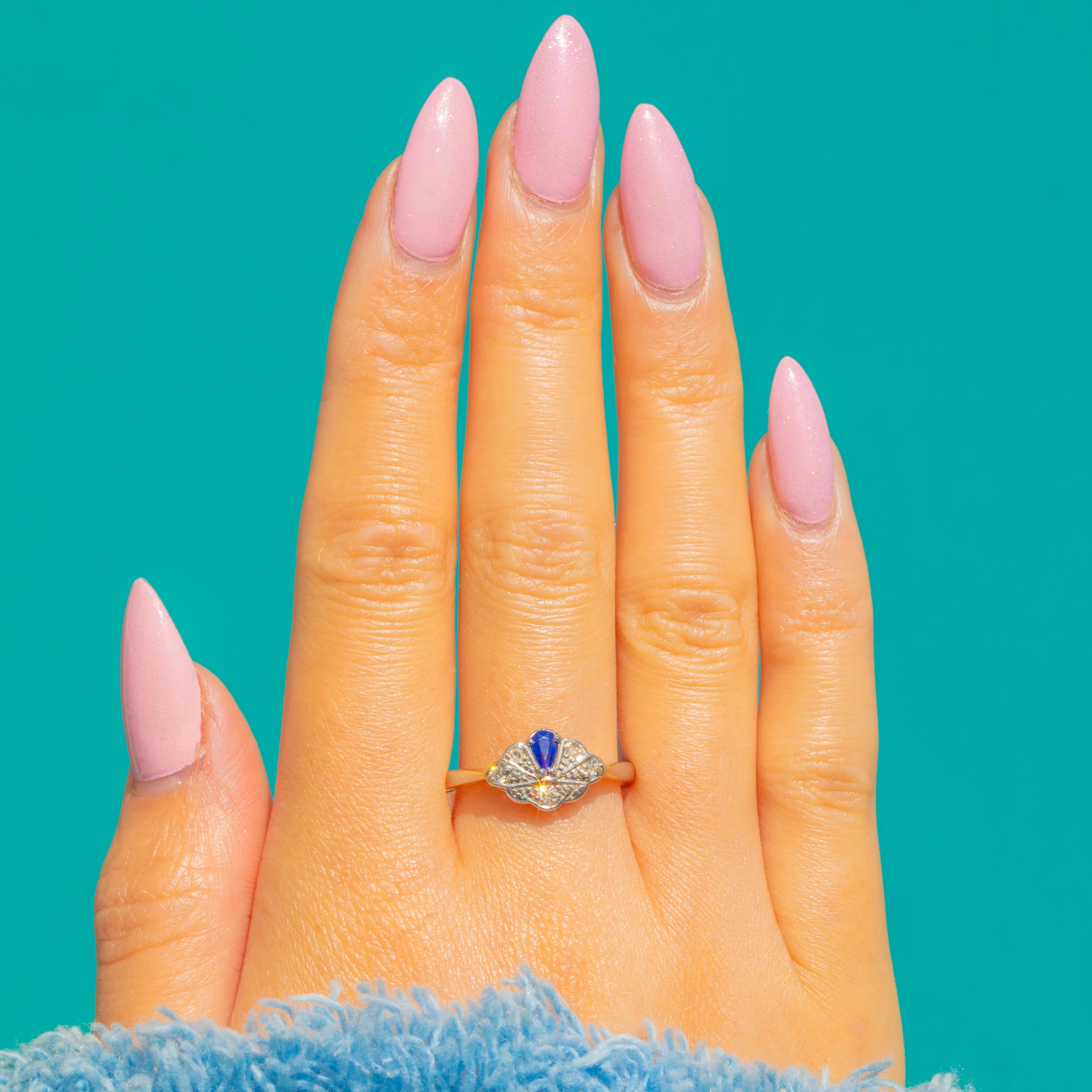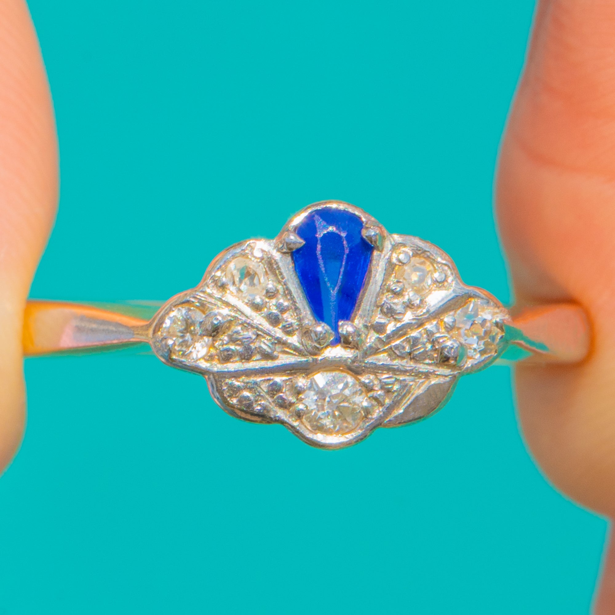 A rare and elegant Art Deco fan ring, crowned with a deep blue, natural pear-shaped Sapphire and framed by a scalloped halo of sparkling Diamonds. The refined two-tone palette pairs a Platinum-topped head with delicate milgrain and bead settings over a buttery 18ct Gold shank for that quintessential 1920s contrast.