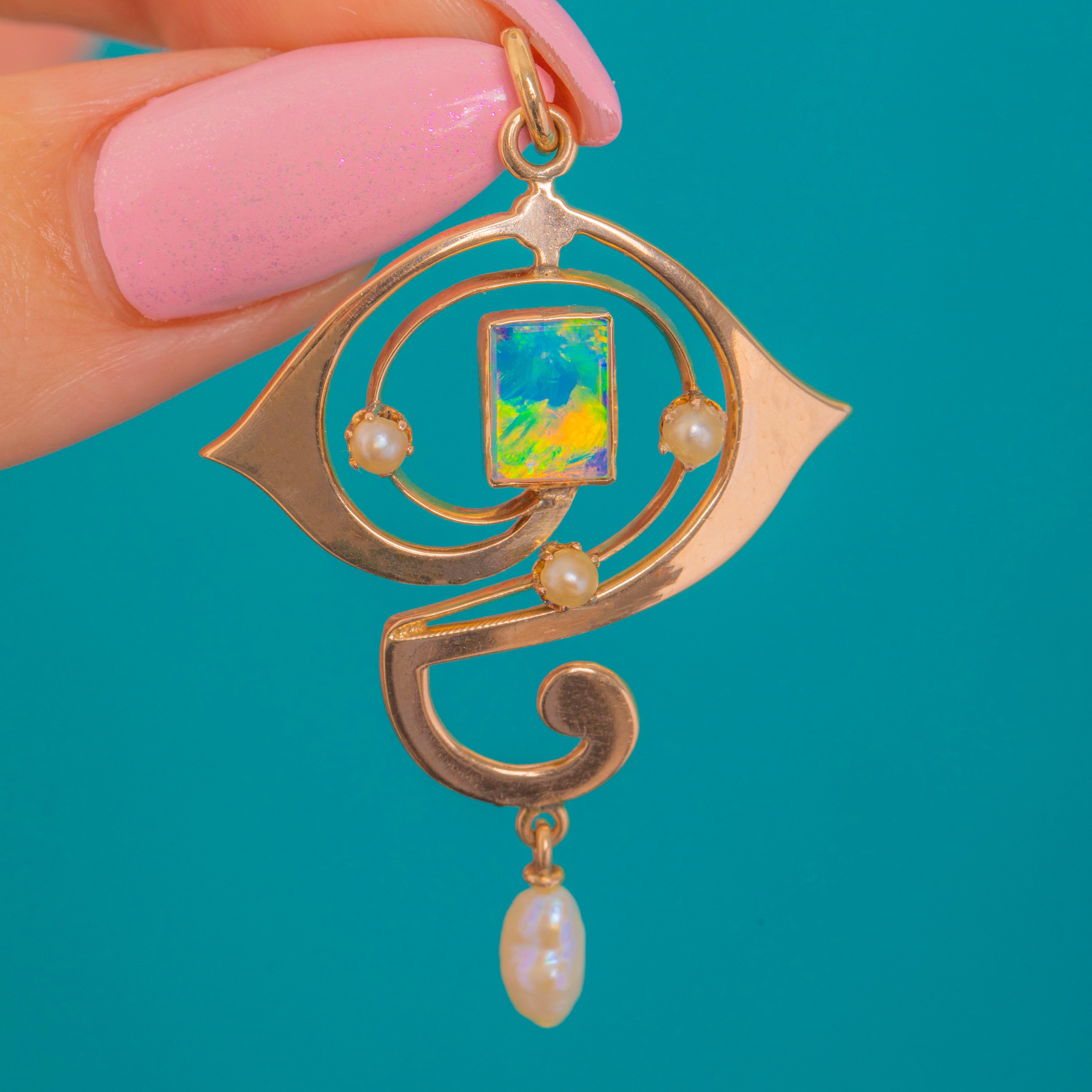 Sensuous scrolls and a poetic “question‑mark” silhouette make this Art Nouveau pendant a little work of wearable art. Crafted in 9ct Gold, its openwork curves frame a rectangular Opal cabochon that shimmers with blue‑green fire and golden flashes. Three petite Pearls accent the sweep, while a baroque Pearl drop lends graceful movement with every step.
