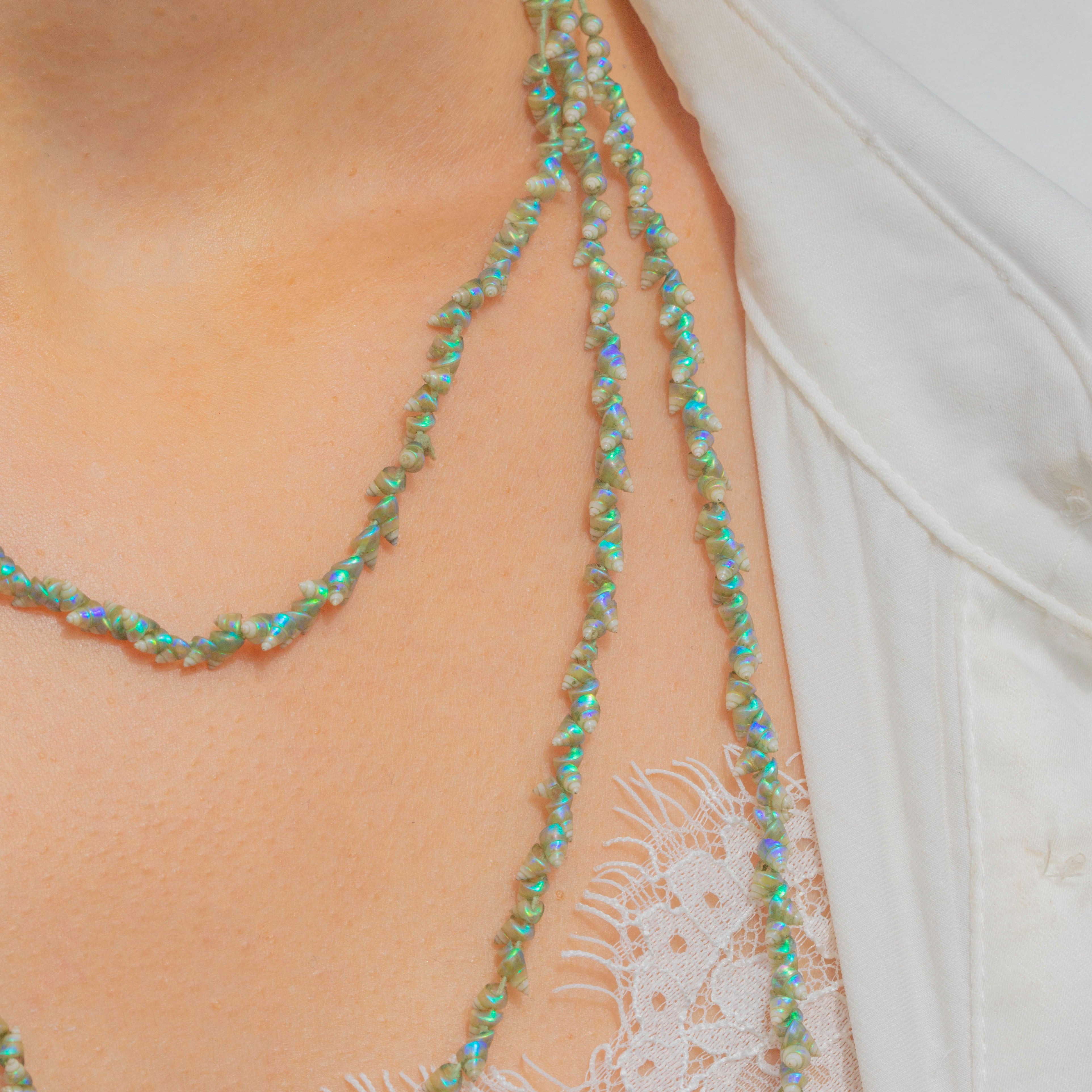 Handcrafted by Aboriginal women on the shores of Tasmania over a century ago, this Victorian maireener shell necklace is a rare treasure! The dainty shells shimmer with blues and greens, their enchanting iridescent hues shifting in the light.