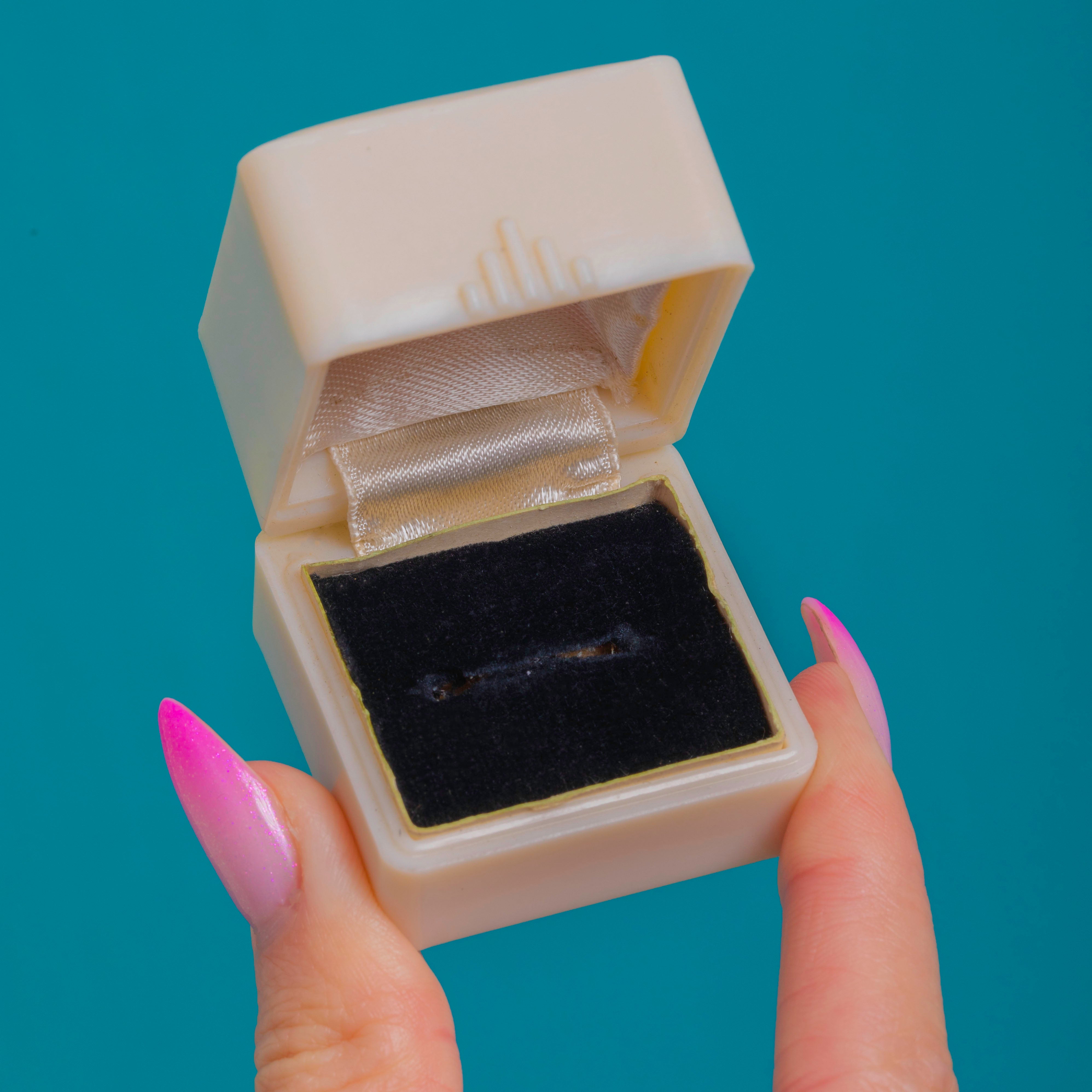 The satin lid is printed “Est 1856 T H Baker & Co Jewellers” with branch locations, while the base is stamped “MADE IN ENGLAND”. Petite yet distinctive, it’s an elegant way to present or store a treasured ring and a delightful collectible in its own right.