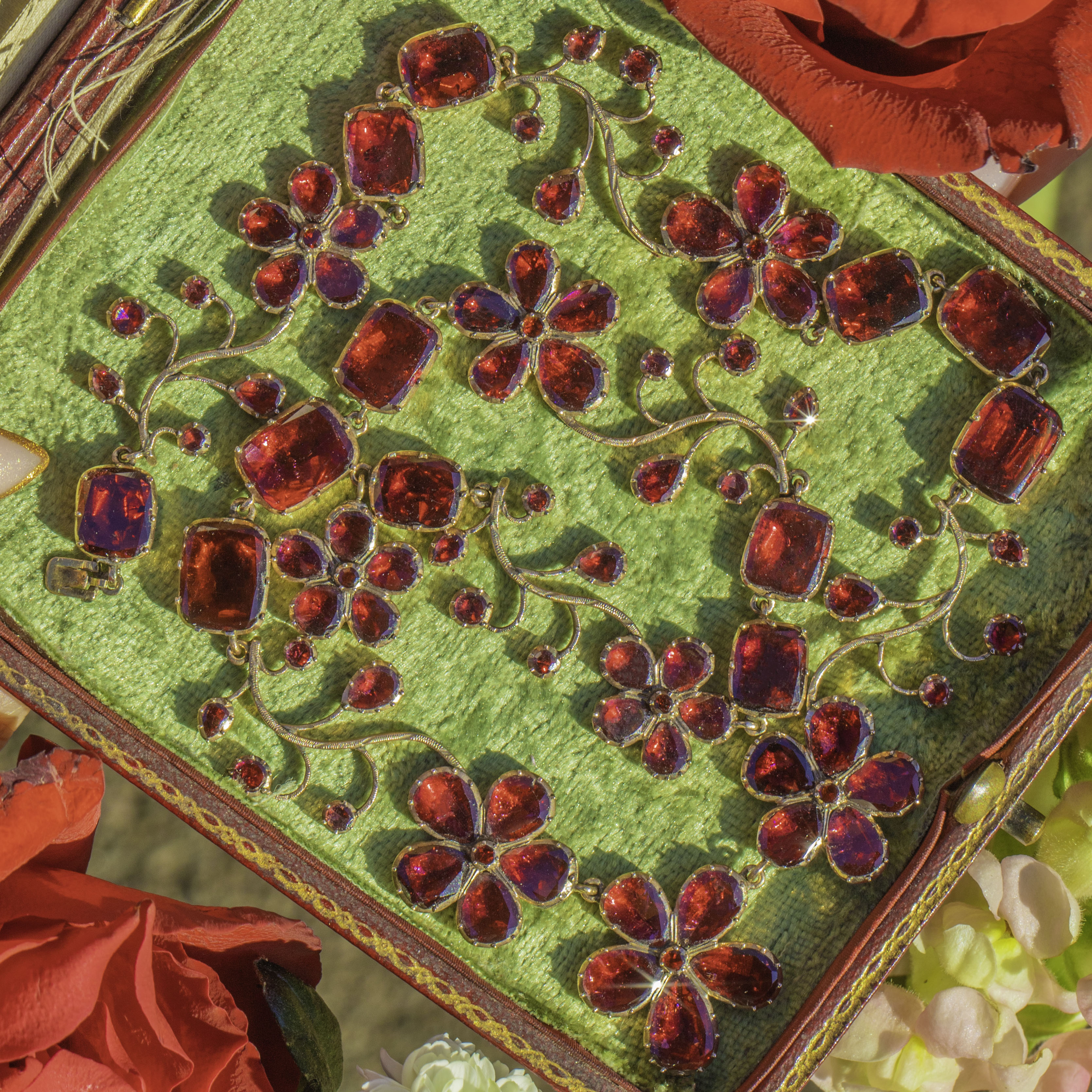 A once-in-a-lifetime Georgian foiled Garnet pansy necklace, crafted circa 1820 and preserved in astonishing condition. This is the kind of jewel collectors dream of, elegant, complete, richly coloured, and utterly evocative of the early 19th century.
