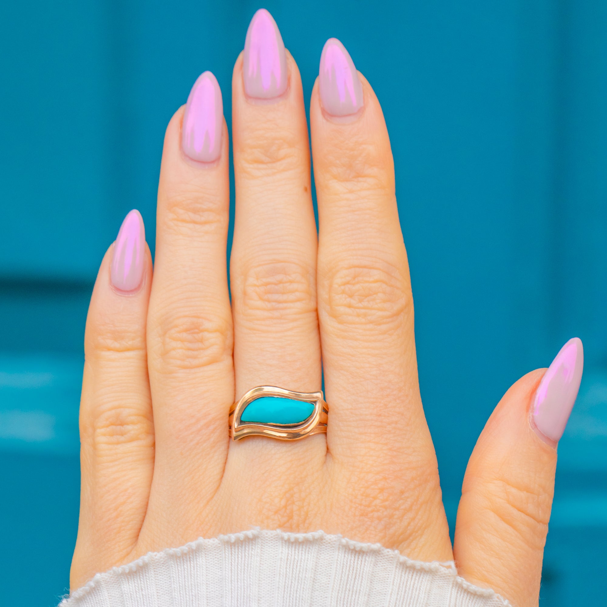A touching are rare piece of Georgian history, this memorial ring is crafted in warm 12ct Gold and set with a beautiful curved eye-shaped Turquoise tablet. The vibrant sky-blue stone is bezel-set within an elegant, sculpted mount that curves smoothly around the finger.
