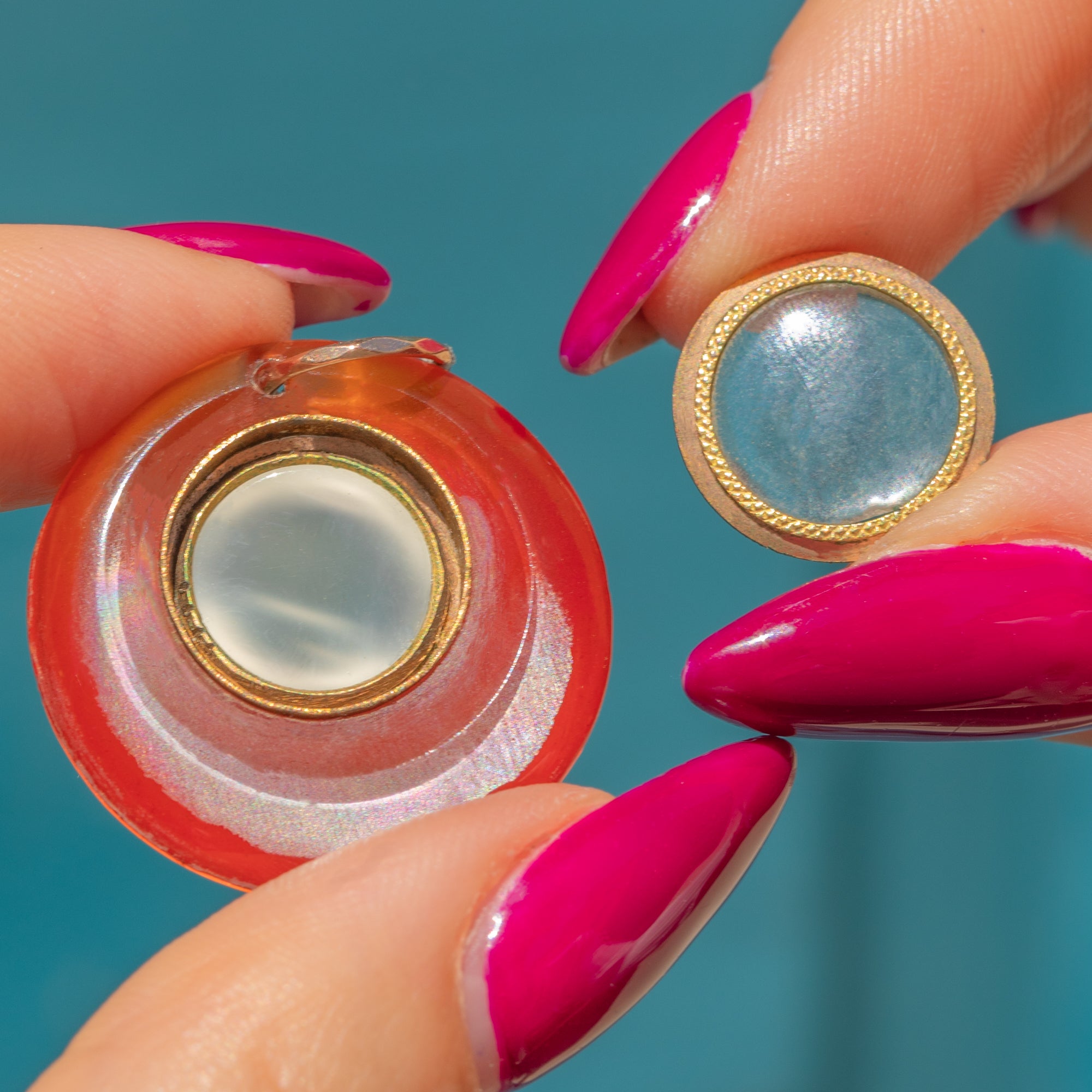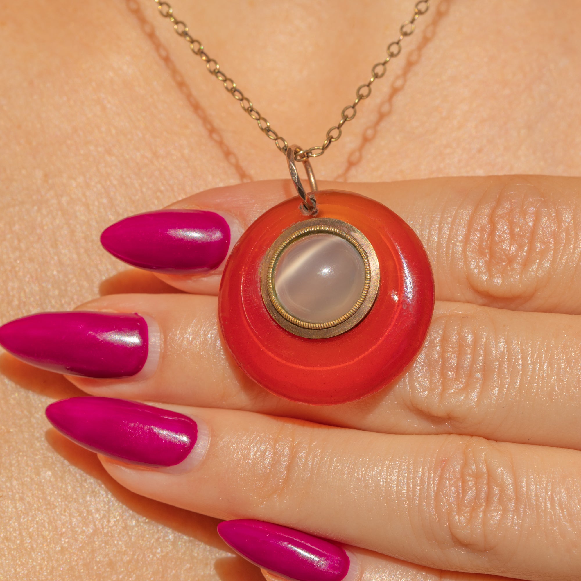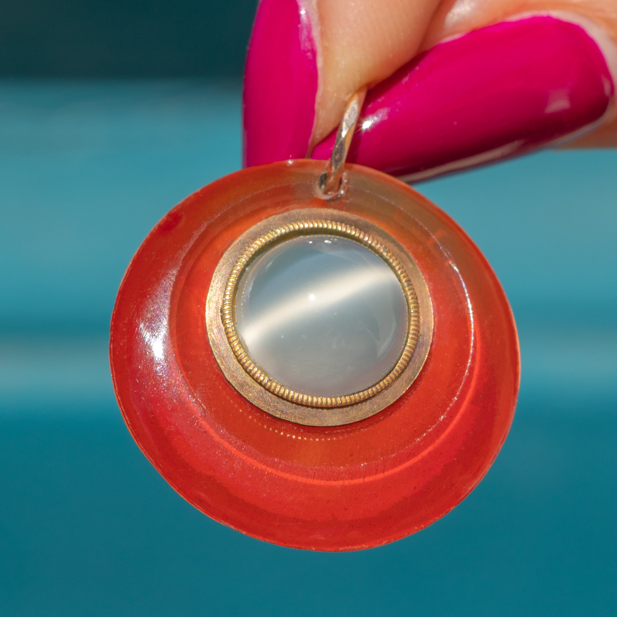 MATERIALS: Tests as 9ct Gold, Moonstone cabochon front, Rock Crystal glazed back. Hand-carved Carnelian border.