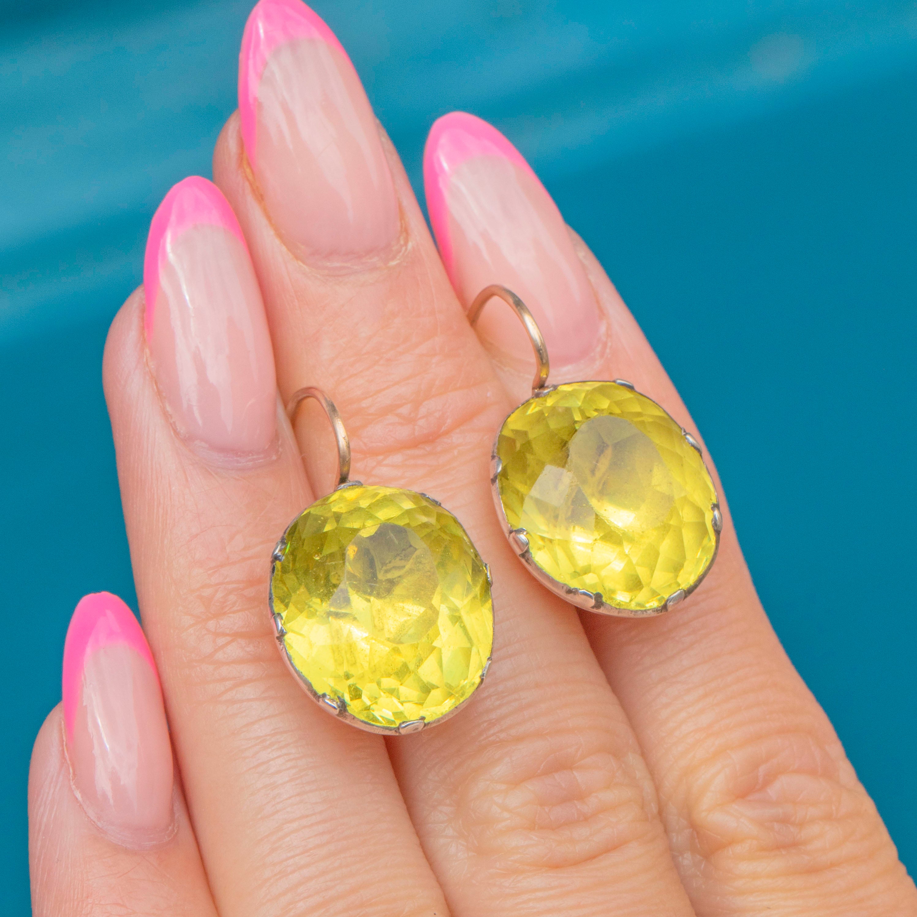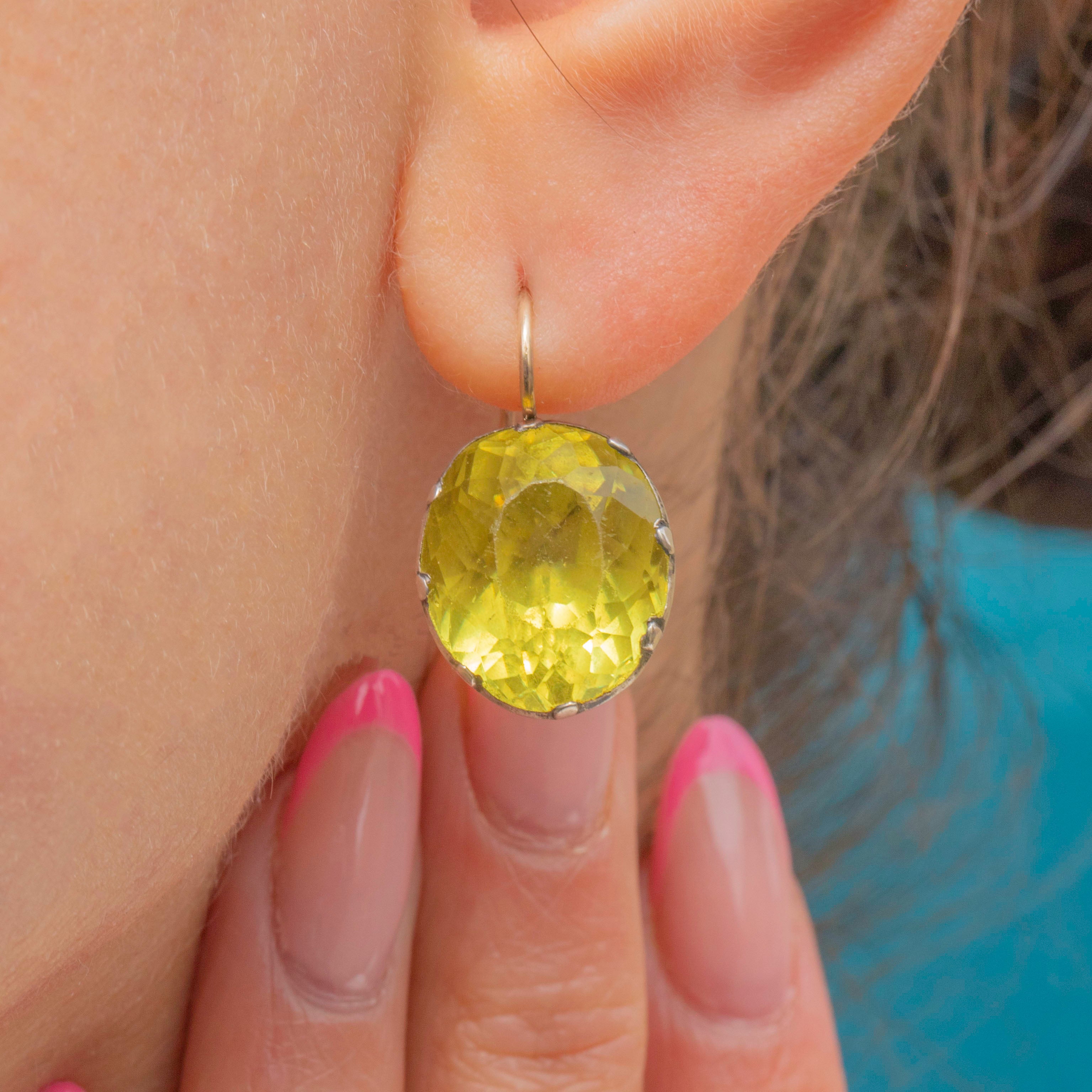 VERY GOOD: These rare Georgian Chartreuse green Paste button earrings are in very good condition. The Paste are brightly saturated and their foils show no signs of wear. Each Paste has been expertly faceted, and although there are some mild abrasions to some of the facets, these are only noticeable under close inspection and do not impact their sparkle. The Silver is lustrous, with only some minor spots of discoloration and dings commensurate with age, and each Paste is securely held in place. The Gold hooks are slender and firmly soldered, allowing you to show off these phenomenal antique Paste earrings with absolute confidence!