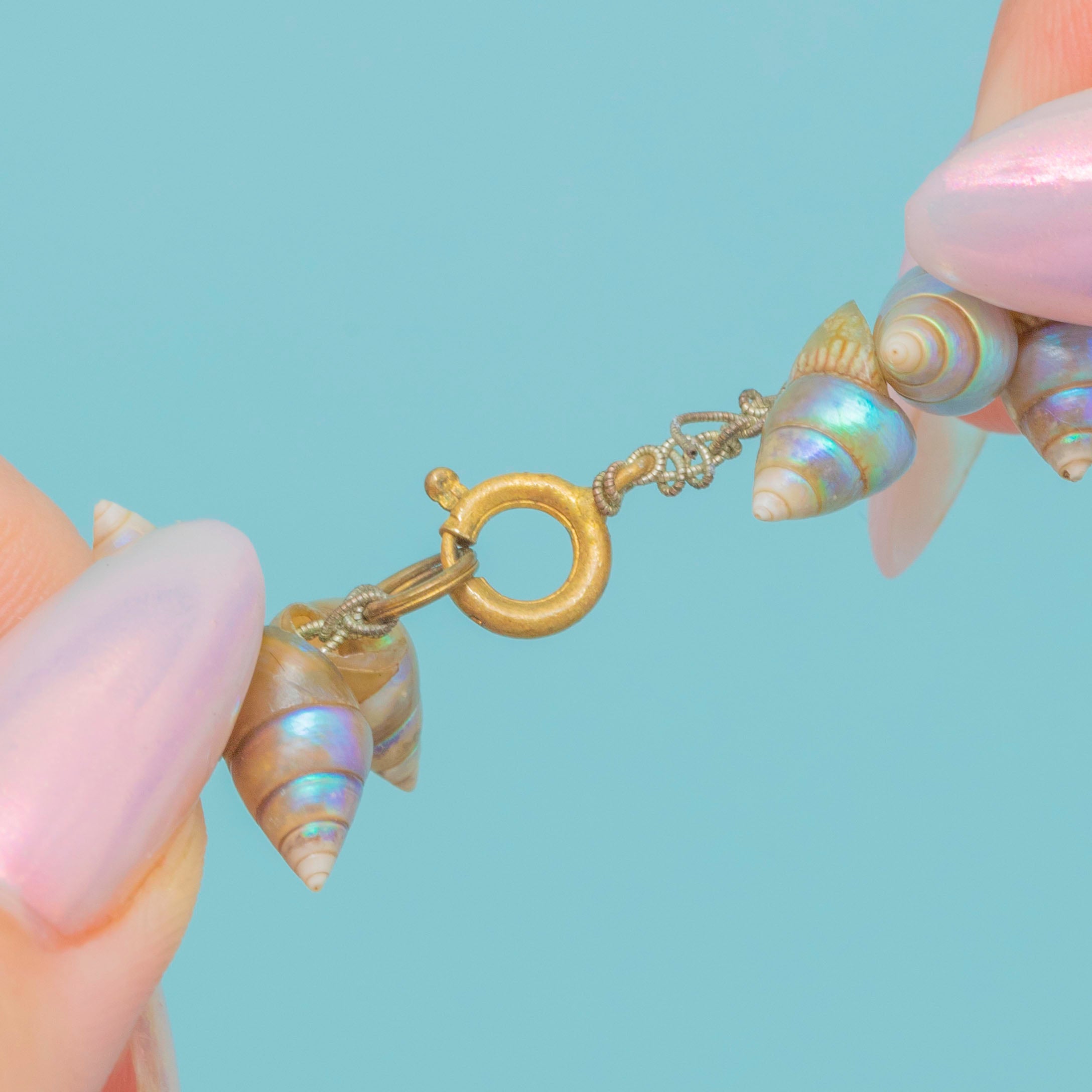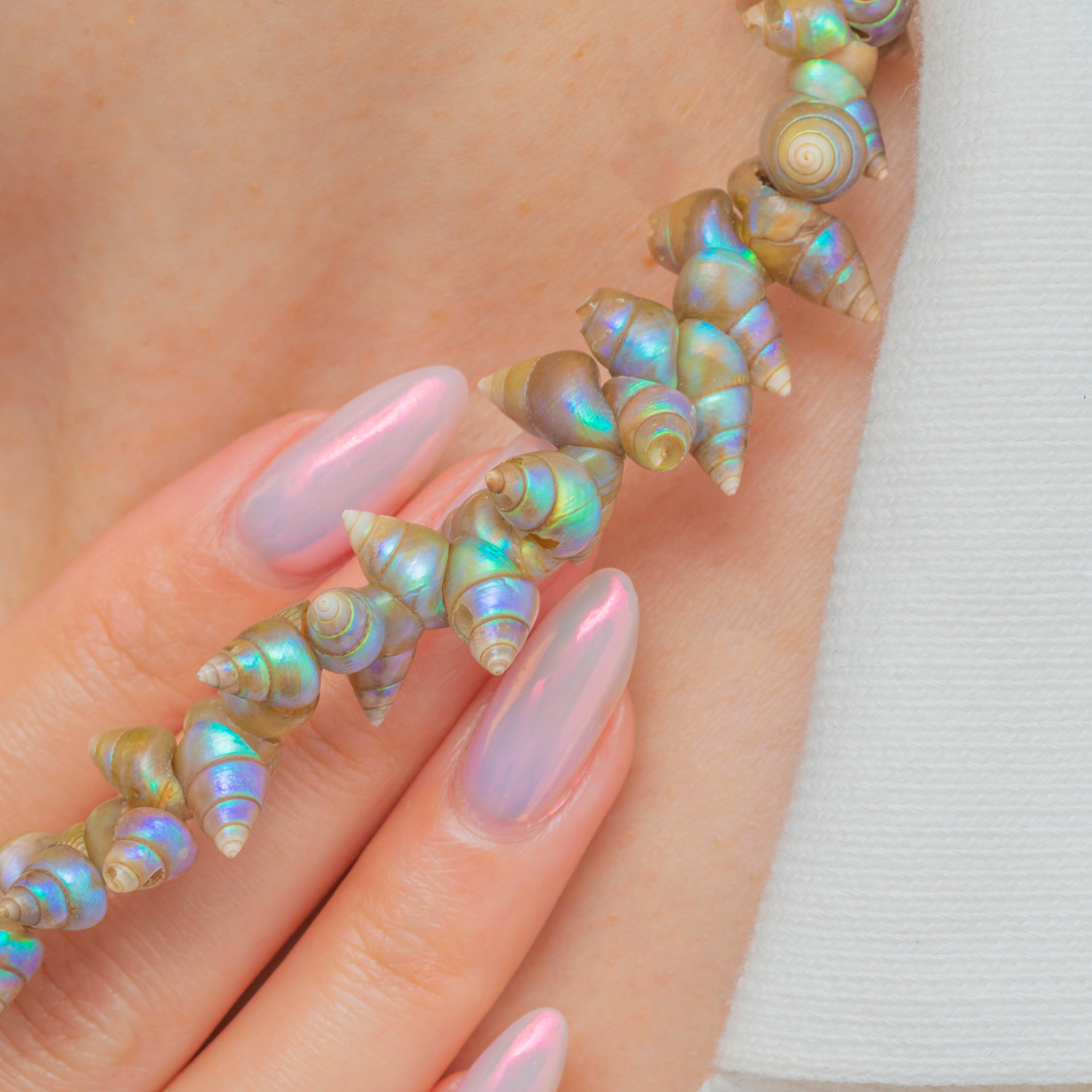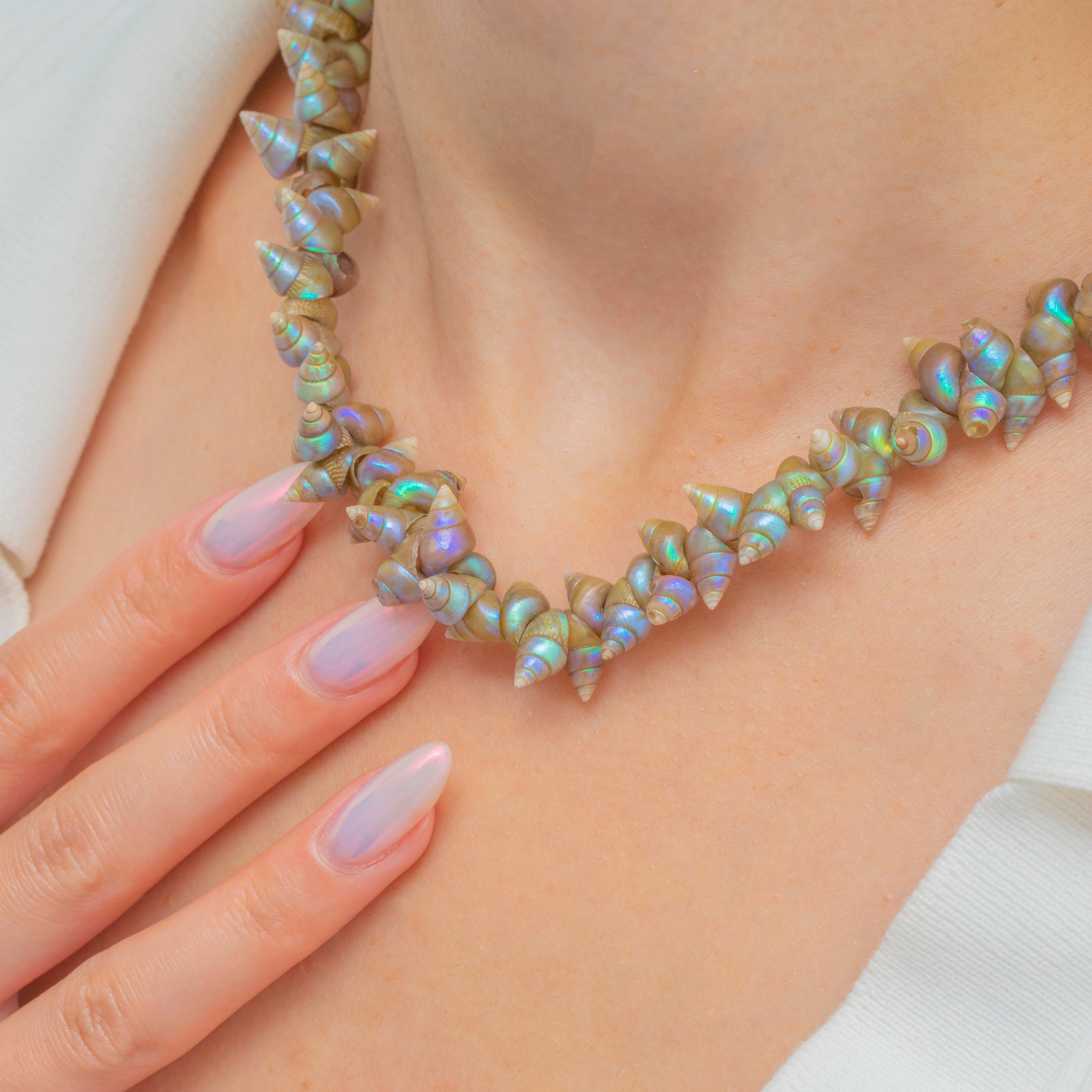 This Victorian necklace displays an exquisite selection of rare Tasmanian Shells. Each shell boasts eye-catching shimmers of soft greens, blues and lilacs, their iridescence shifting in the light, giving the piece an ethereal quality.