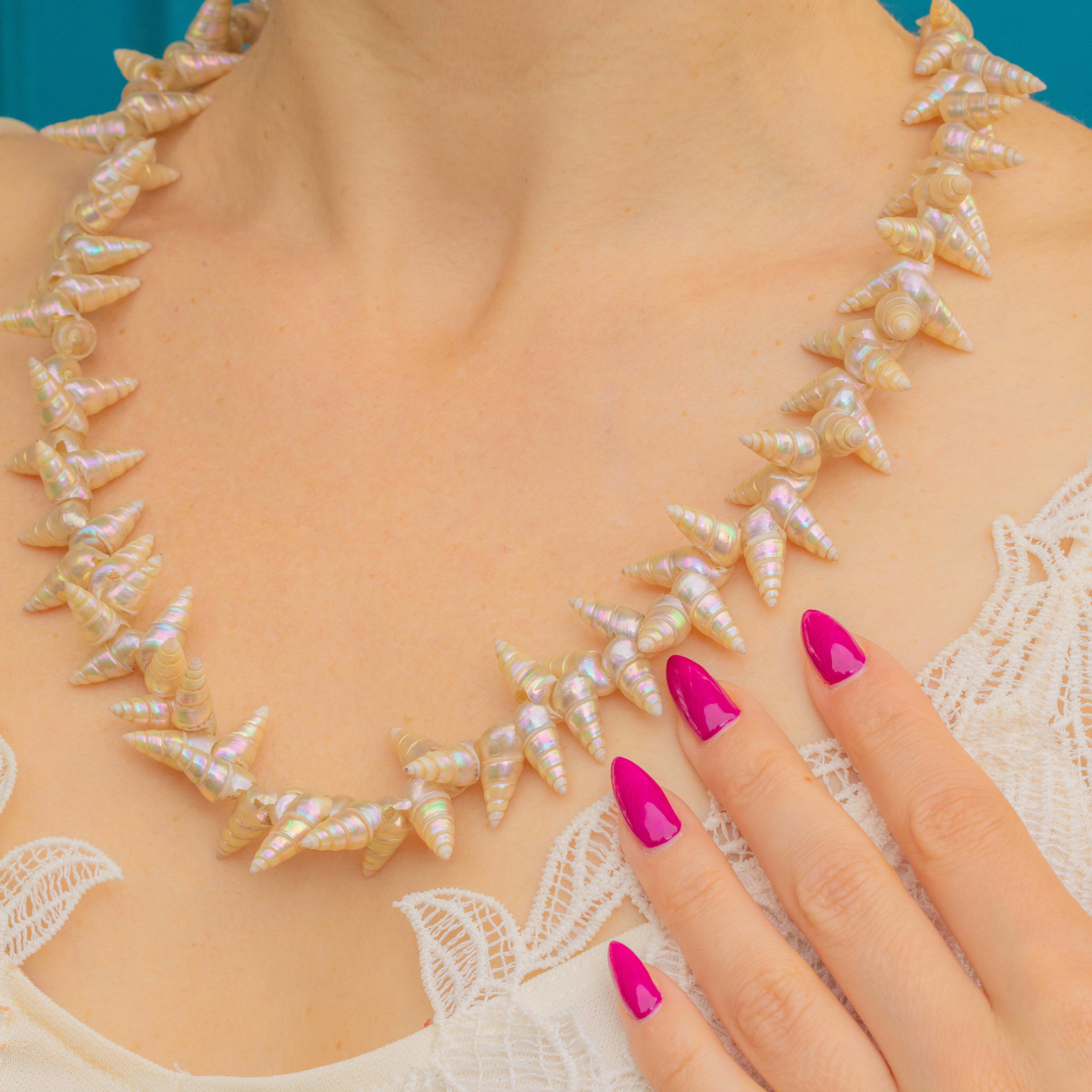 This Victorian Maireener shell necklace was crafted on the shores of Tasmania by Aboriginal women over a century ago. The shells each have a light, blush pink hue, rendering this beauty a rare find, with soft shimmers of sea green and blue shifting in the light.