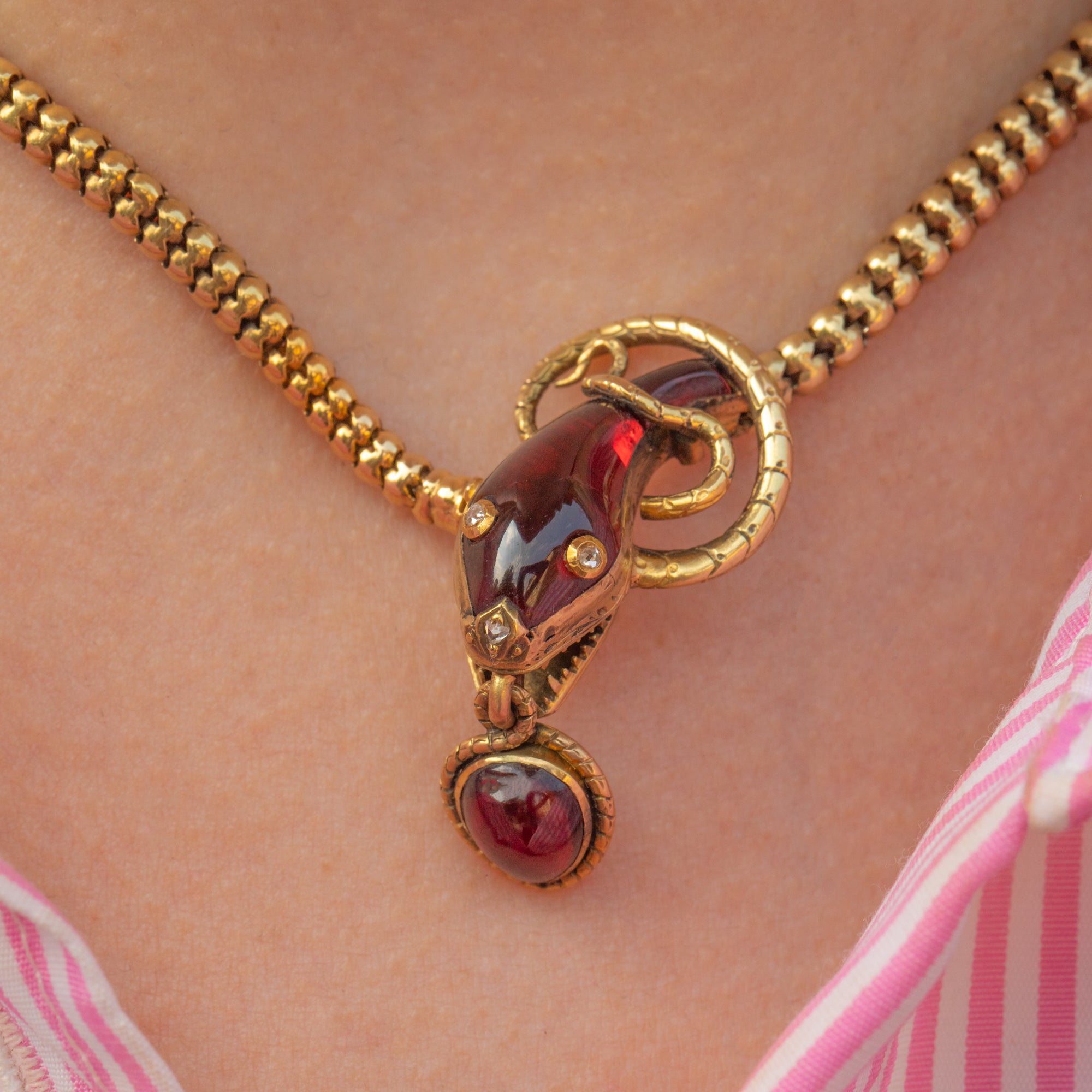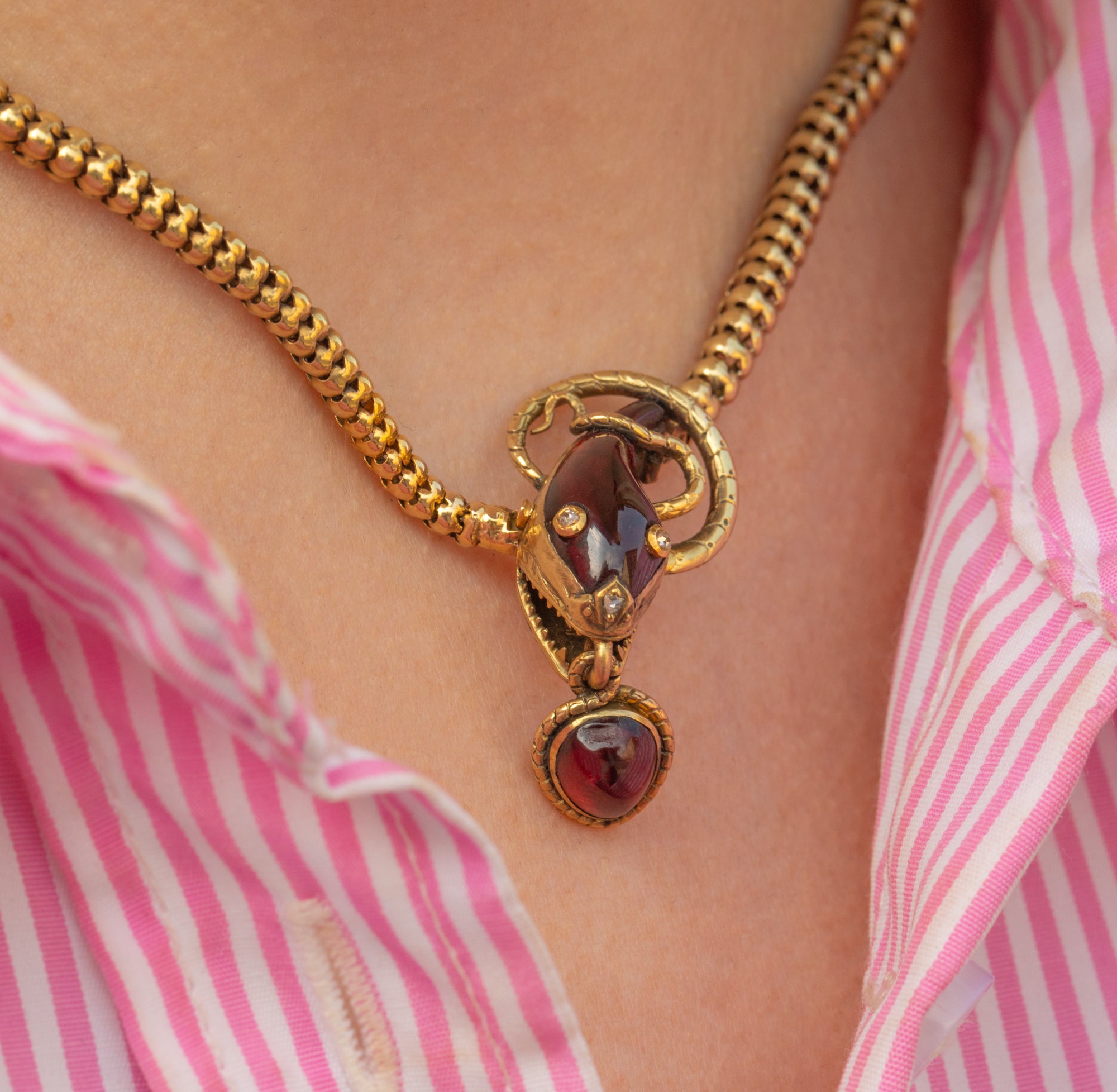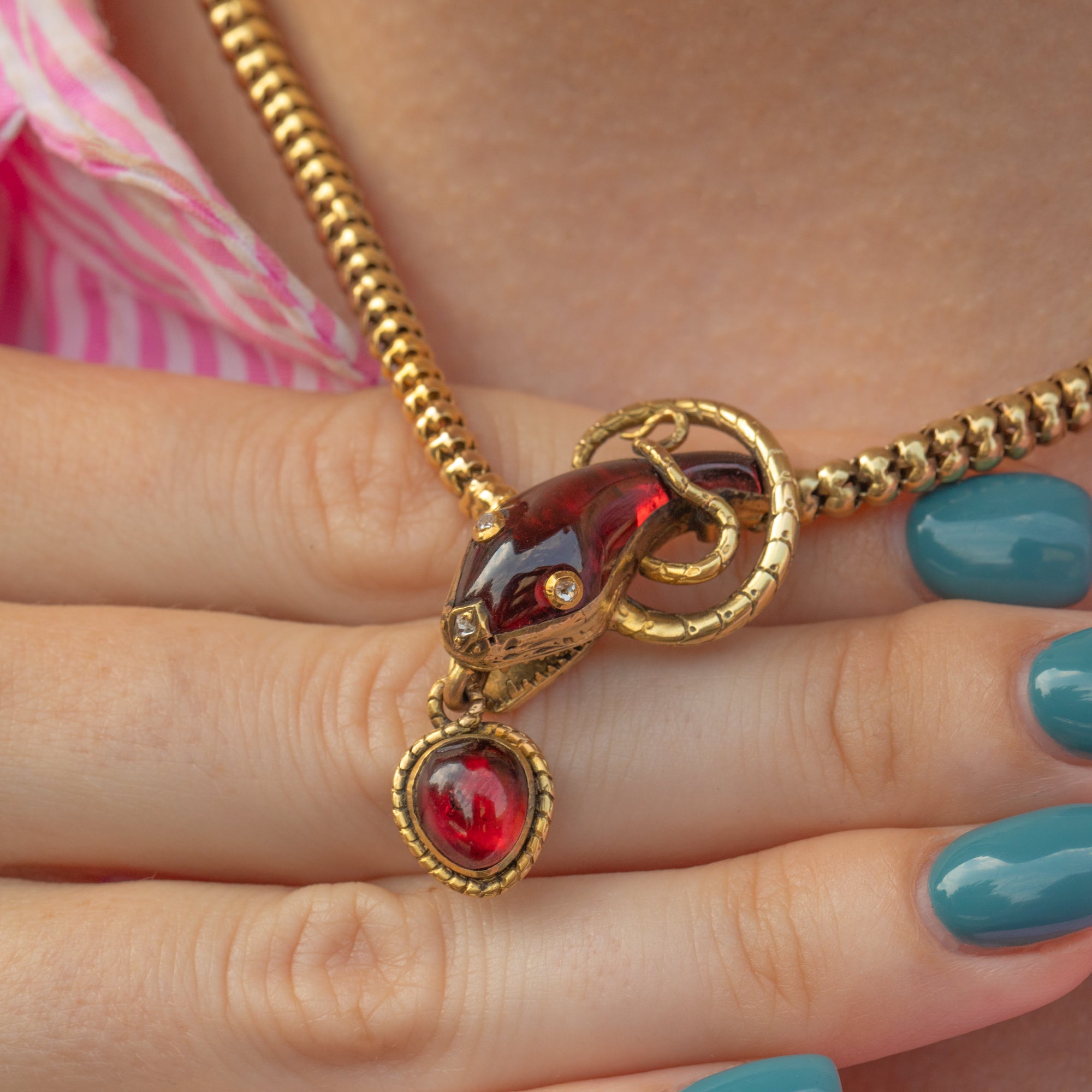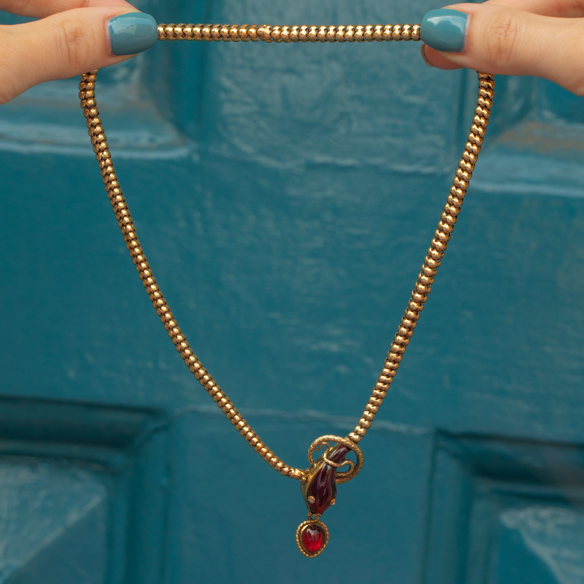 EXCELLENT. This Victorian 18ct Gold Garnet snake necklace is in excellent condition, especially when considering her grand age! The necklace has very little wear to note overall, only a single small scratch! The Garnets are bright and punchy, securely set and have a gorgeous subtle variation in hue. The clasp slides securely into the side of the snake's head creating a seamless piece.