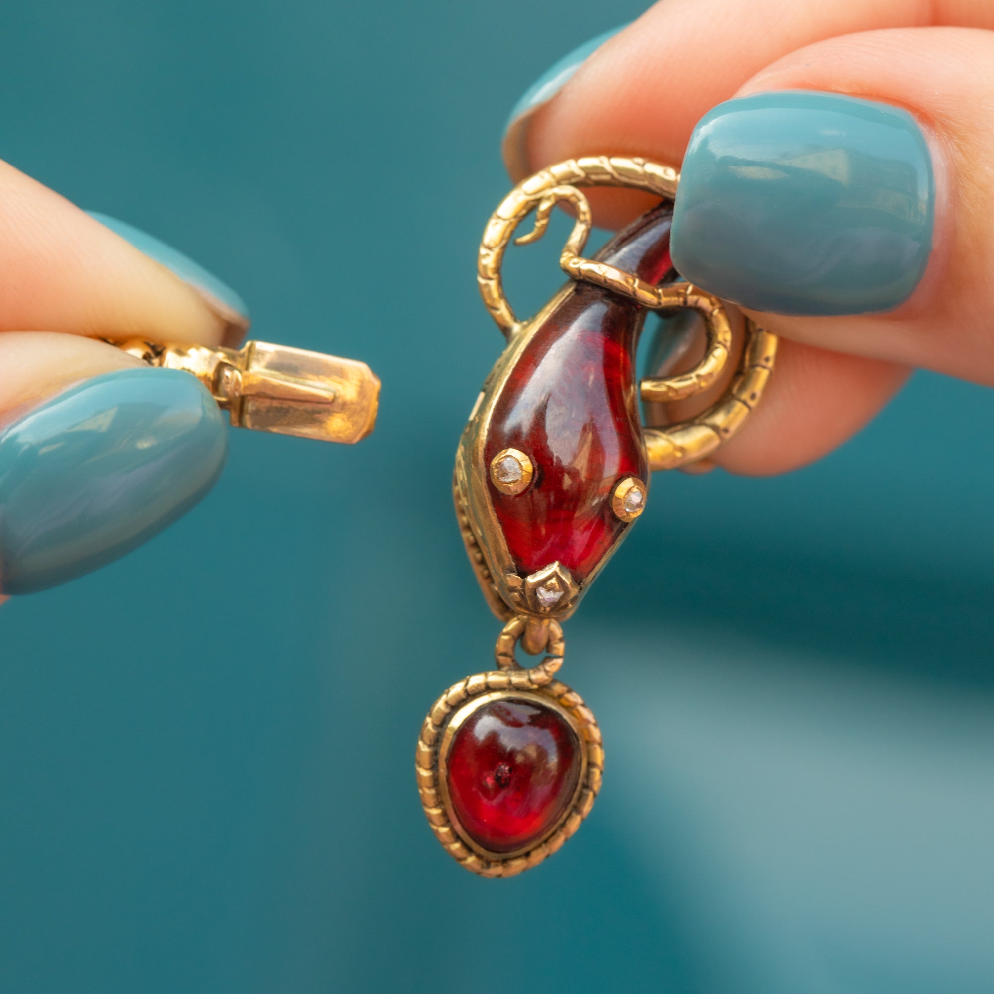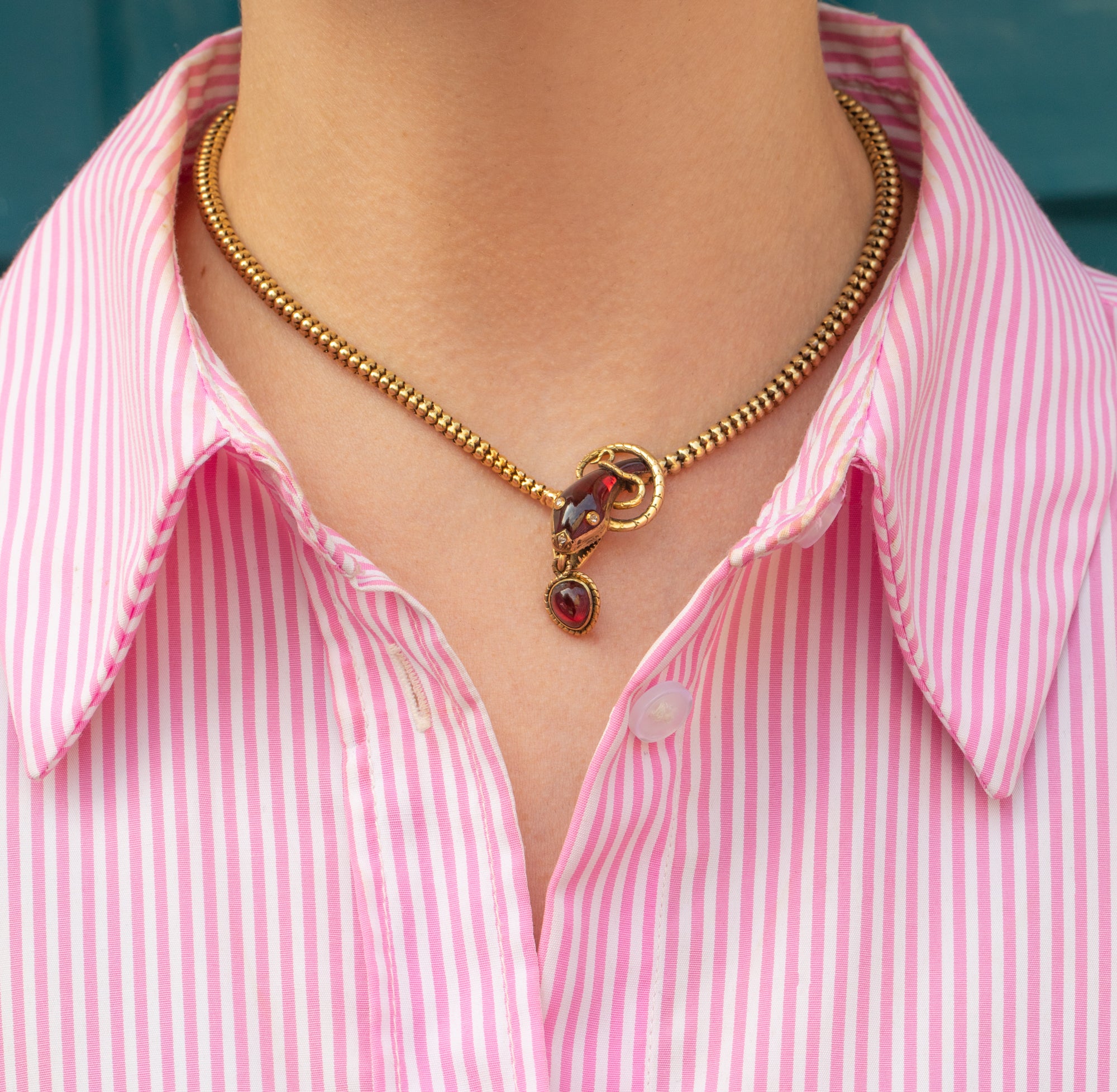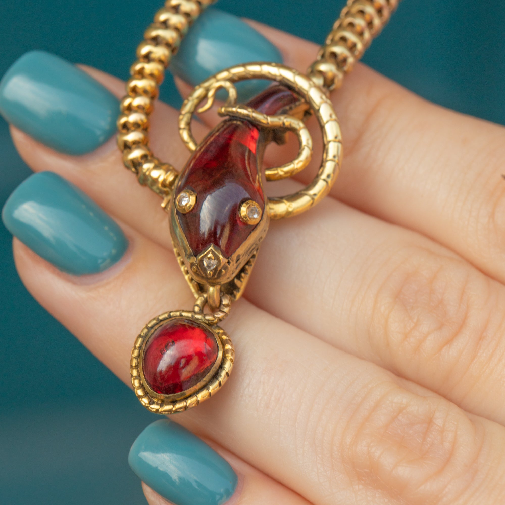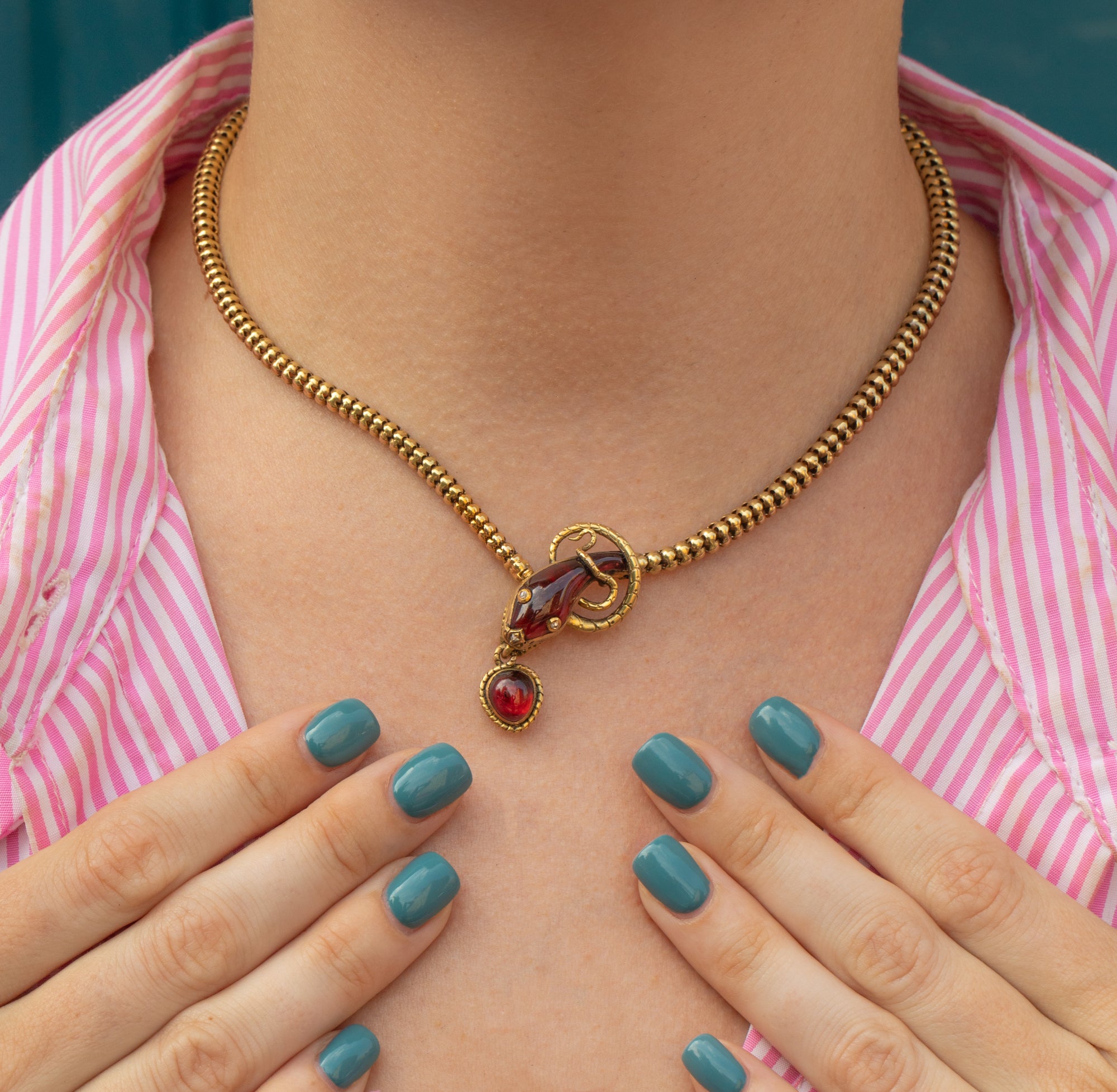 EXCELLENT. This Victorian 18ct Gold Garnet snake necklace is in excellent condition, especially when considering her grand age! The necklace has very little wear to note overall, only a single small scratch! The Garnets are bright and punchy, securely set and have a gorgeous subtle variation in hue. The clasp slides securely into the side of the snake's head creating a seamless piece.