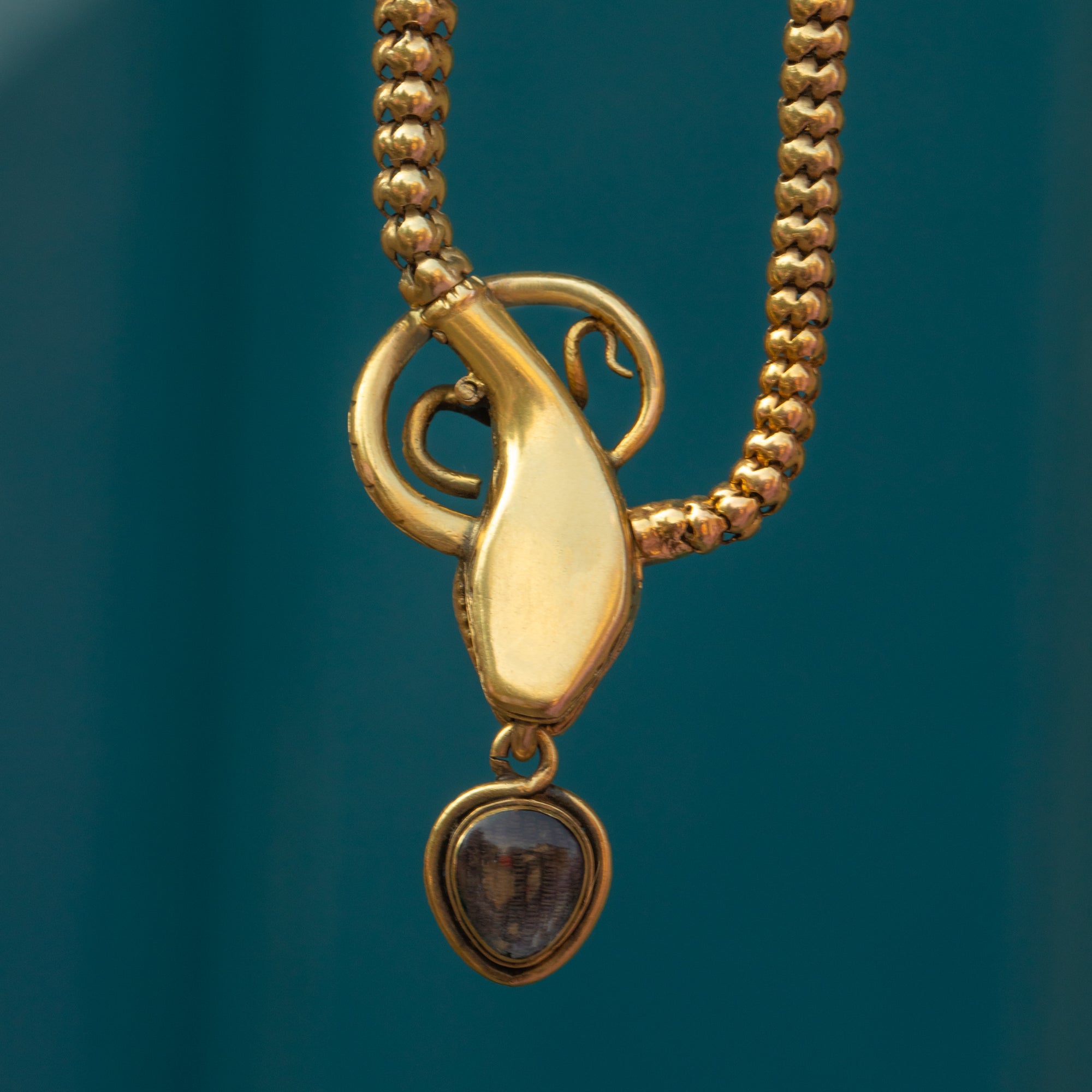This antique necklace is an excellent display of craftsmanship, boasting a series of interlocking rings that perfectly mimic the scales of a snake, giving her gorgeous movement too. Wearing this piece around your neck will capture the attention of others; she's a captivating piece and will make an exquisite heirloom that can be passed down through the generations!
