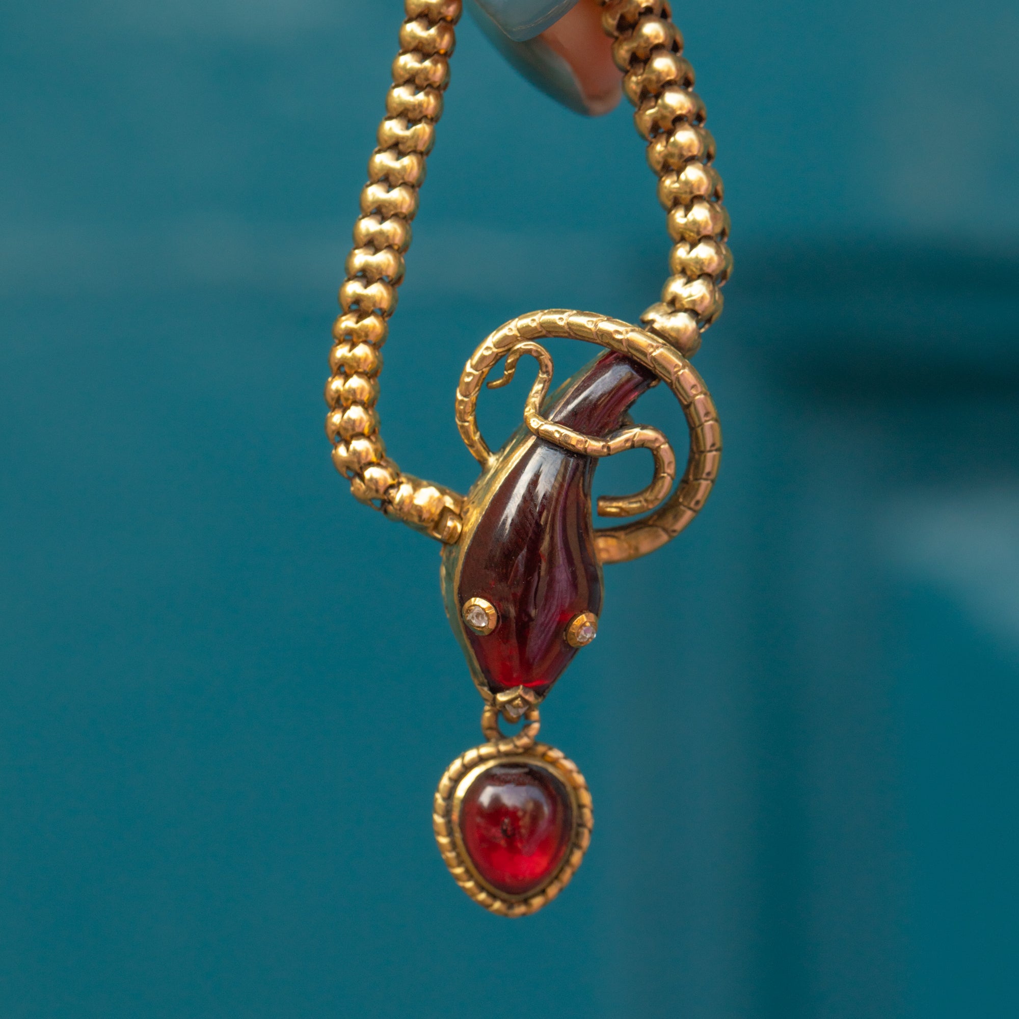 Victorian 18ct Gold Garnet Diamond Snake Necklace, c.1860