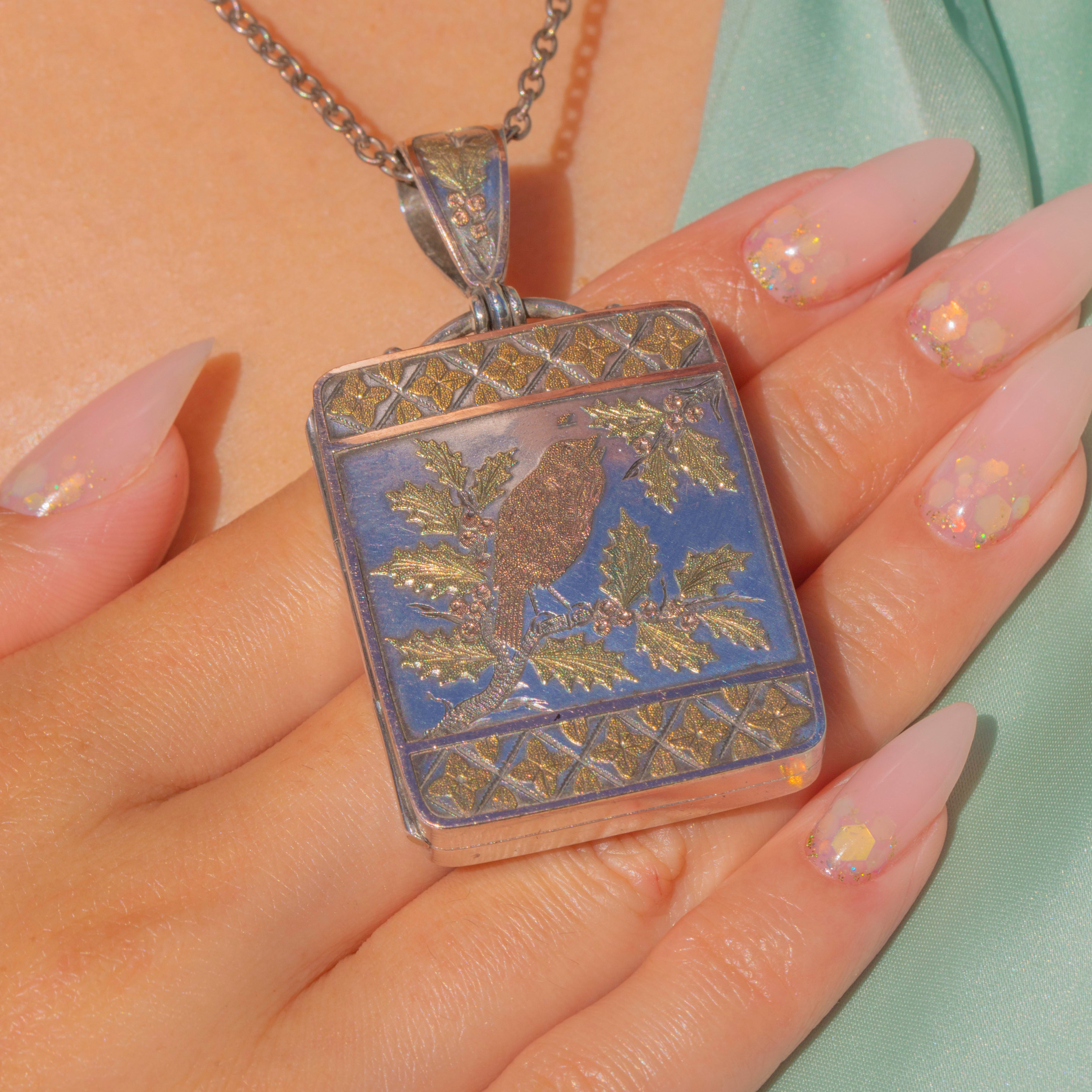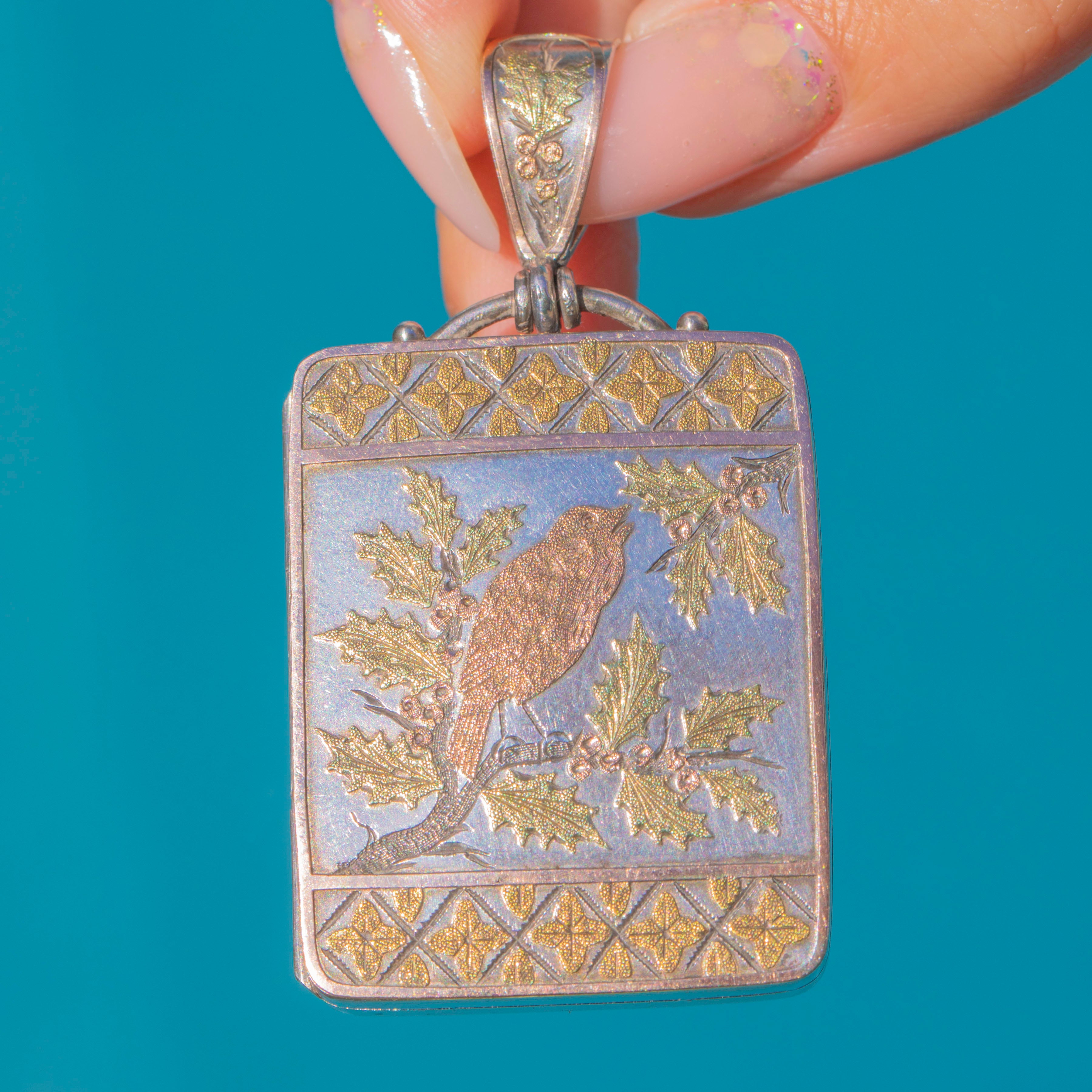 A rare and striking Victorian Aesthetic locket featuring a finely engraved robin amongst holly leaves and berries. The mixed-metal artistry pairs a Silver body with Yellow, Rose and Green Gold detail, creating rich, naturalistic contrast.