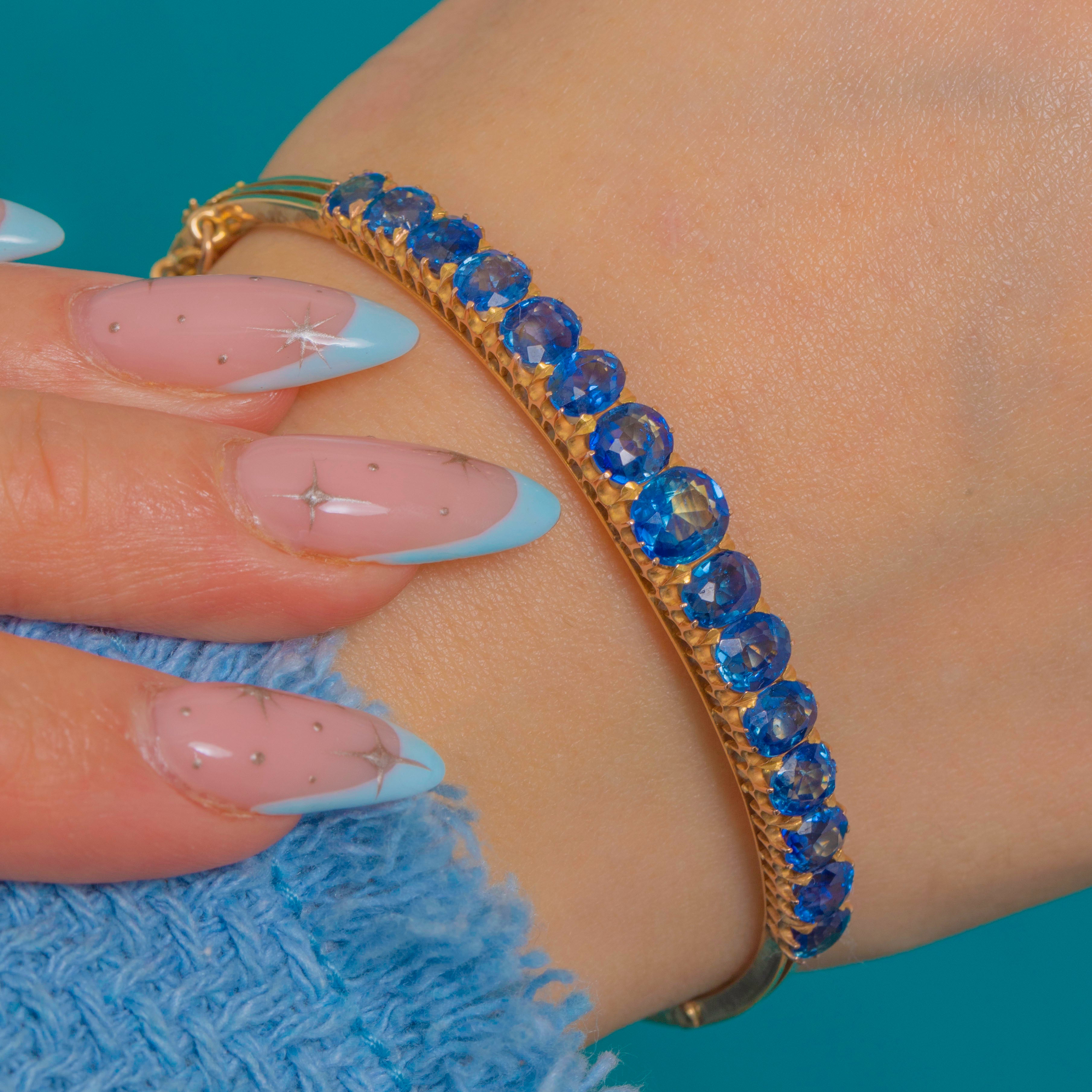 A rare Victorian natural Sapphire bangle, this elegant treasure presents a sweep of graduated blue Sapphires totalling approximately 7.85cts across the wrist. The top and settings are crafted in 15ct Gold, while the reverse of the bangle is 9ct Gold—a refined Victorian construction prized for its beauty and durability.