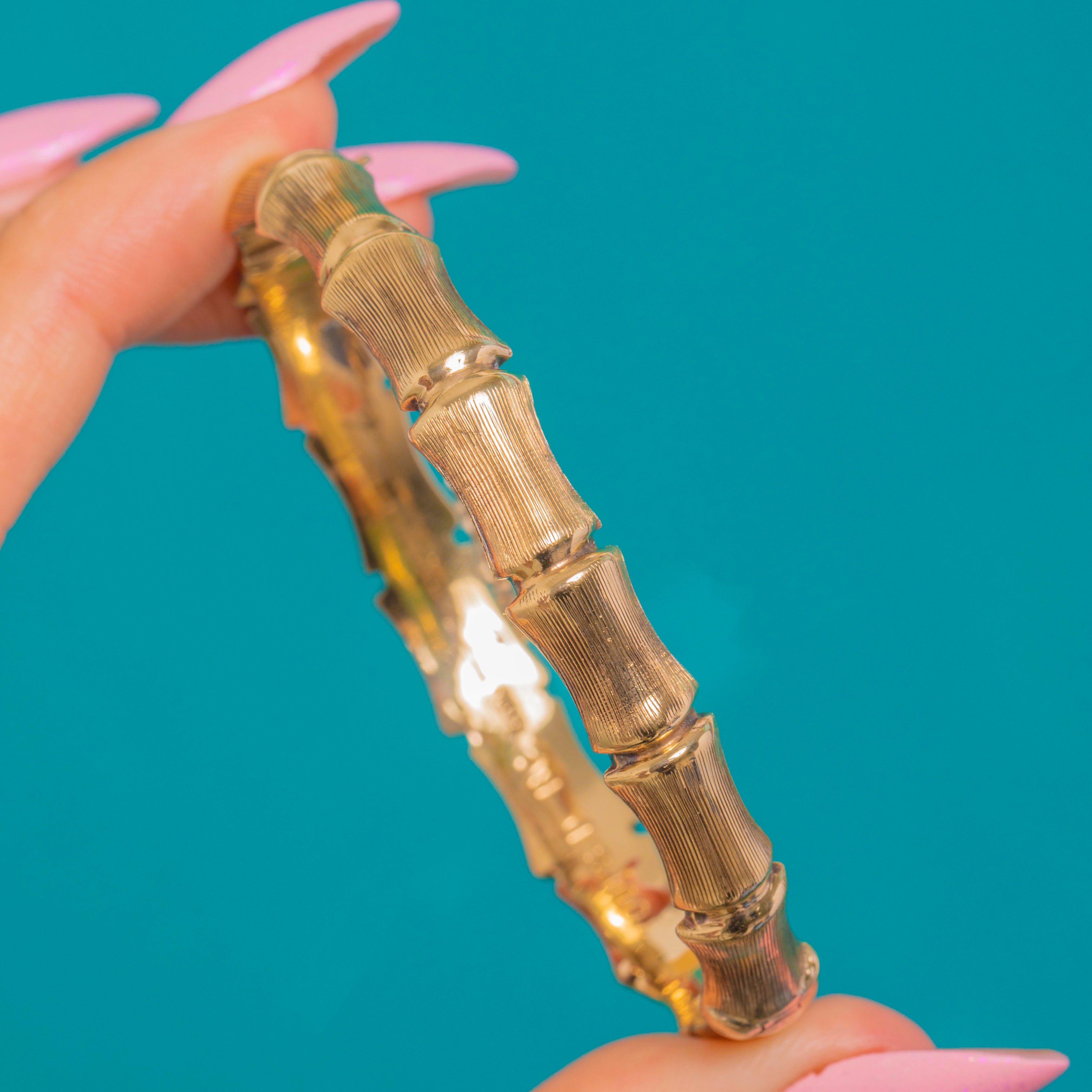 A striking Vintage 9ct Gold bamboo bangle, sculpted in bold, repeating segments with fine vertical striations and polished nodes for that unmistakable botanical allure. The warm Yellow Gold glows beautifully, while the naturalistic texture catches the light with every movement.