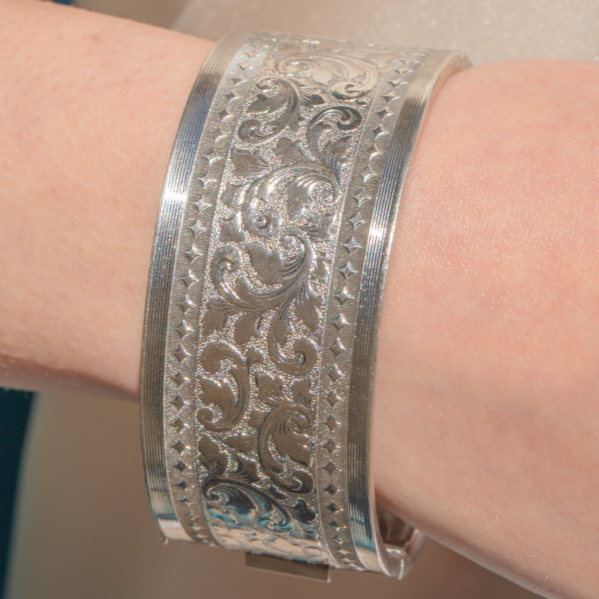 VERY GOOD: This Silver engraved cuff bangle is in very good condition. The Silver is bright and the engravings have all remained crisp, with a light patina having accrued making the details pop. One side looks slightly flatter from previously being misshapen, but the bangle still sits comfortably around the wrist. With a secure clasp, you can wear this vintage Silver bangle confidently!