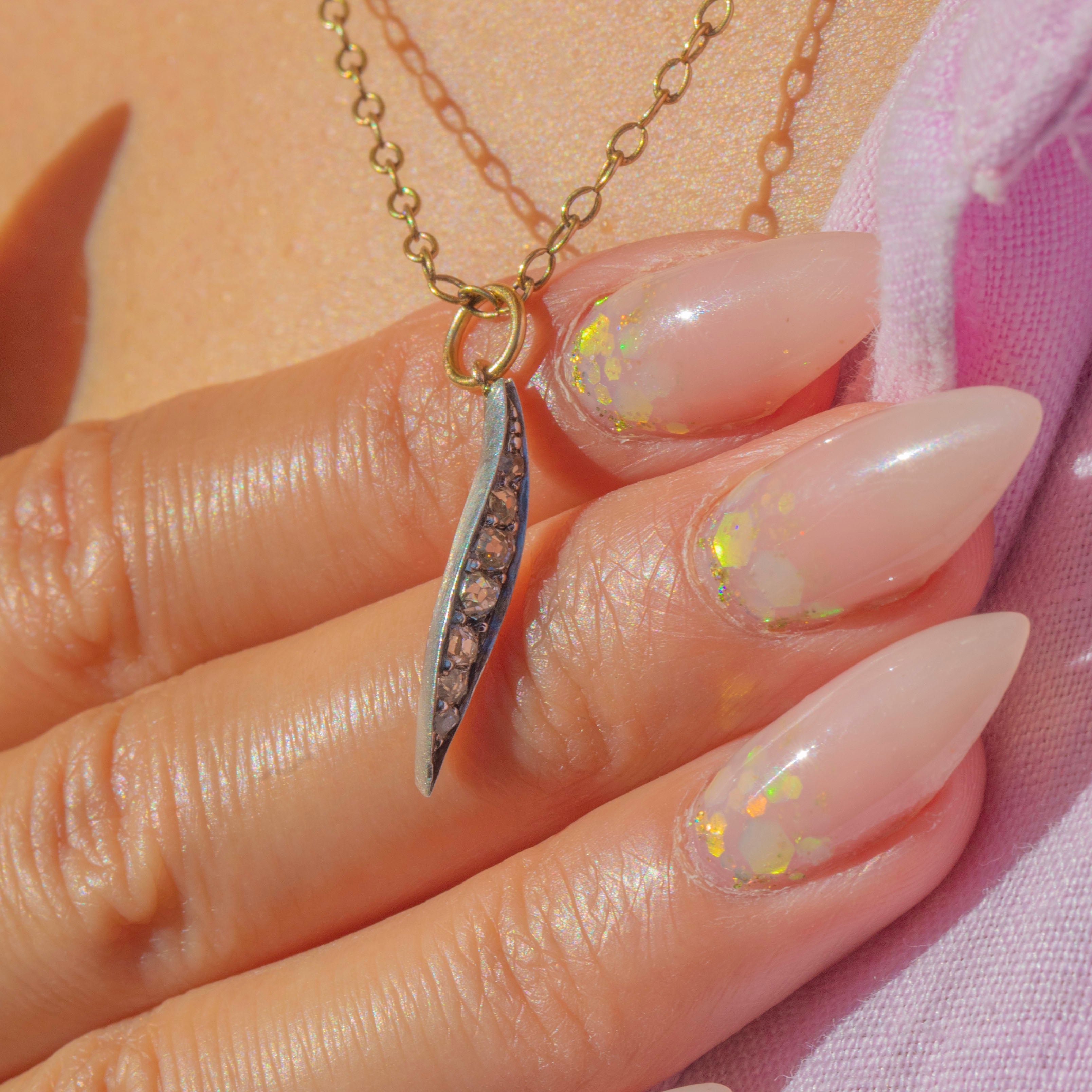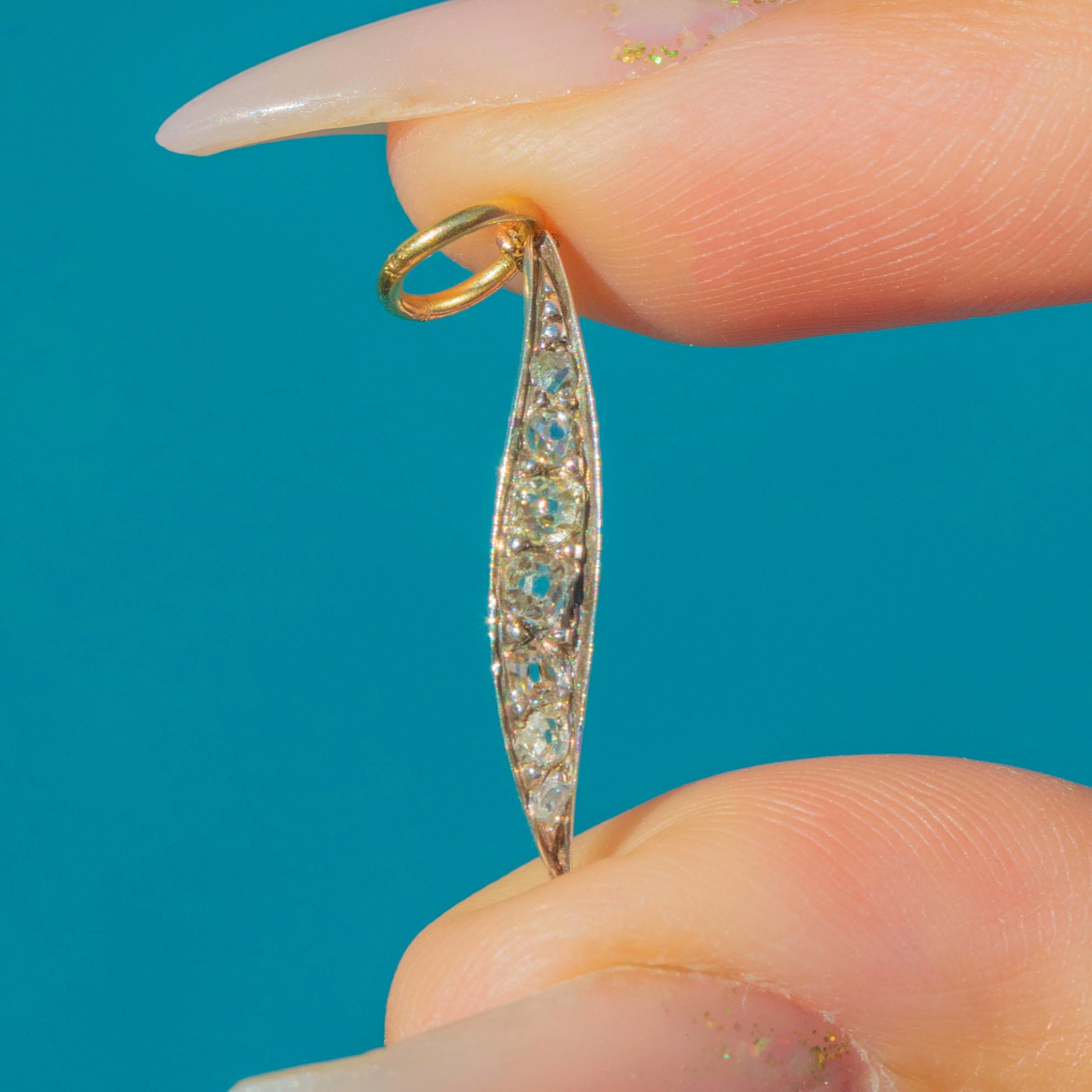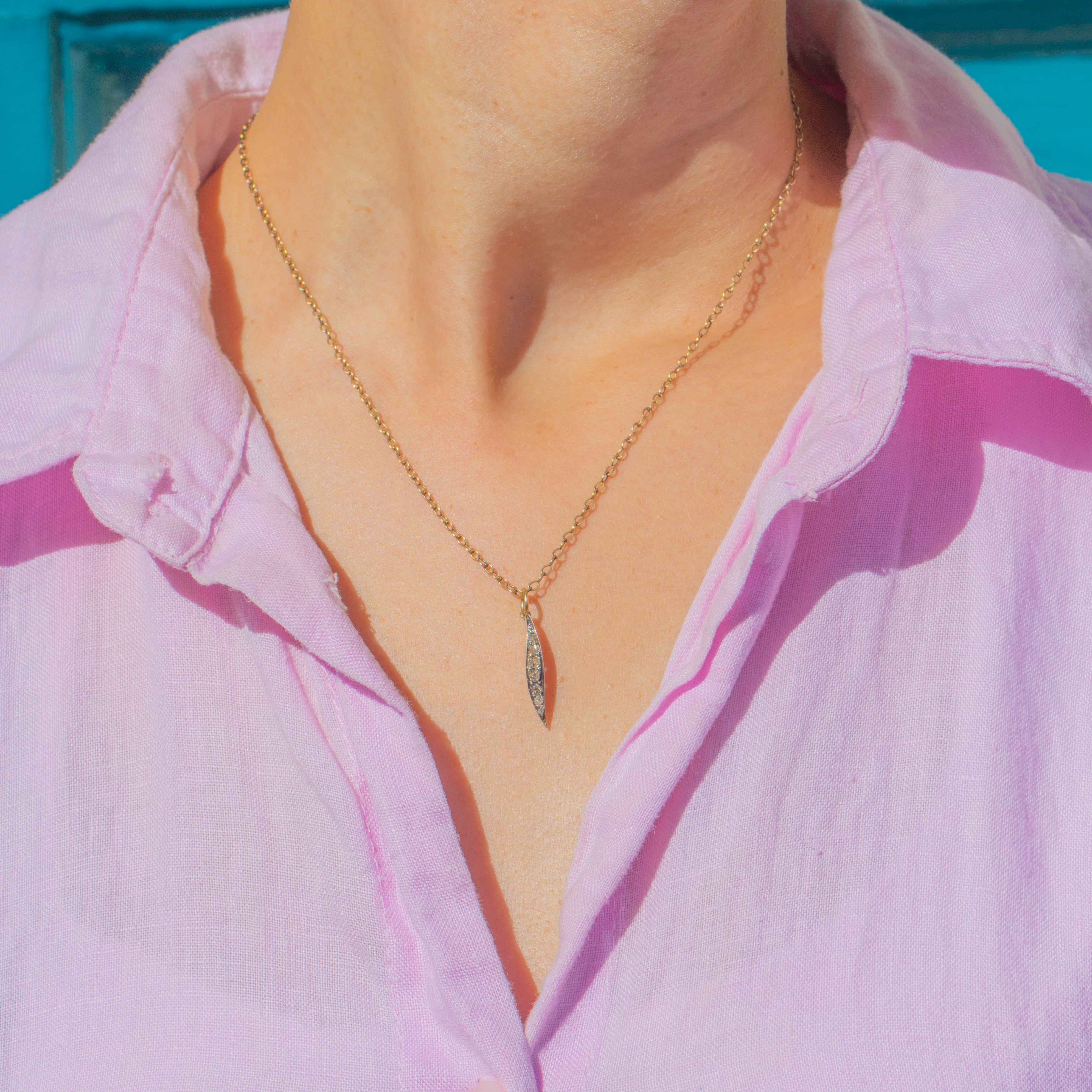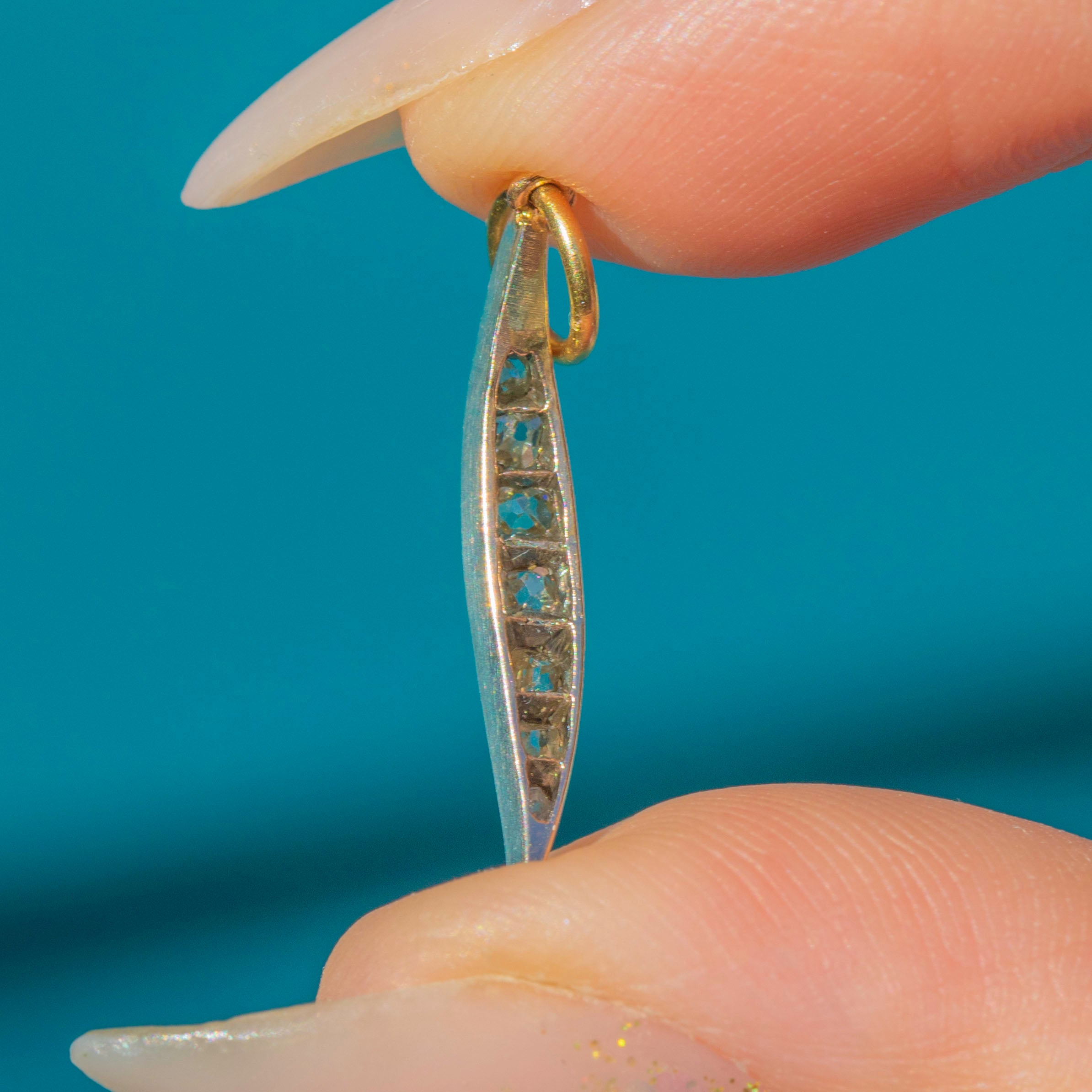 This delicate Victorian leaf charm is a refined and elegant piece, finely crafted in Sterling Silver with an 18ct Gold backing and jump ring. Its slender silhouette is set with a graduated line of old mine-cut Diamonds, ranging from 1mm to 2.5mm, each stone sparkling with the unique charm of antique cutting.