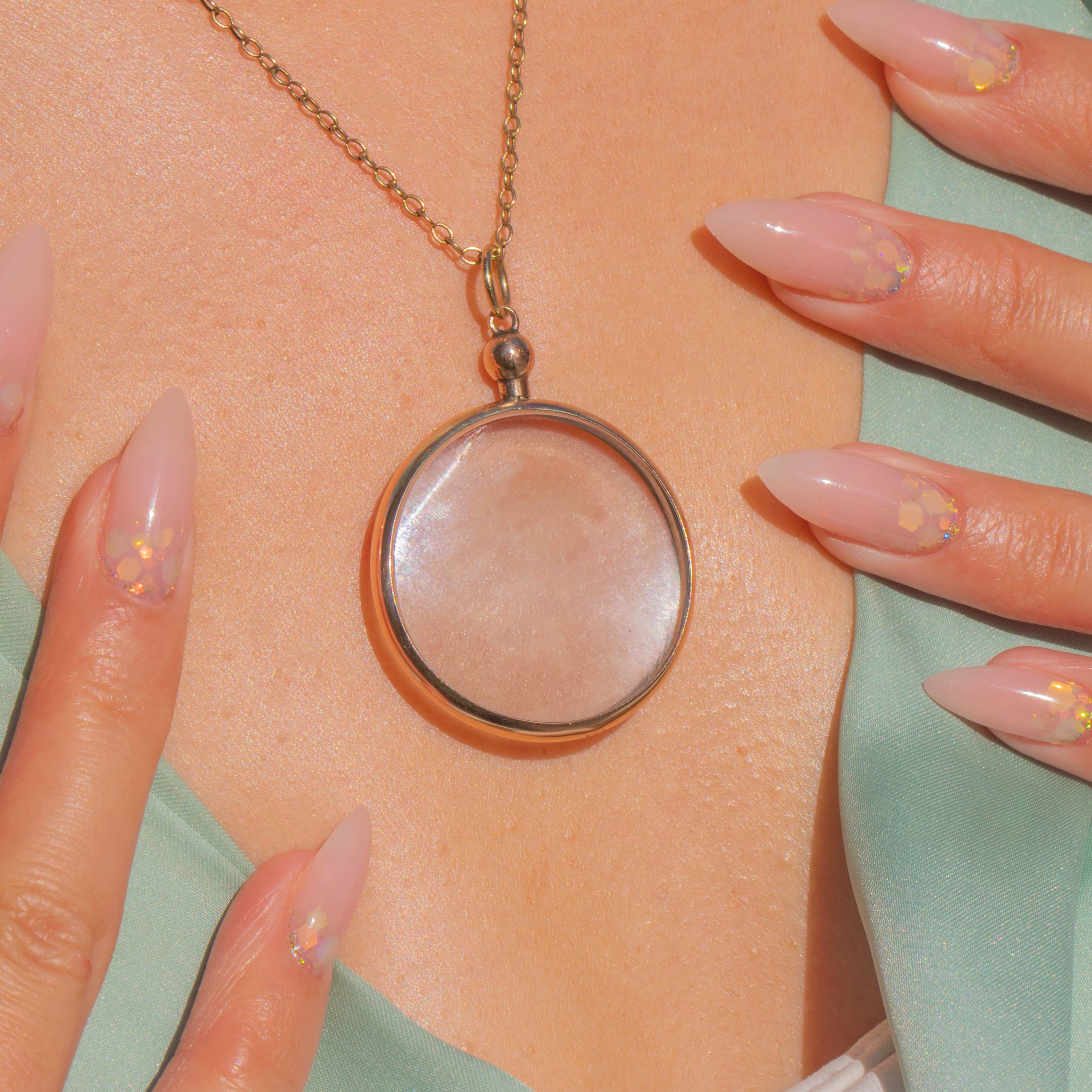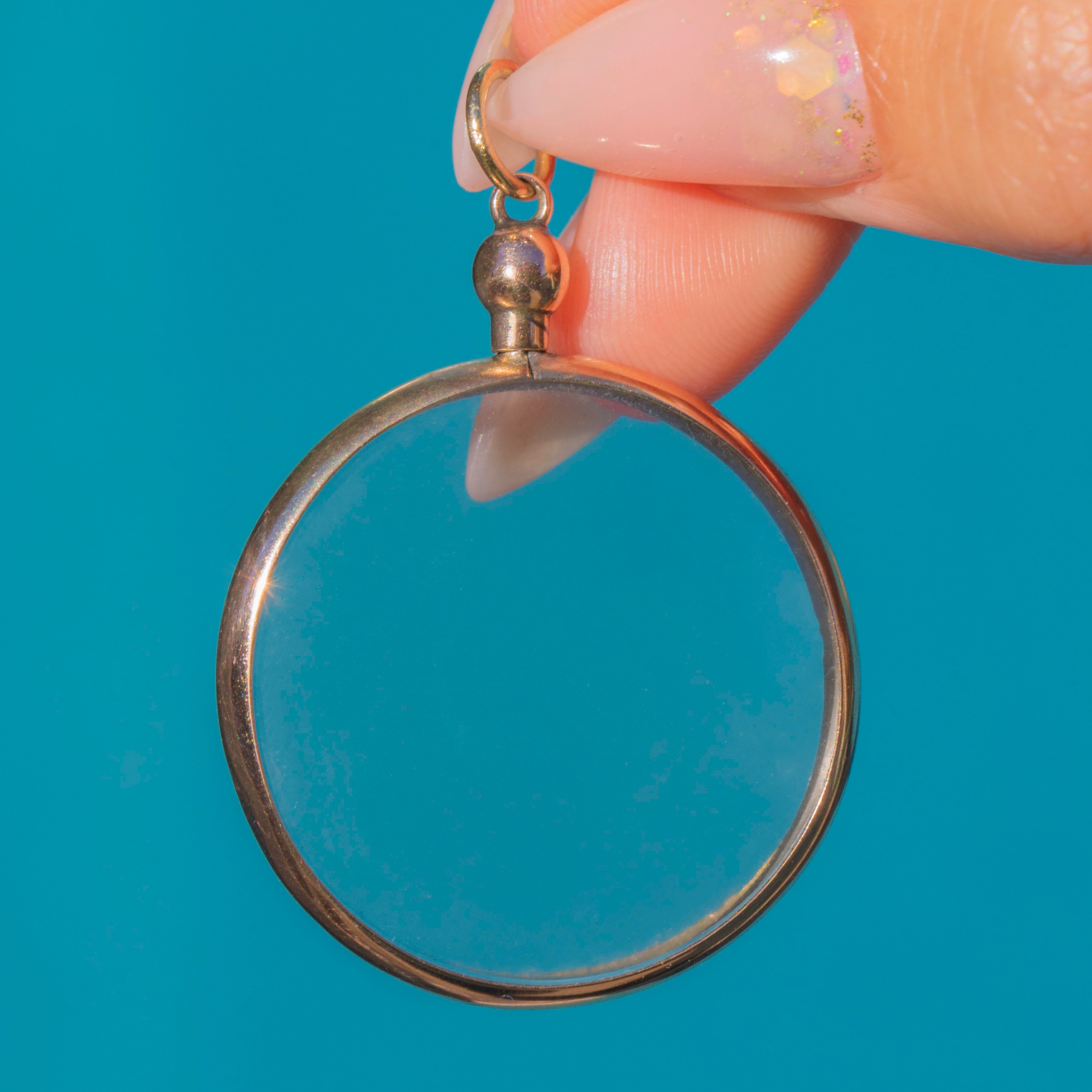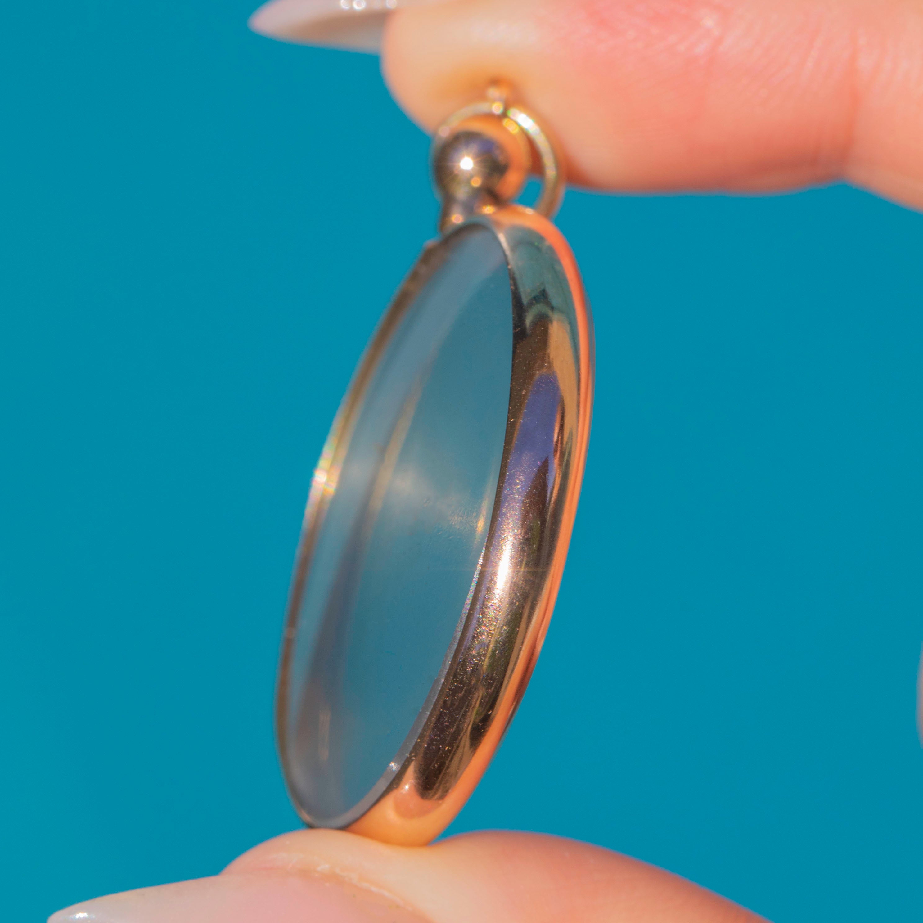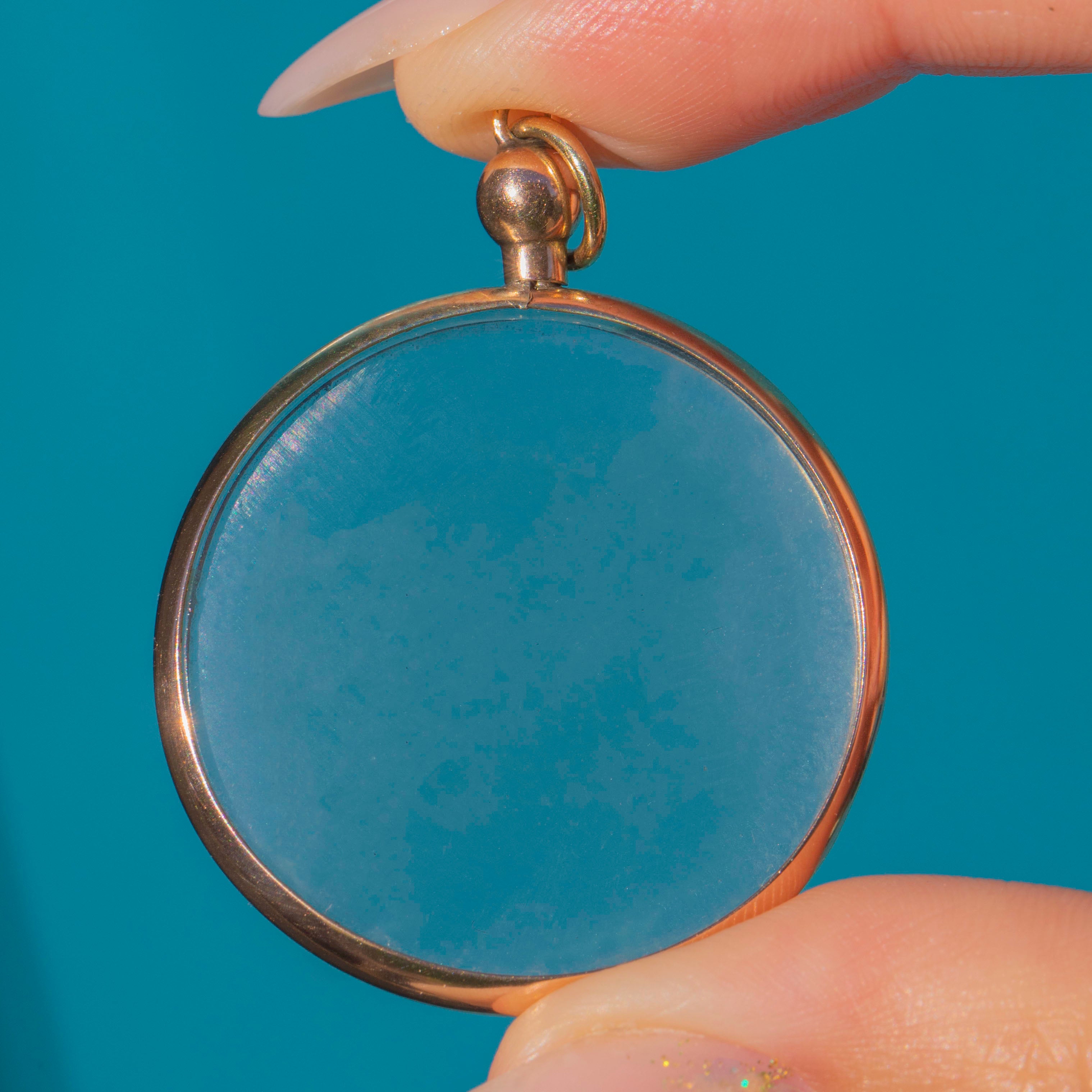 A striking Vintage round locket in 9ct Gold, fitted with clear Perspex panels. This oversized piece is designed to hold and display photographs, pressed flowers or tiny keepsakes, with a simple yet bold Gold bezel that keeps the focus on what’s inside.