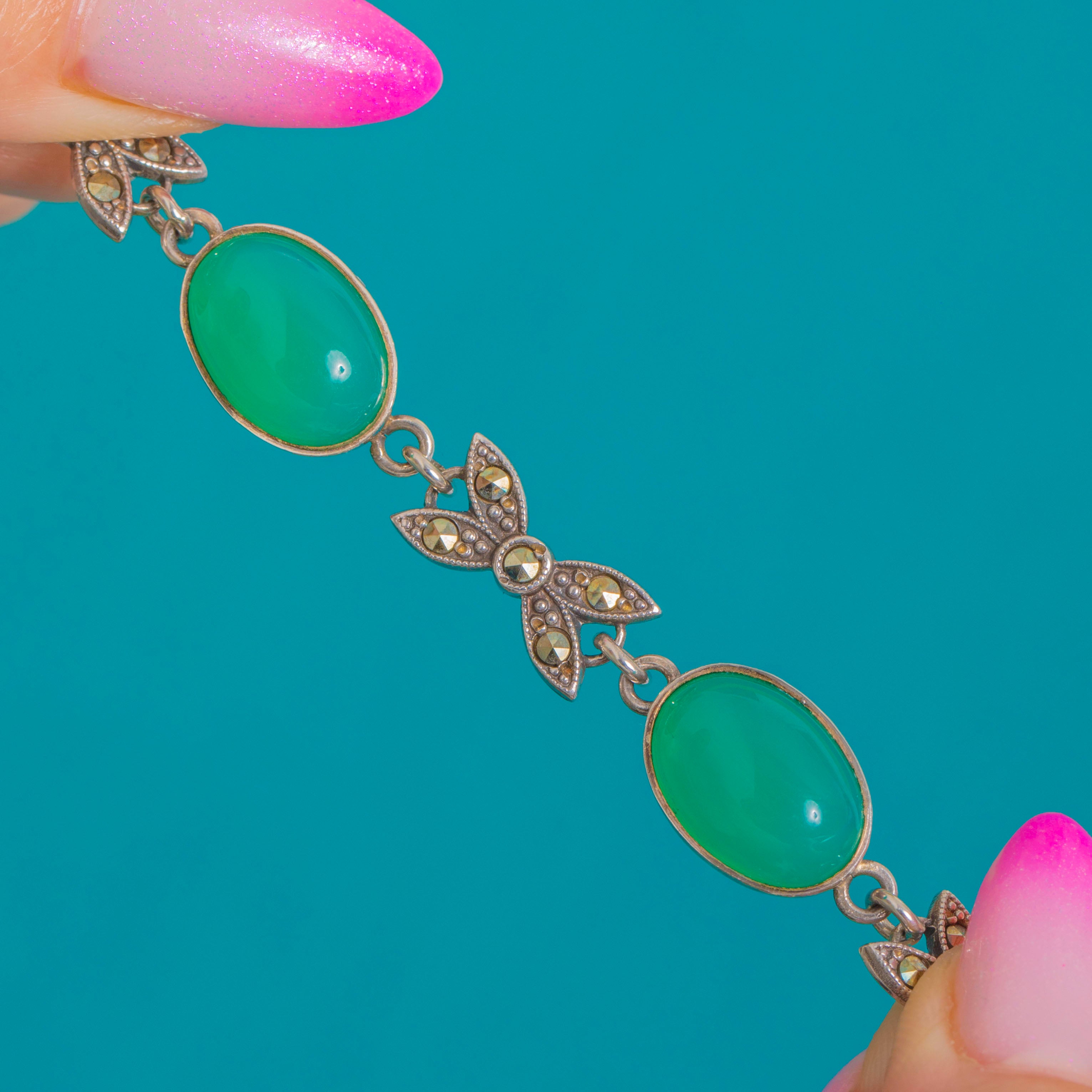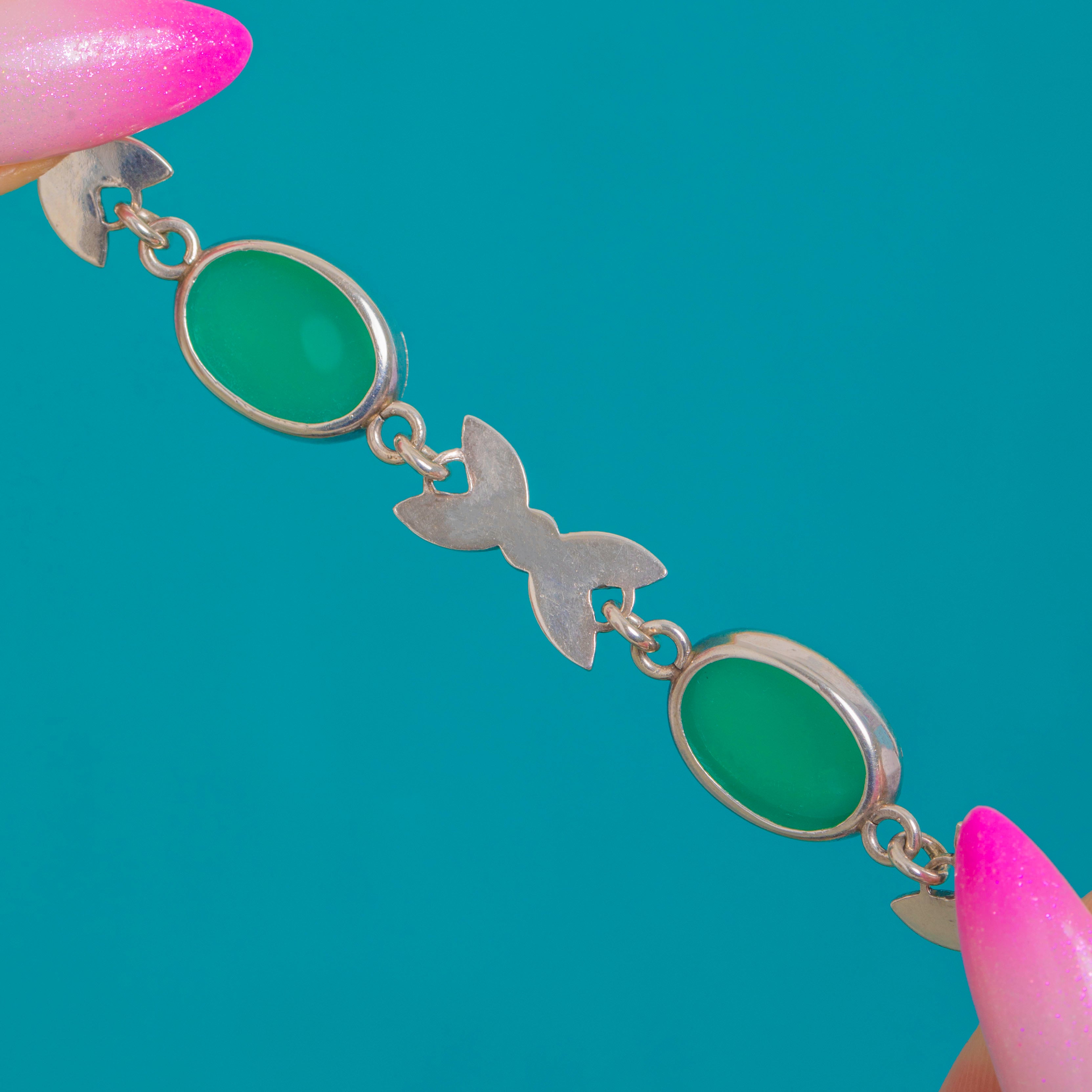 This elegant Vintage Sterling Silver line bracelet pairs vivid green Chrysoprase cabochons with dainty bow links pavé-set with shimmering Marcasite. Each smooth, domed oval rests in a sleek bezel, alternating with sculpted bow motifs trimmed in delicate milgrain for a refined, Deco-tinged silhouette.