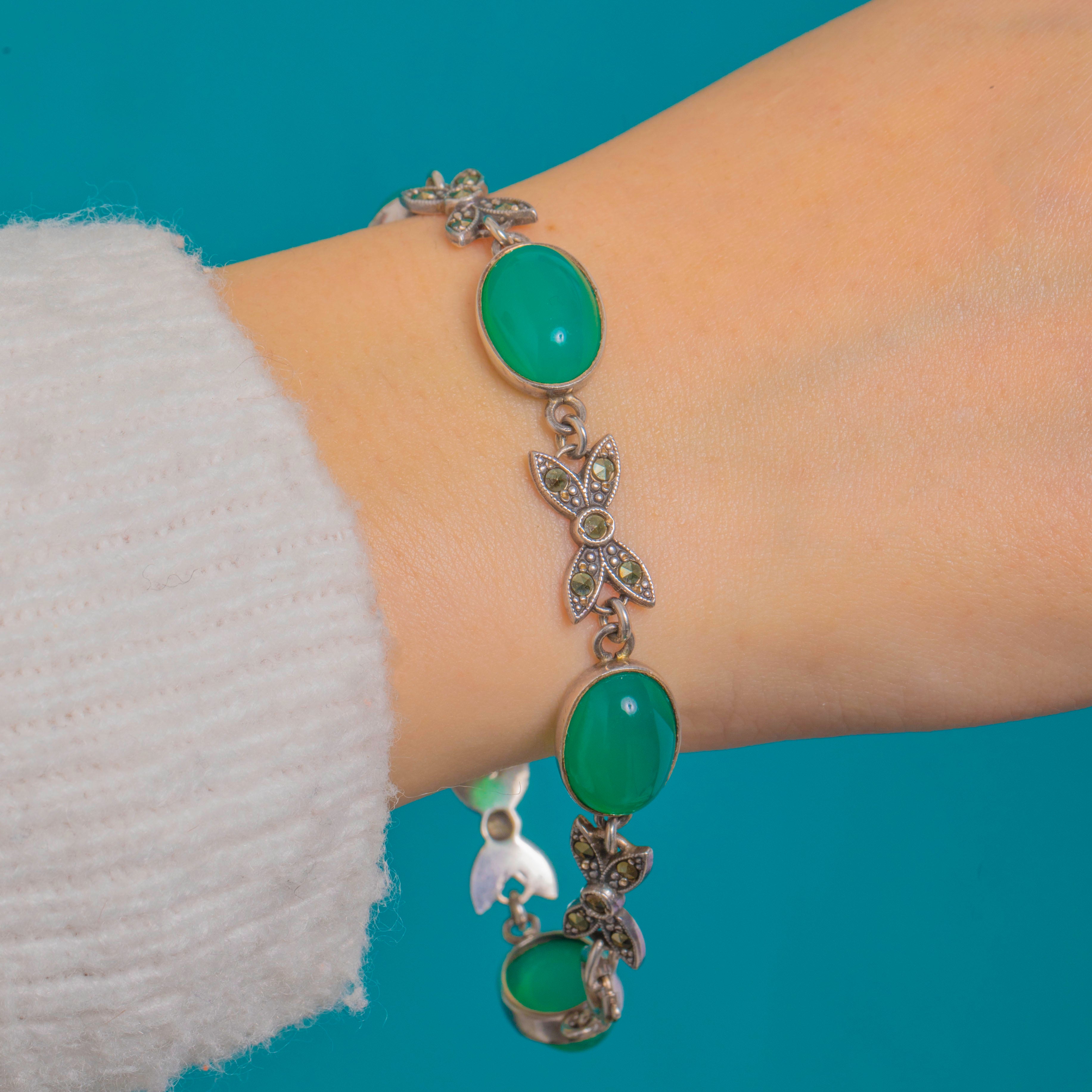 Sterling Silver Green Chrysoprase Marcasite Bow Line Bracelet