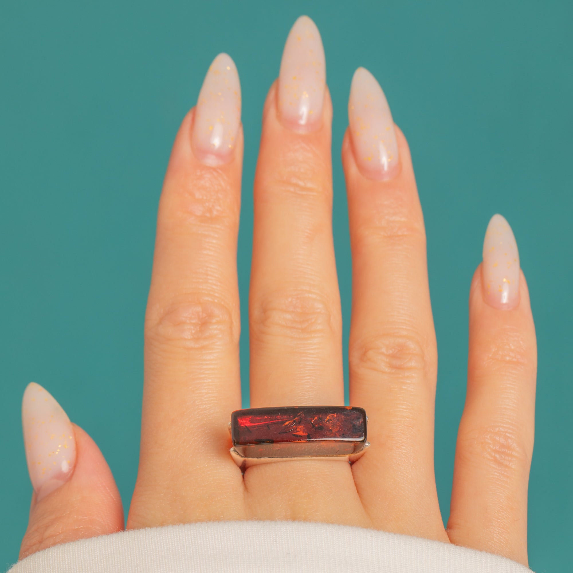 Sleek, sculptural and effortlessly bold, this Sterling Silver statement ring captures a distinctly Modernist mood. An elongated rectangular Amber cabochon sits in a smooth, substantial bezel, creating clean architectural lines that span the finger with confident presence.