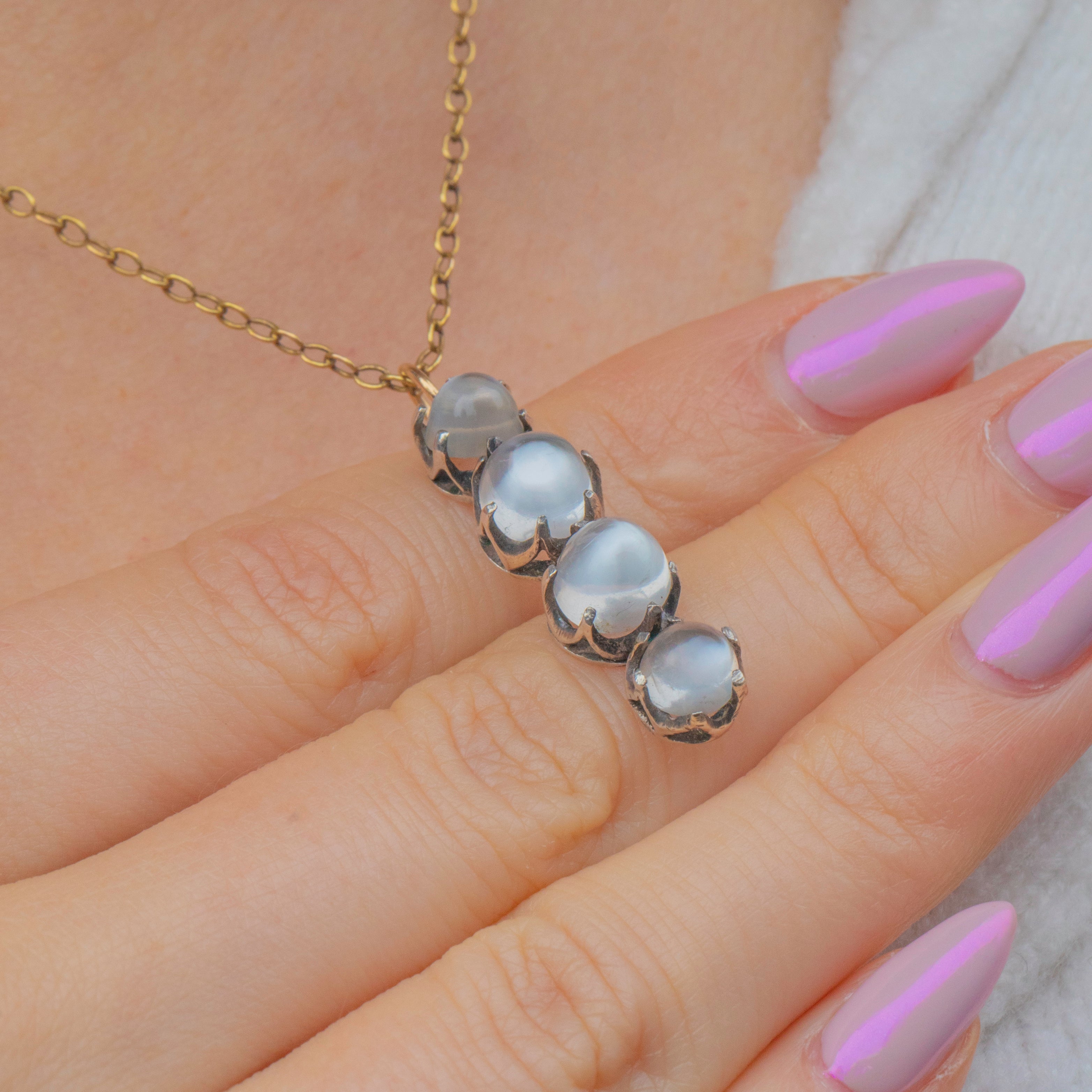 A charming Vintage Sterling Silver pendant set with four luminous Moonstones. Each stone glows with ethereal blue adularescence, shifting with the light for a soft, magical effect. The clean, linear design allows the natural beauty of the Moonstones to take centre stage.