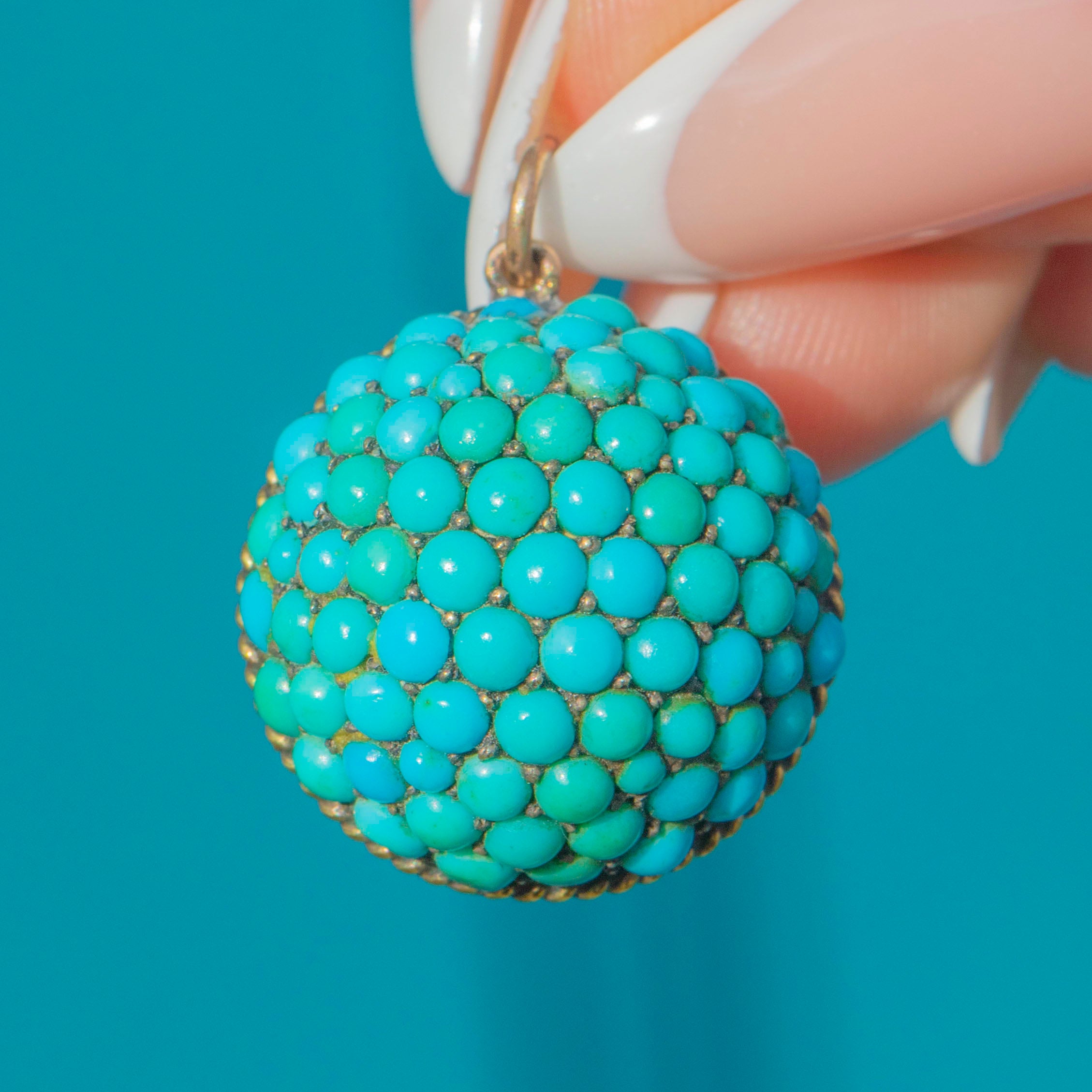 This striking Victorian pendant is a bold celebration of colour and craftsmanship. Crafted in 12ct Gold, the domed bombé form is pavé-set with a mosaic of natural Turquoise cabochons in vibrant shades of sky blue and sea green. The rich tones and textural arrangement make this a captivating jewel with wonderful presence on the neckline.