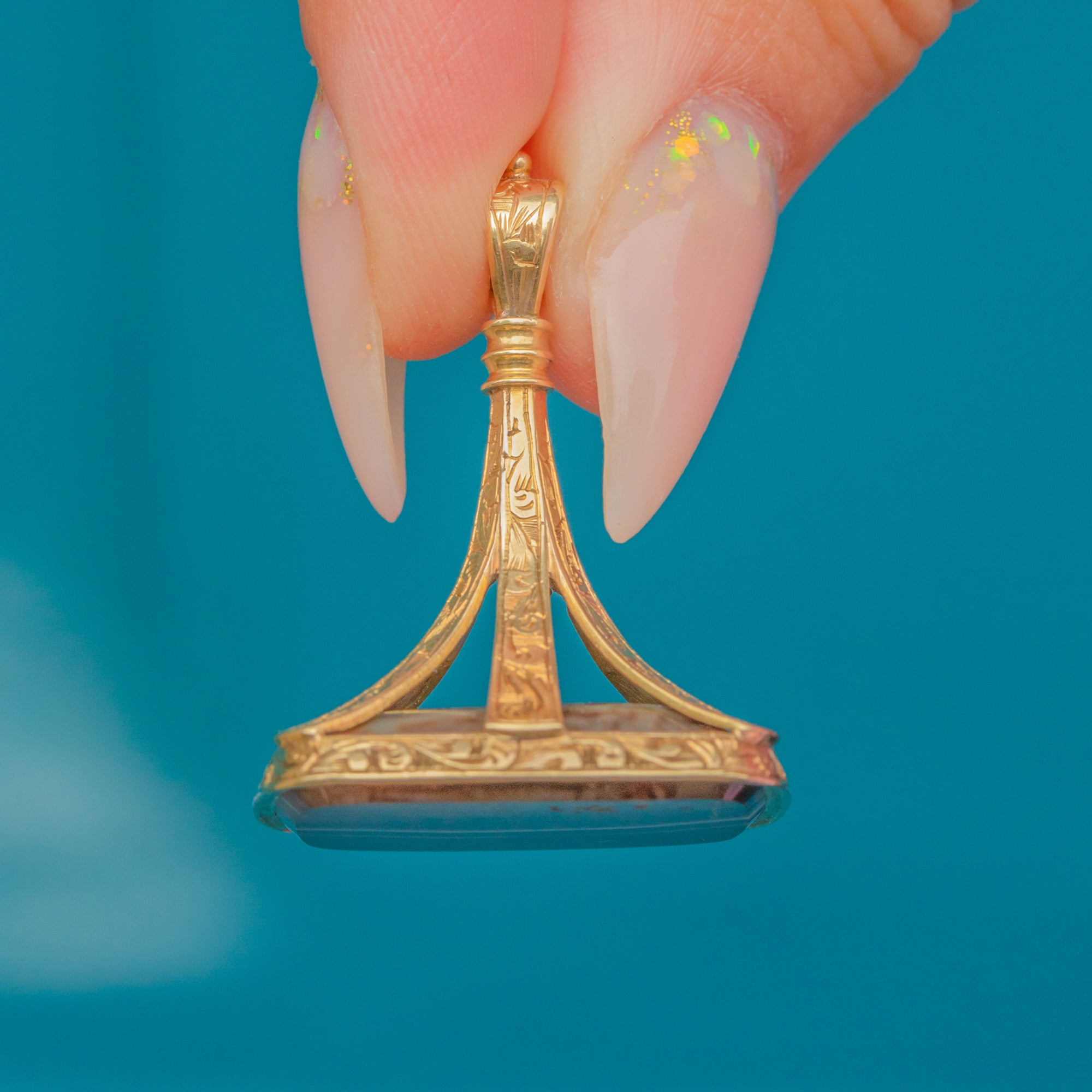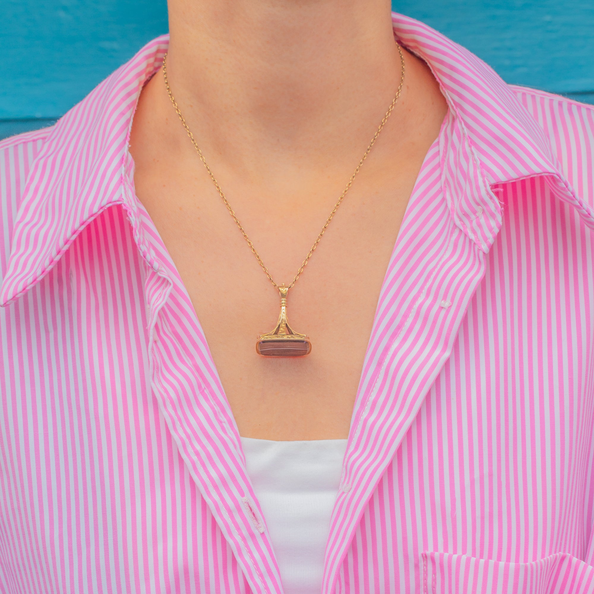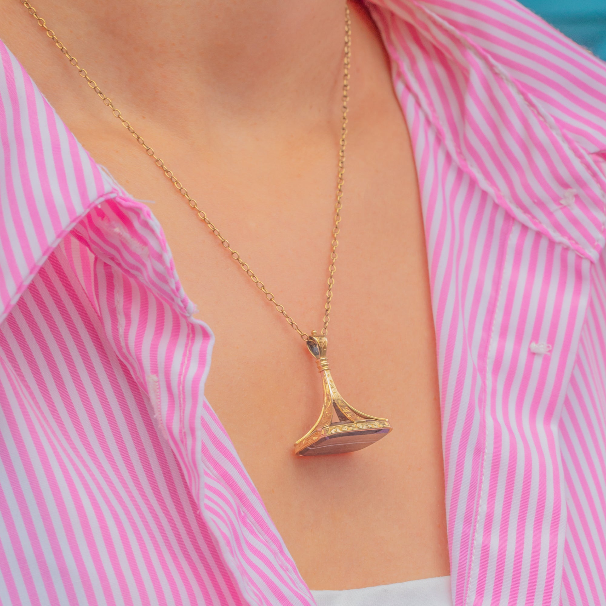 Originally designed as a watch fob, it now makes a bold pendant with timeless appeal, the perfect companion for a Gold chain.