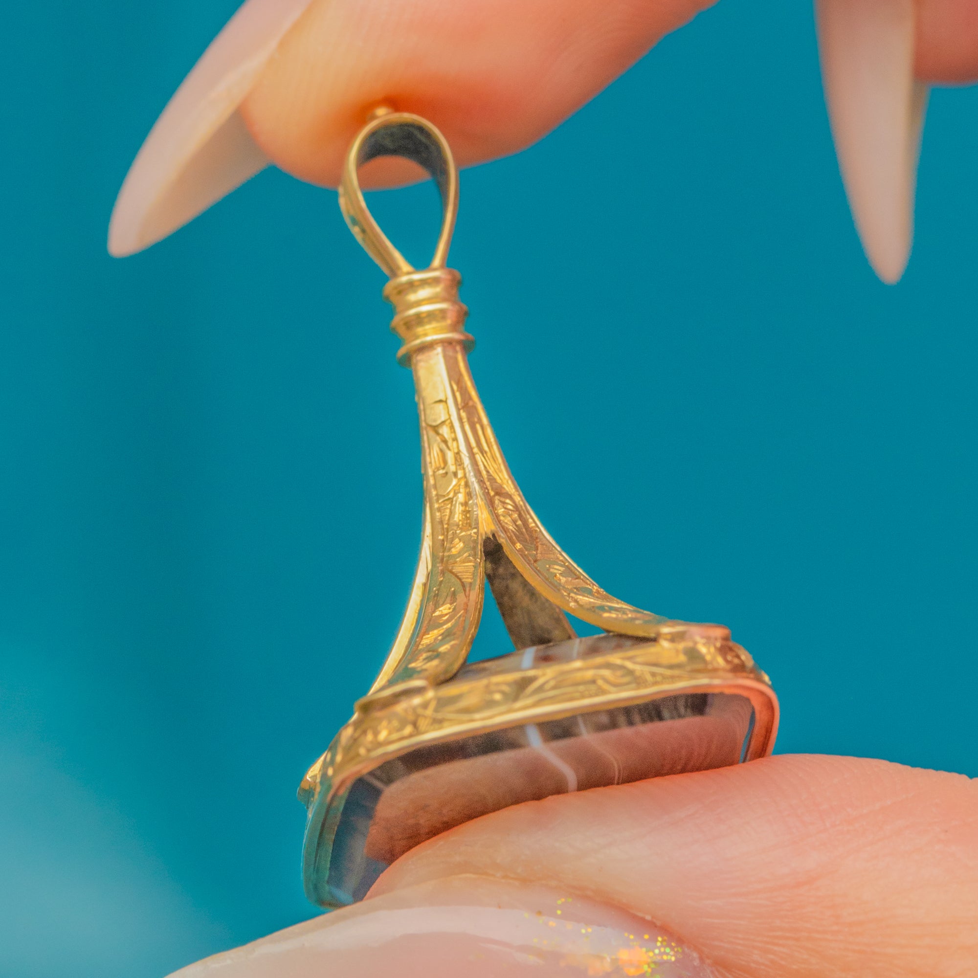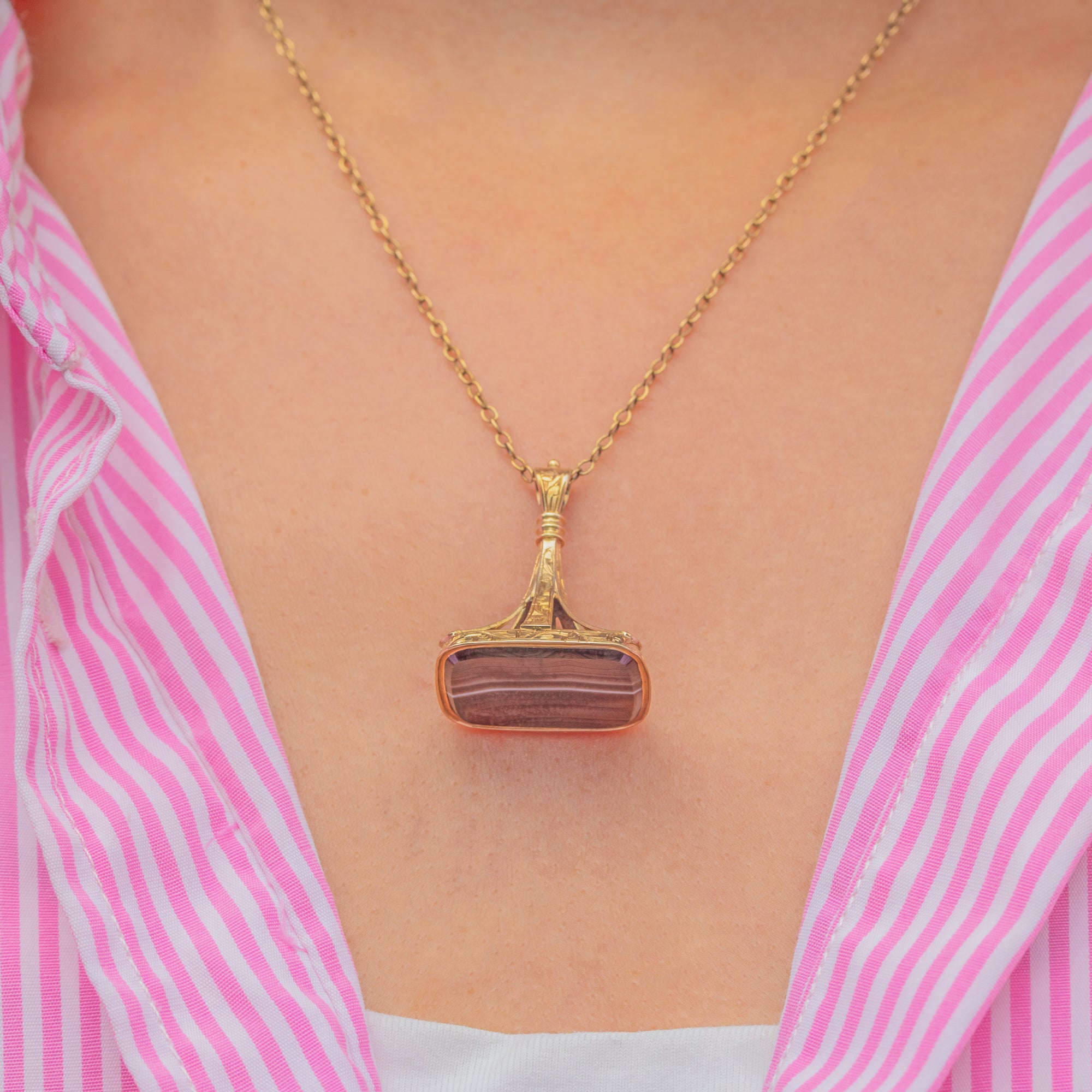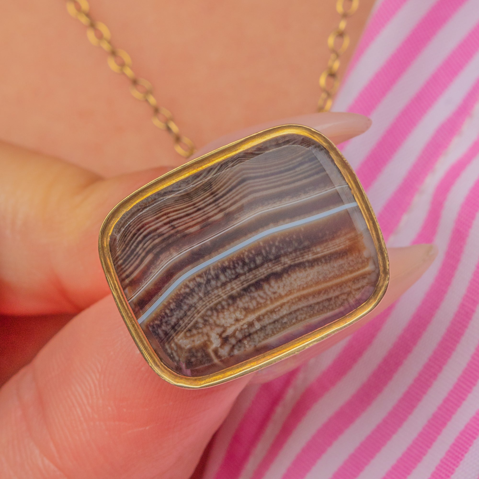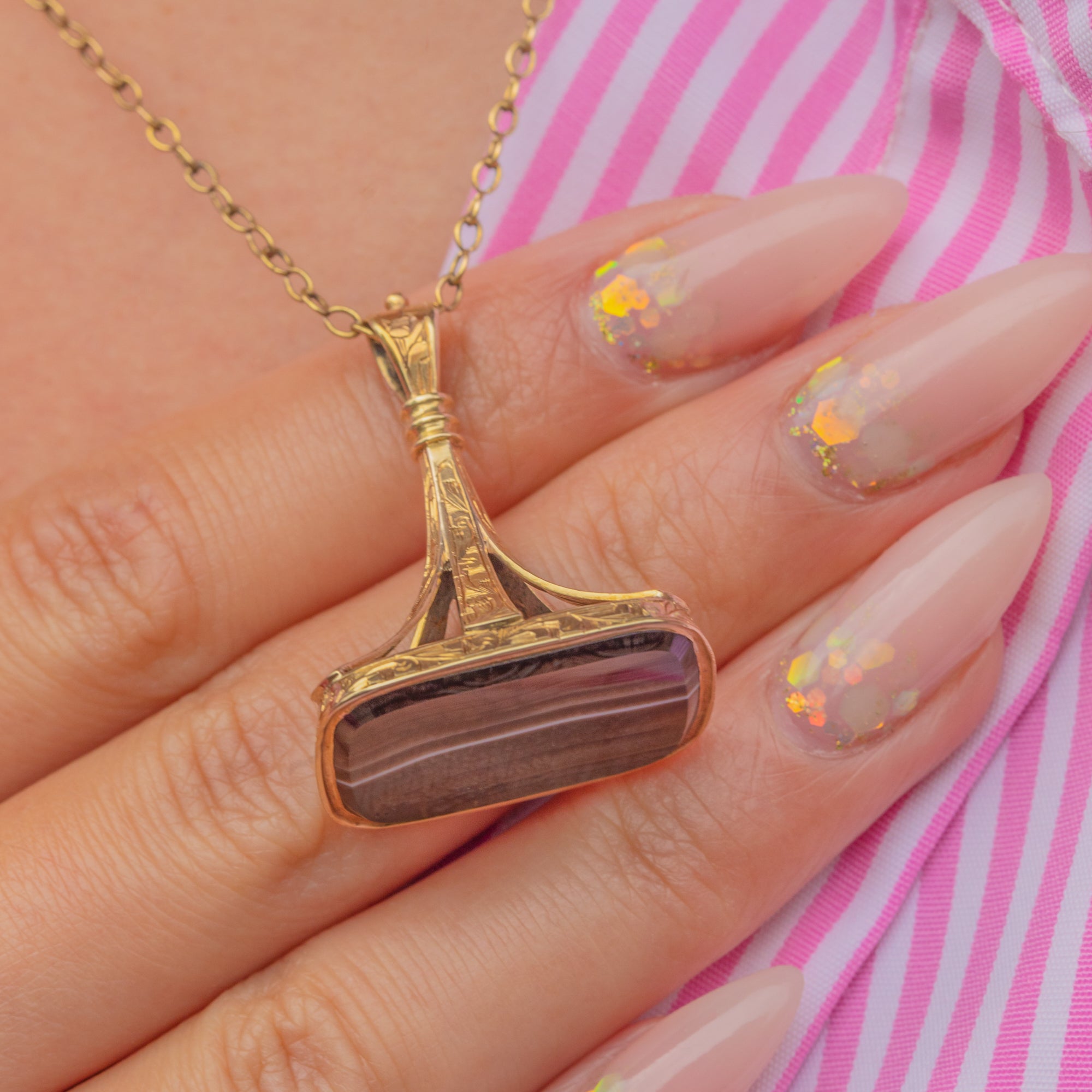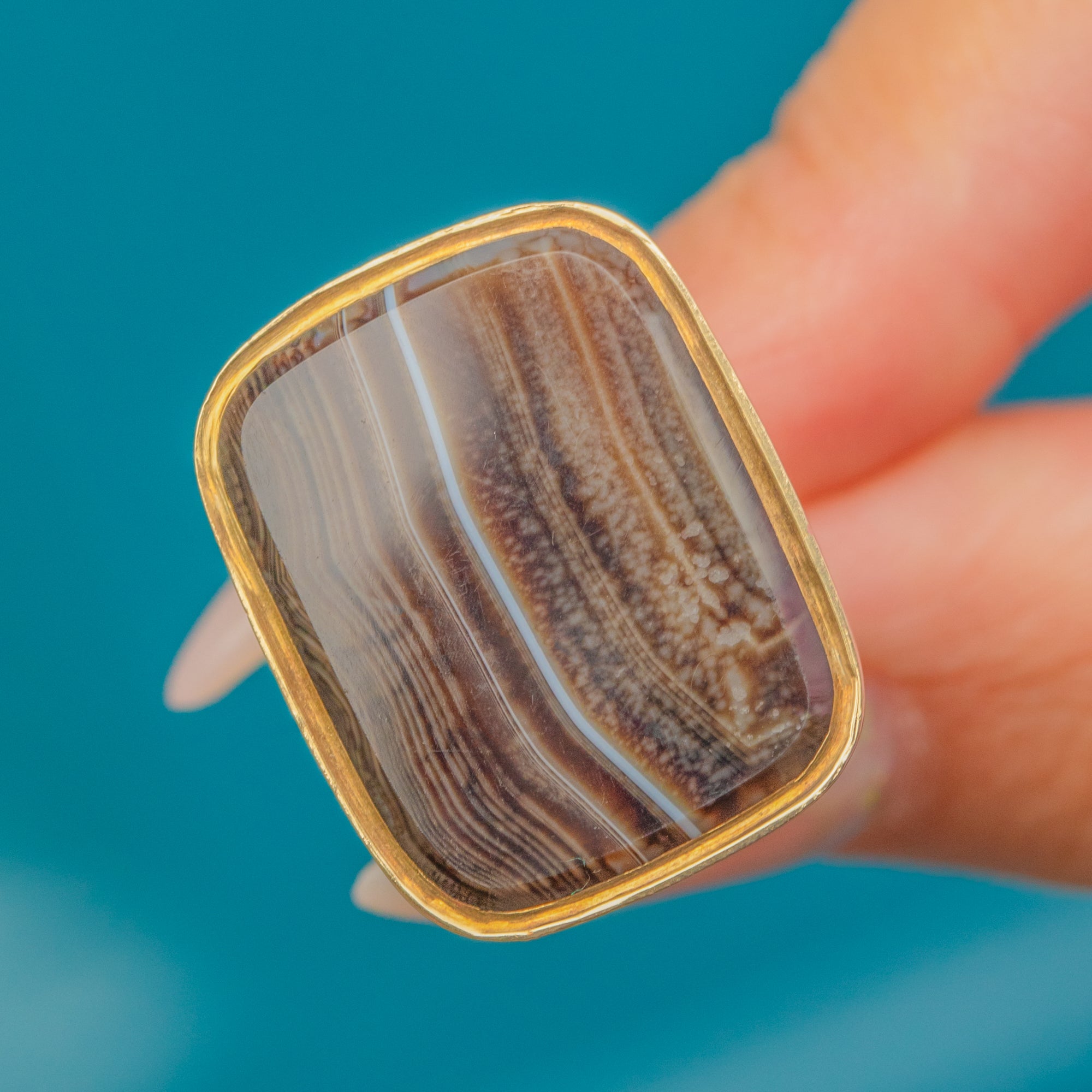 MATERIALS: Tests as 15ct Gold, Banded Agate.