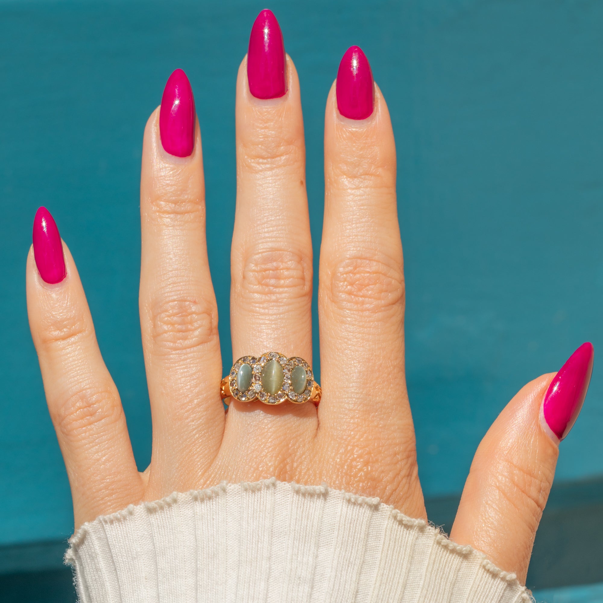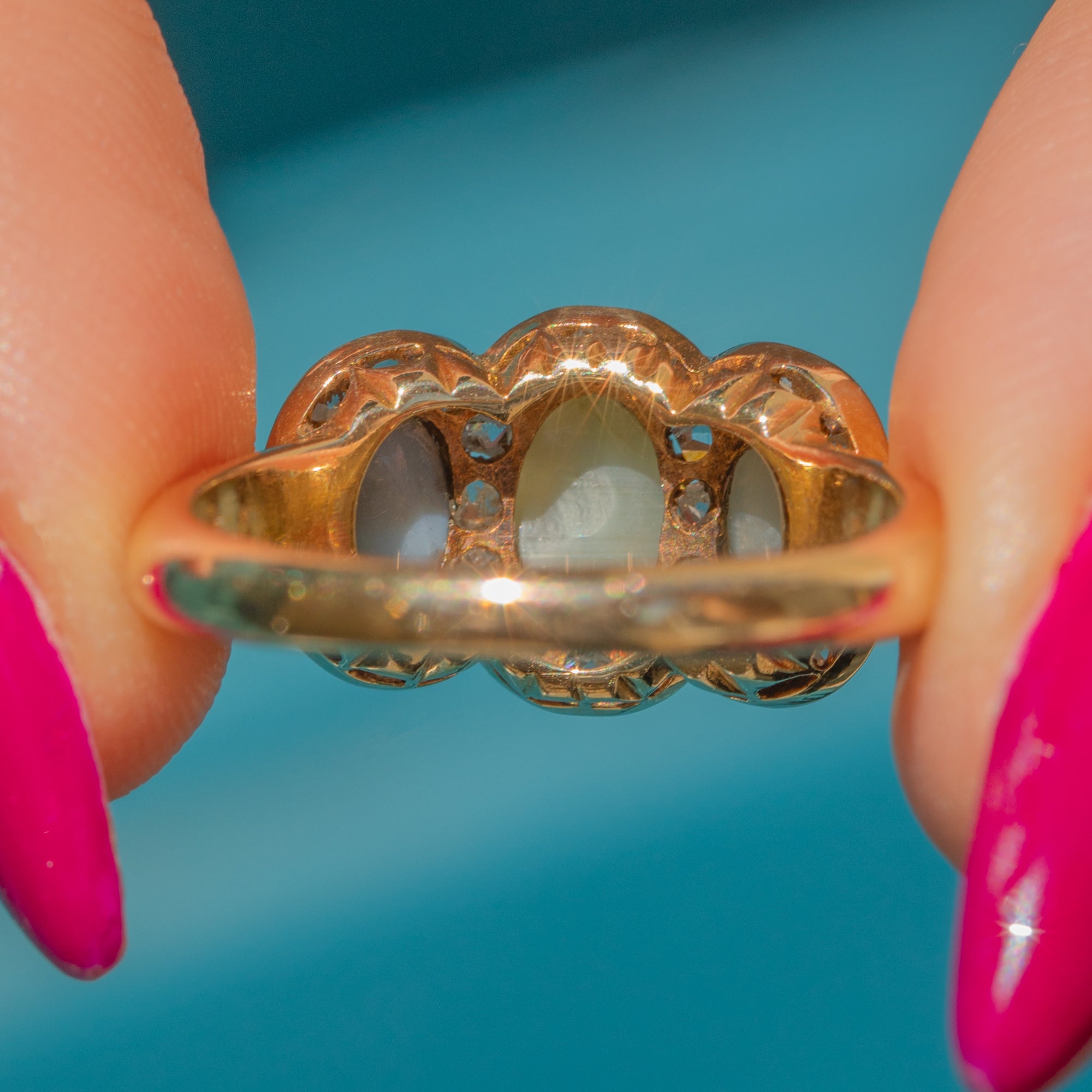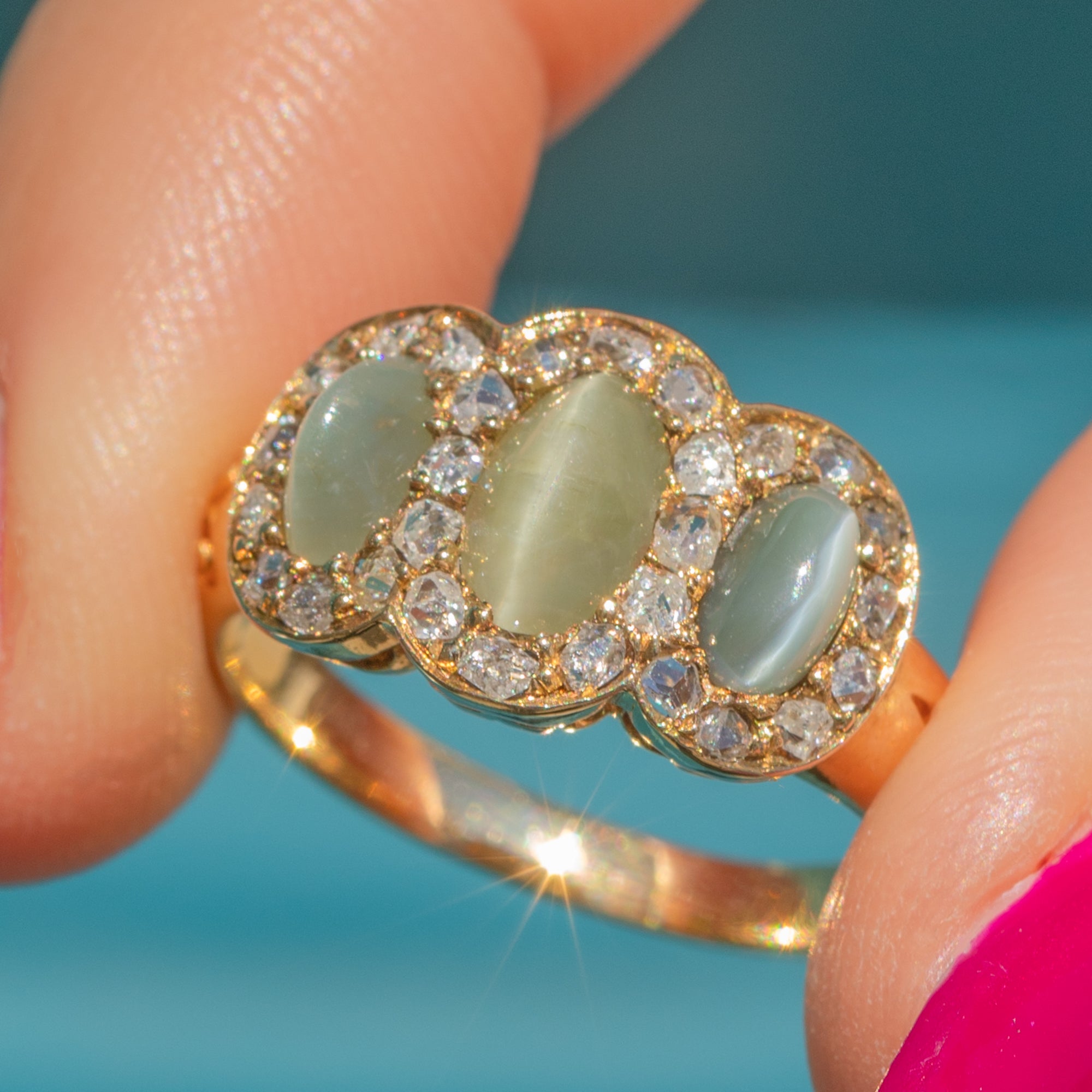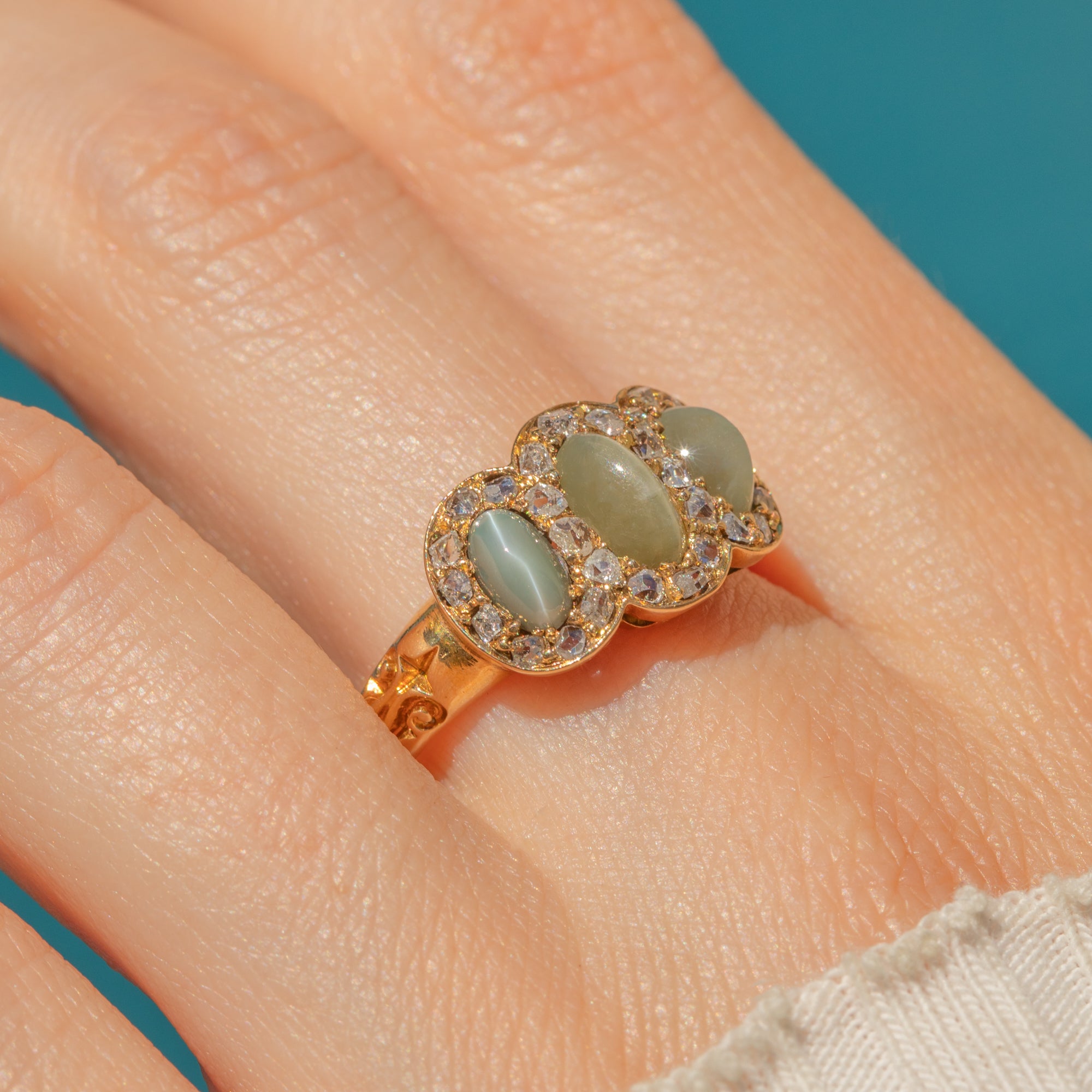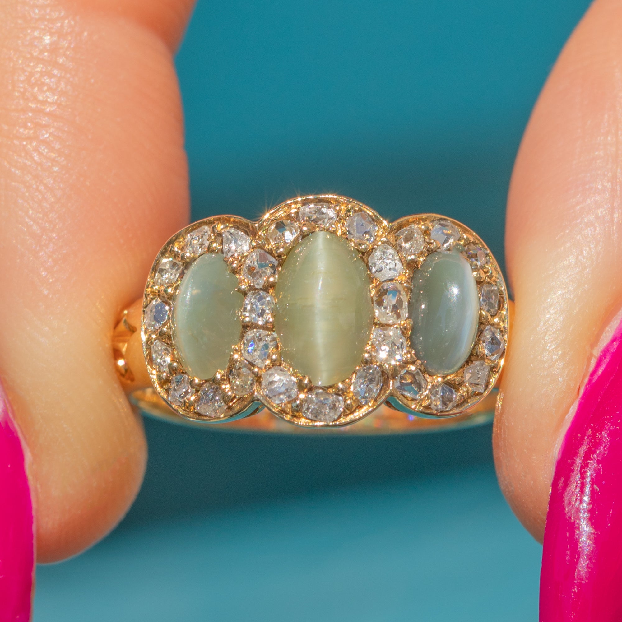 EXCELLENT: The three Cat's Eye Chrysoberyls display strong chatoyancy and are free from chips or cracks, showing only minor surface wear, consistent with age, under 10x magnification. The rose-cut Diamonds are bright and well-matched, with no visible damage. The 15ct Gold is bright and glossy, with no thinning or signs of past resizing. Overall, the ring presents beautifully and remains structurally sound, suitable for occasional wear with appropriate care.
