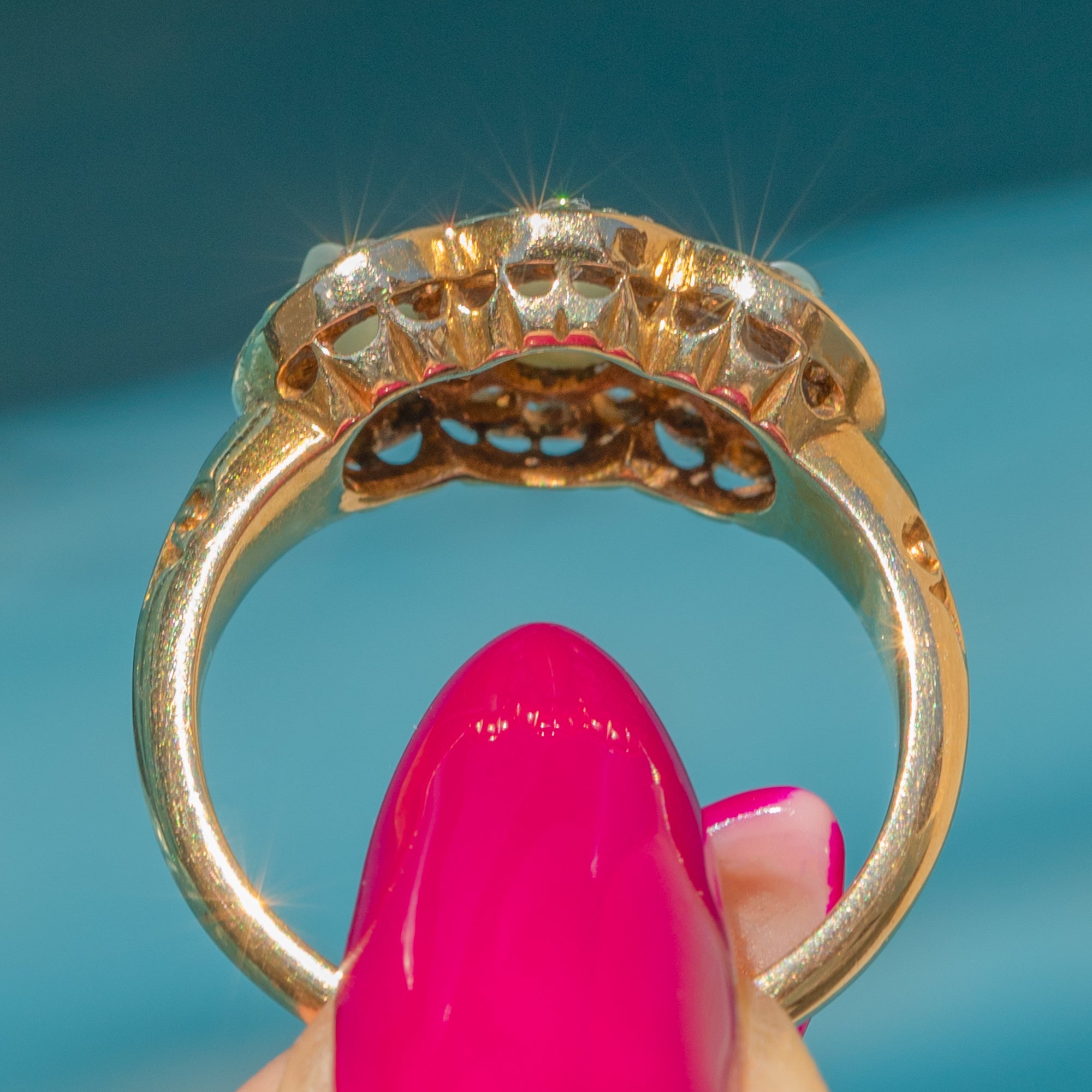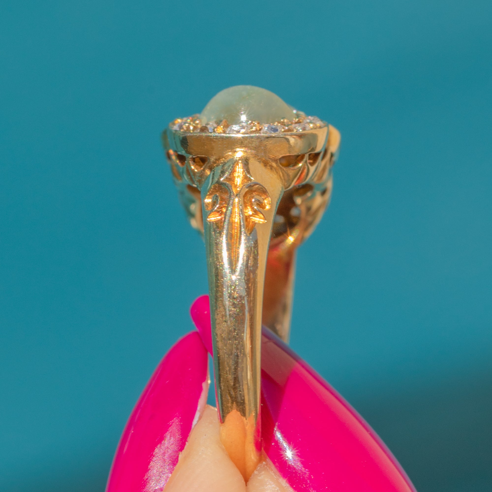A stunning example of Victorian craftsmanship, this 15ct Gold ring features 2.00cts of Cat’s Eye Chrysoberyls, showcasing a sharp luminous chatoyancy - named due to its likeness to the lustre and mystique of a cat’s eye!