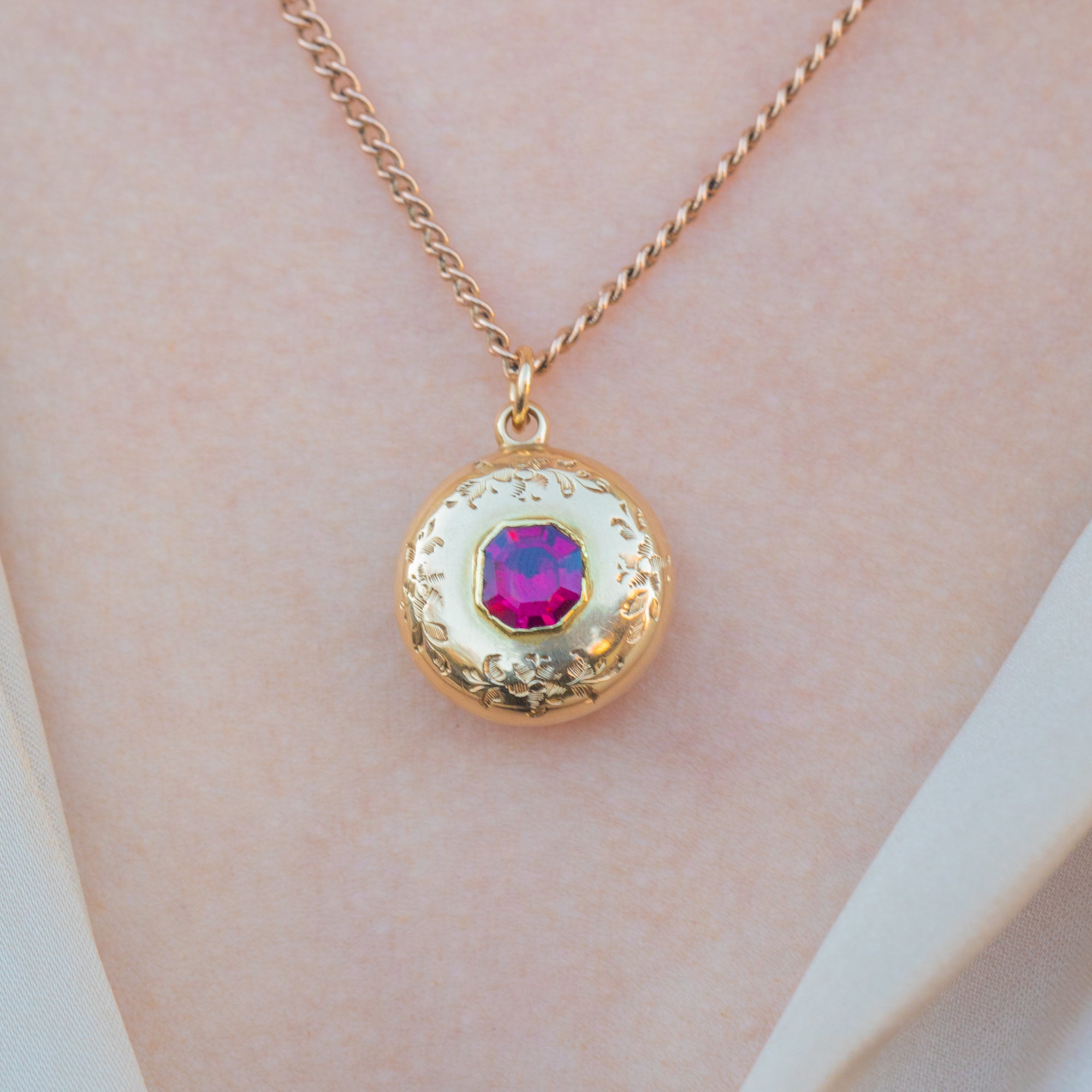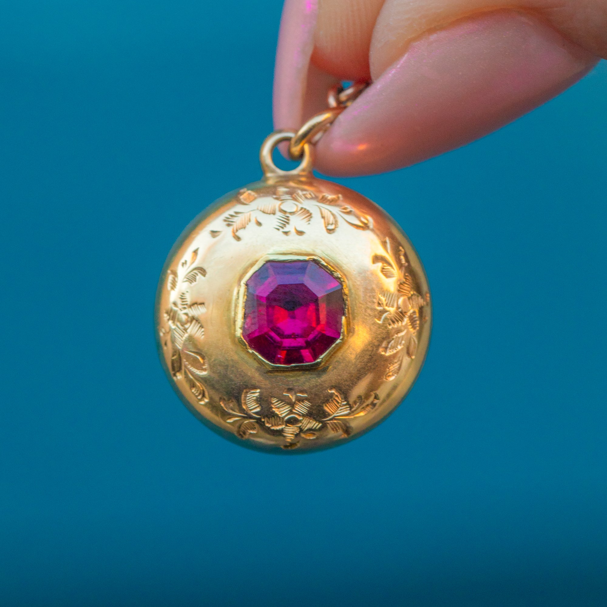 Fall in love with this Victorian 15ct Gold floral engraved Garnet pendant. This characterful pendant is a satisfying dome shape, engraved with floral motifs and a cherry red Garnet.