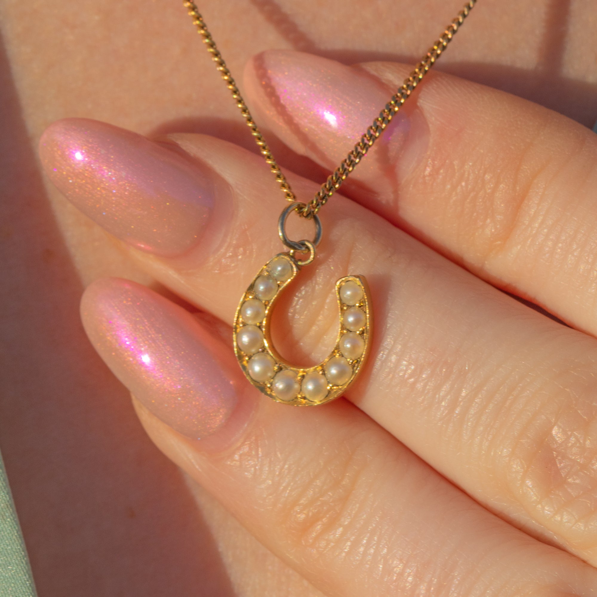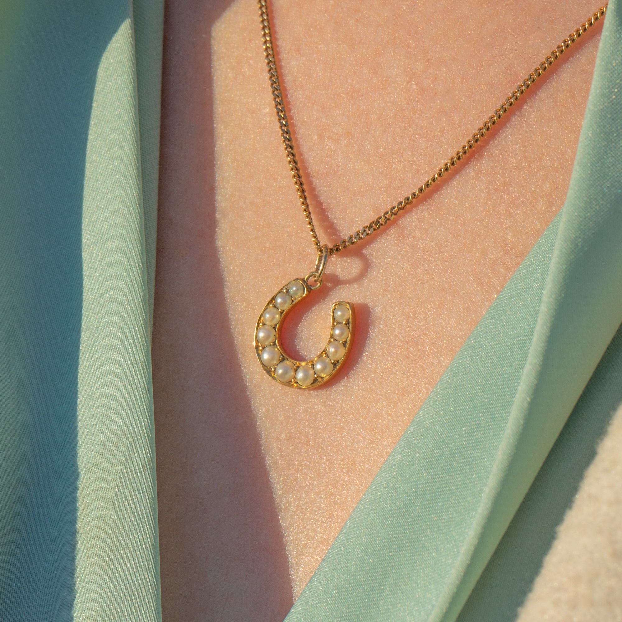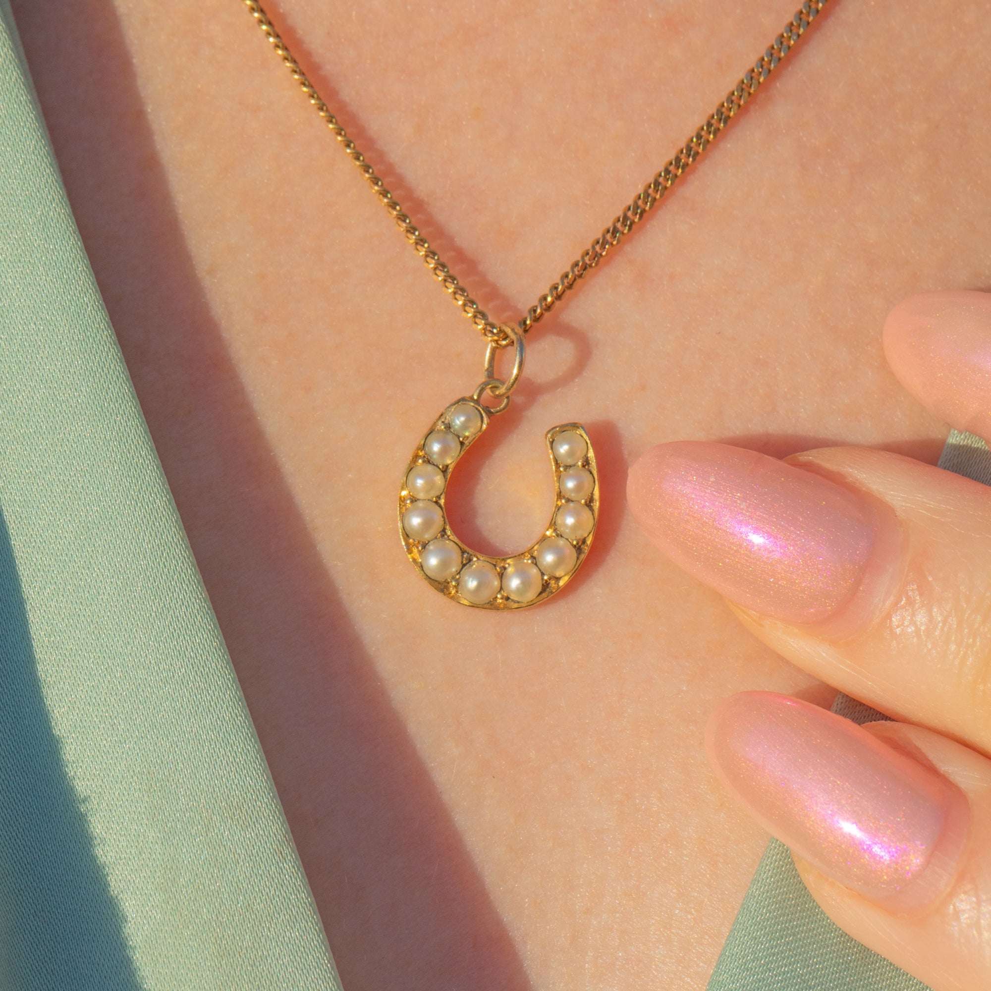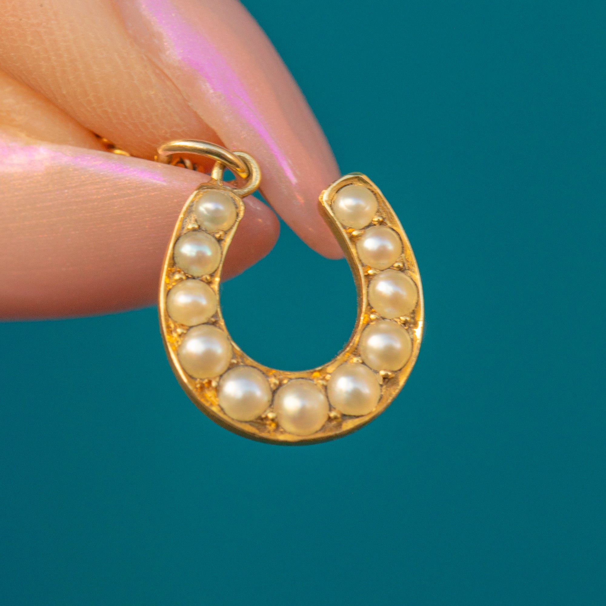 EXCELLENT. This Victorian 15ct Gold horseshoe charm is in excellent condition. Each Pearl is firmly set and her jump ring is soldered securely. There are some very minor signs of wear commensurate with age, however this can only be seen under a jeweller's loupe. In excellent condition, she is a must-have!