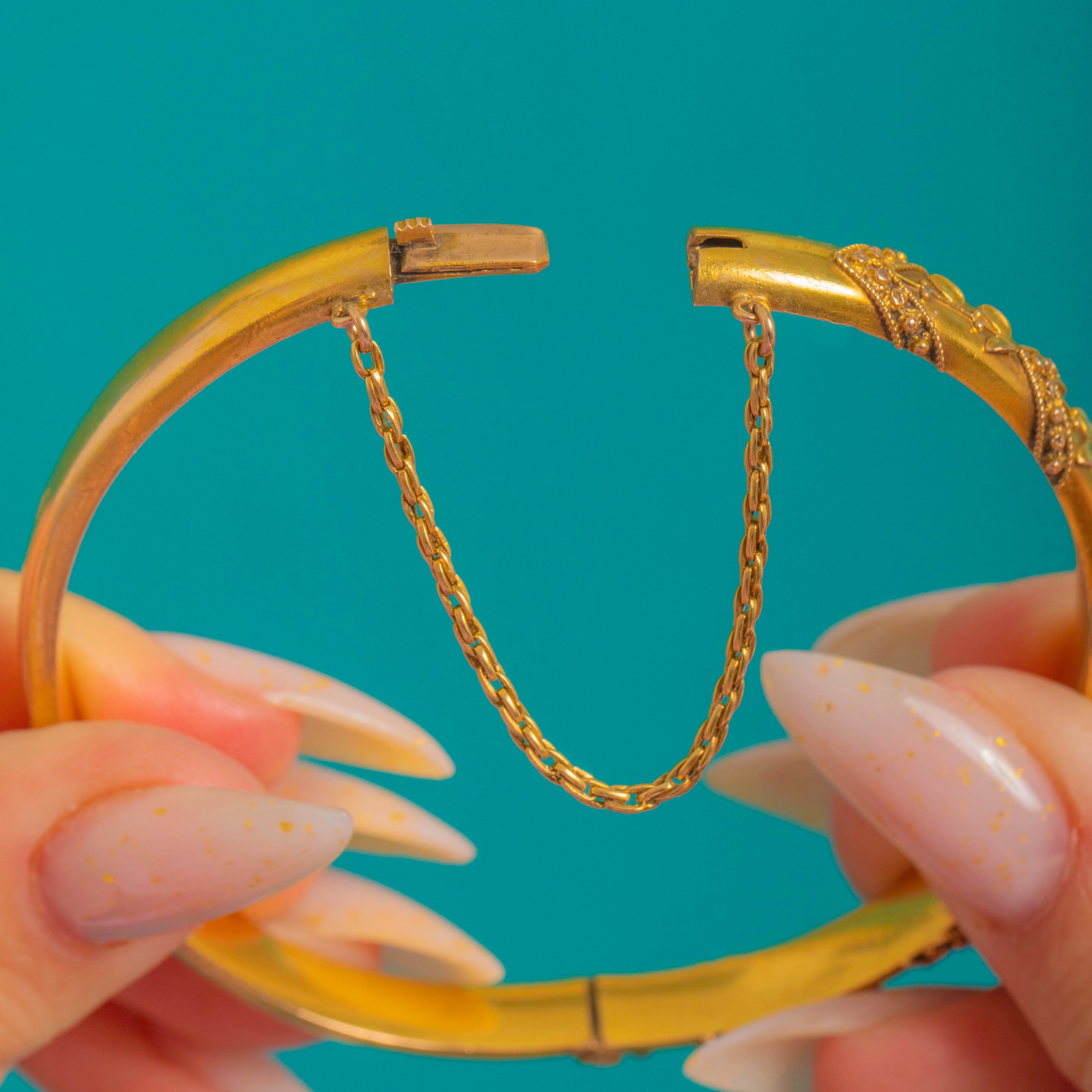 A refined Victorian hinged bangle in luminous 15ct Gold, beautifully ornamented with repeating chevron panels edged in delicate bead-like granulation and centred with graceful foliate sprigs. The softly matte, “bloomed” finish lends an elegant antique glow, capturing the Etruscan Revival aesthetic with poise and finesse.