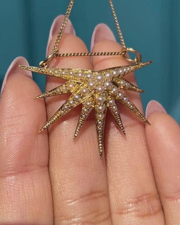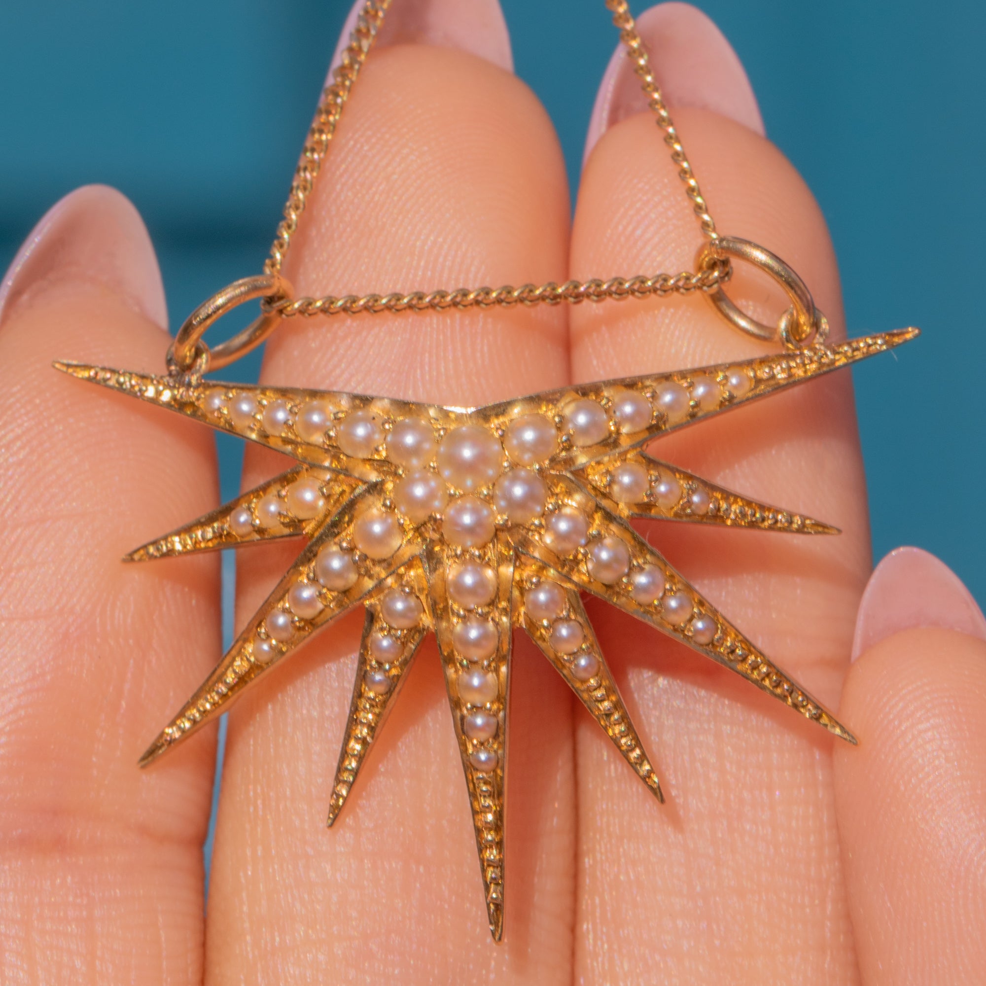 EXCELLENT. This Victorian 15ct Gold Pearl starburst pendant is offered in excellent condition. The Pearls are all present and creamy, each one has retained its natural nacre and is securely set. The 15ct Gold is radiant and free from dents, and both jump rings are soldered shut promising you years of wear and enjoyment. This Victorian Pearl pendant is set to become your new go-to piece!