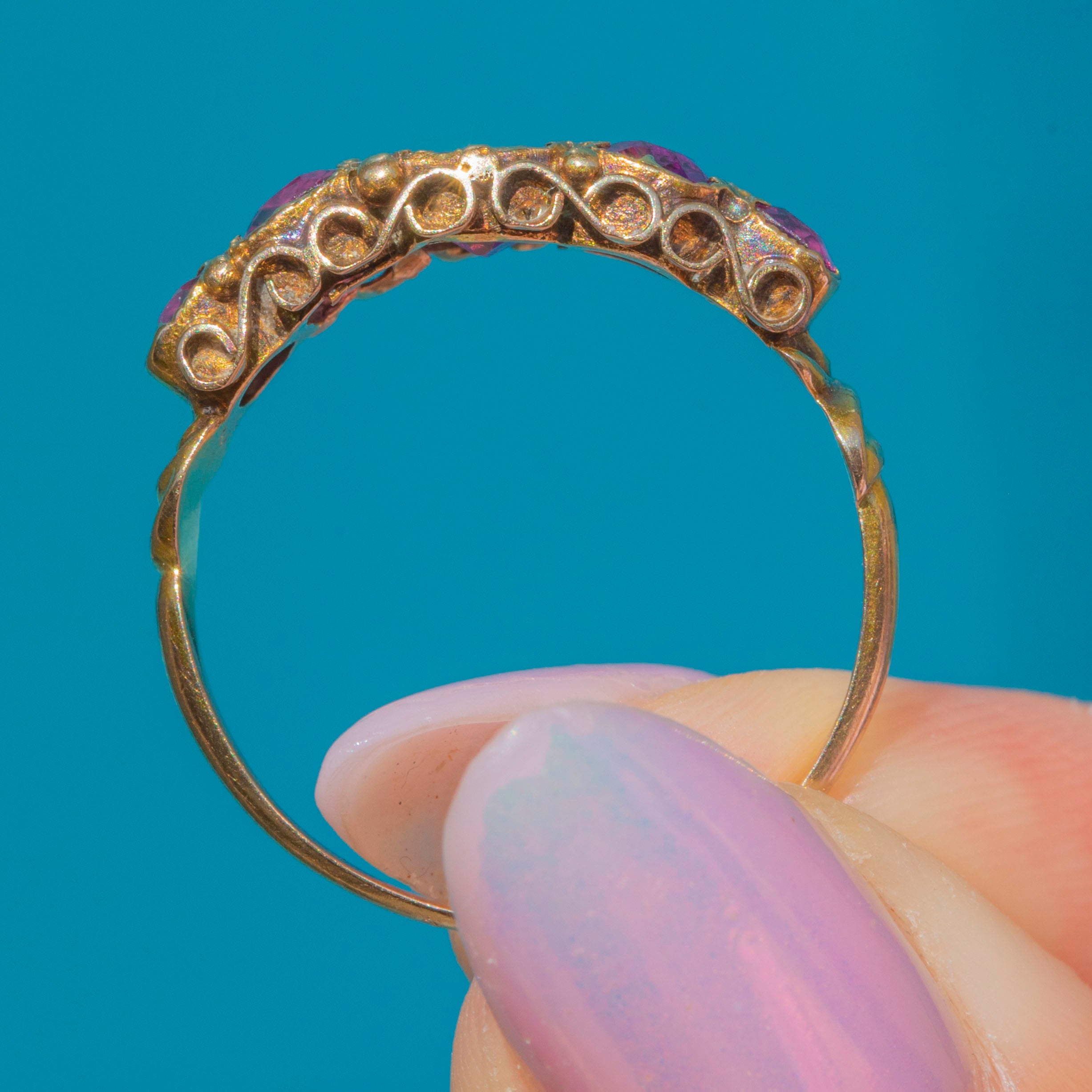 This antique Rhodolite Garnet ring is a super sweet piece from the Victorian era! Boasting a cluster of twinkling pink Rhodolite Garnets, with a combined 1.00 carats, boasting a marvellous magenta hue, this Victorian ring is brimming with romance.