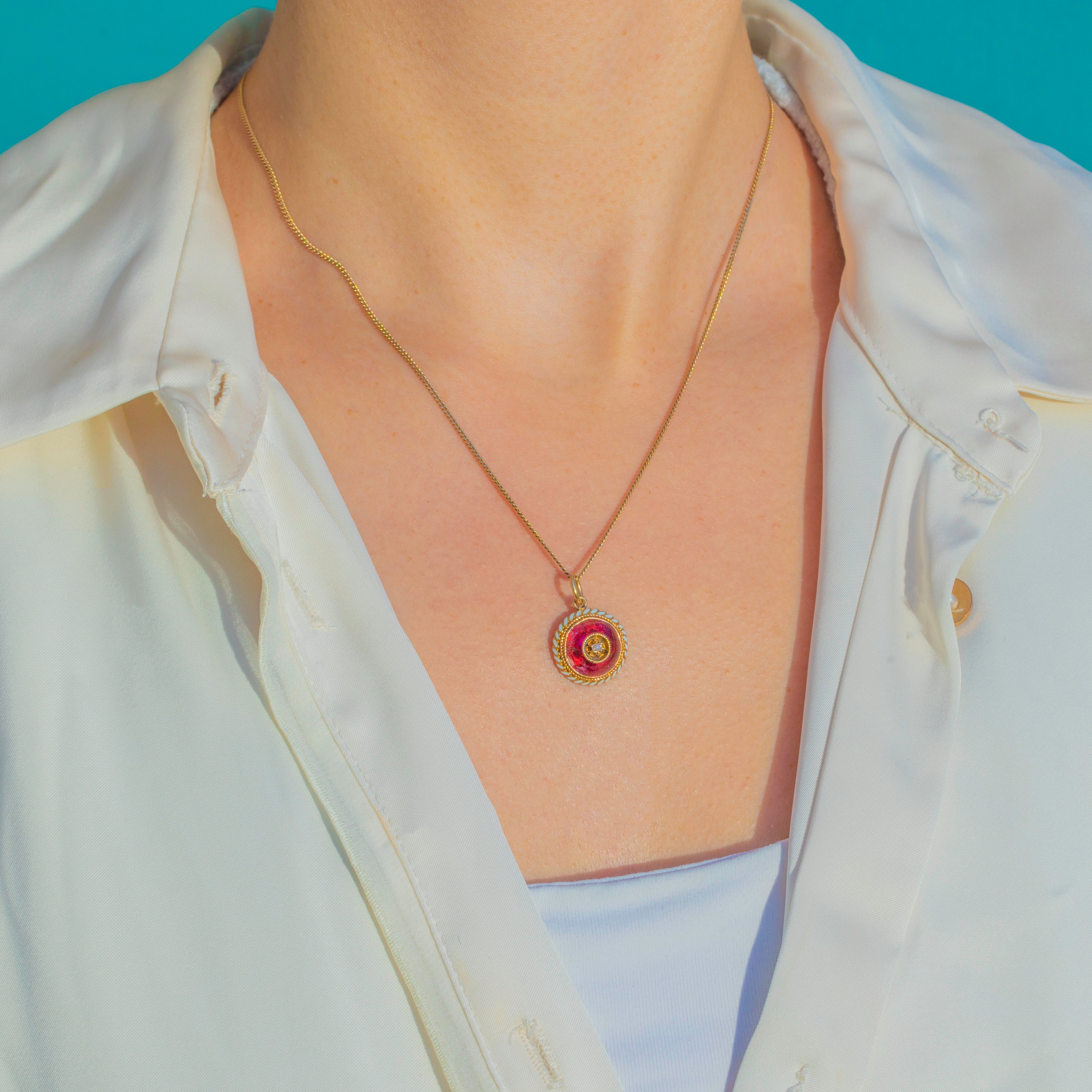 This beautiful Victorian pendant is crafted in rich 15ct Gold and set with a glowing domed Rock Crystal backed by vivid pink foil. The colour play is wonderfully romantic, enhanced by a delicate white enamel border and a dainty Diamond expertly set at the centre for the perfect touch of sparkle!