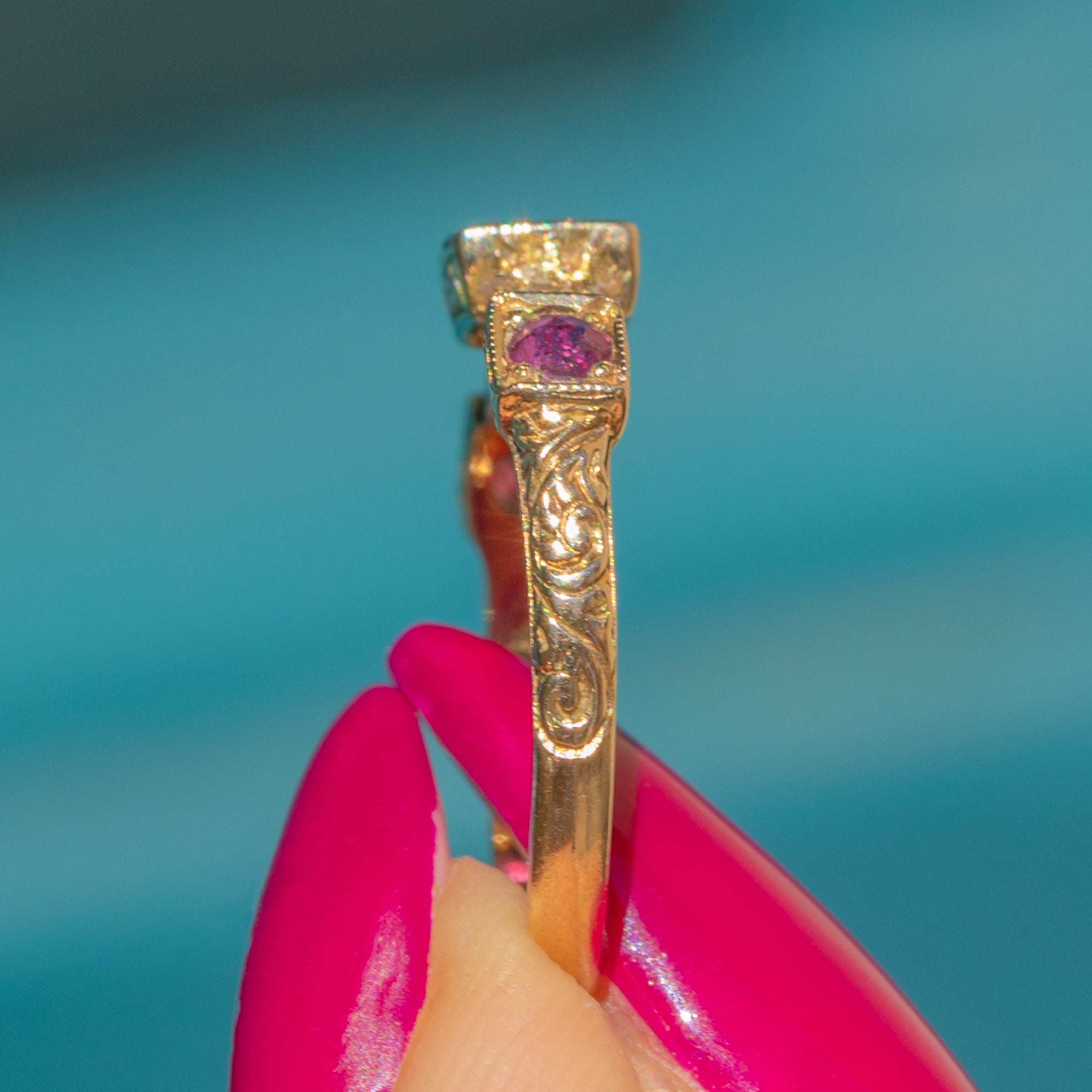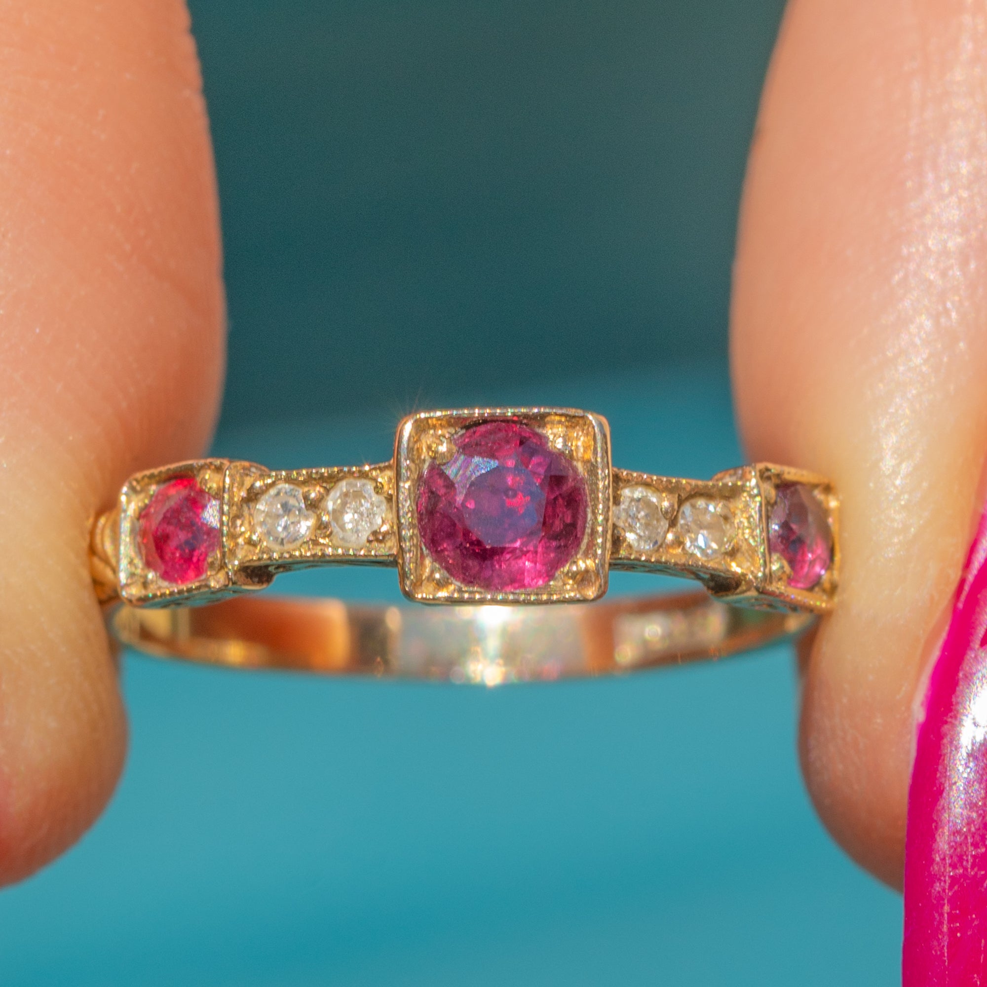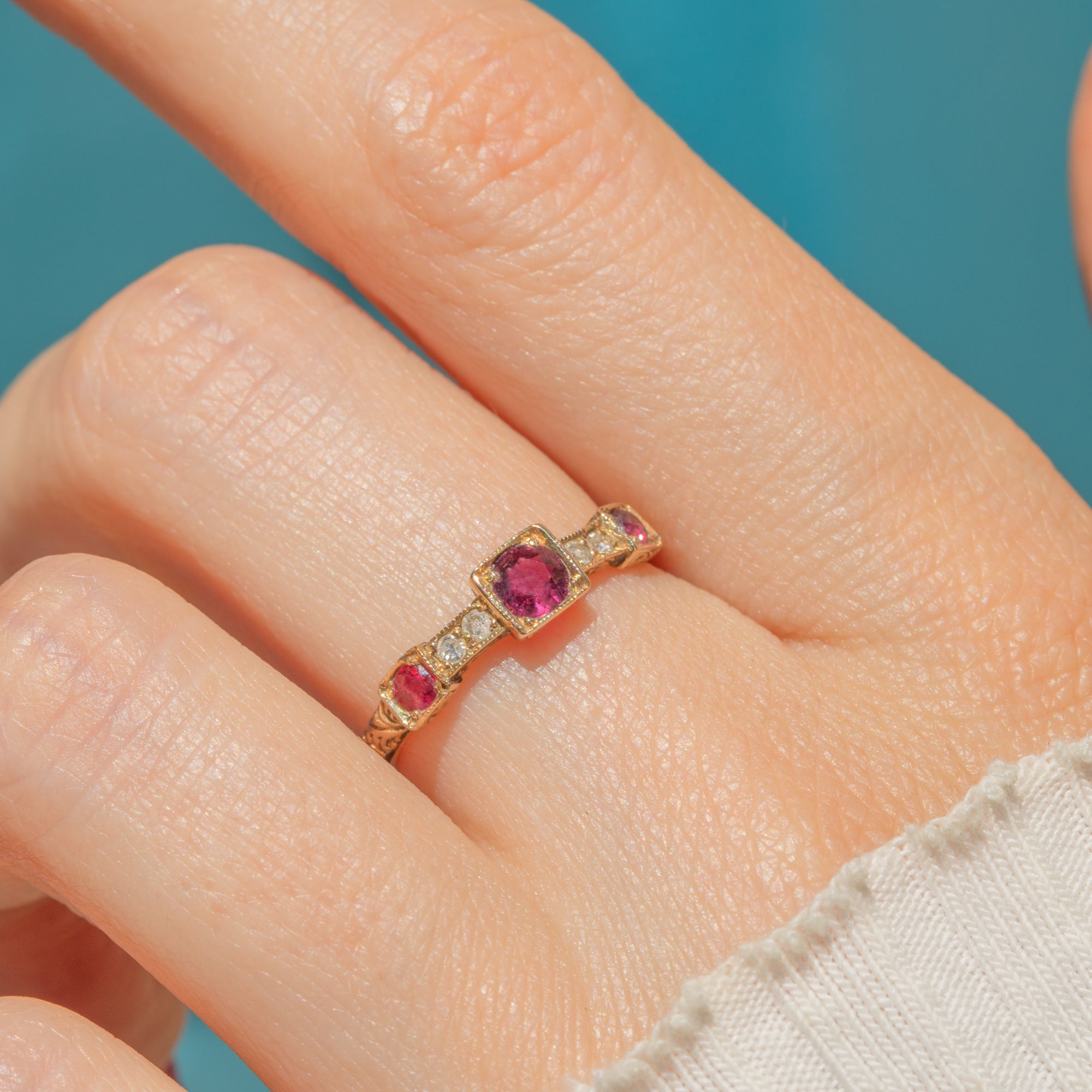 This Victorian ring features three stunning graduated Rubies, each nestled in square mounts akin to the turrets of a medieval castle, and is accented by four sparkling Diamonds!