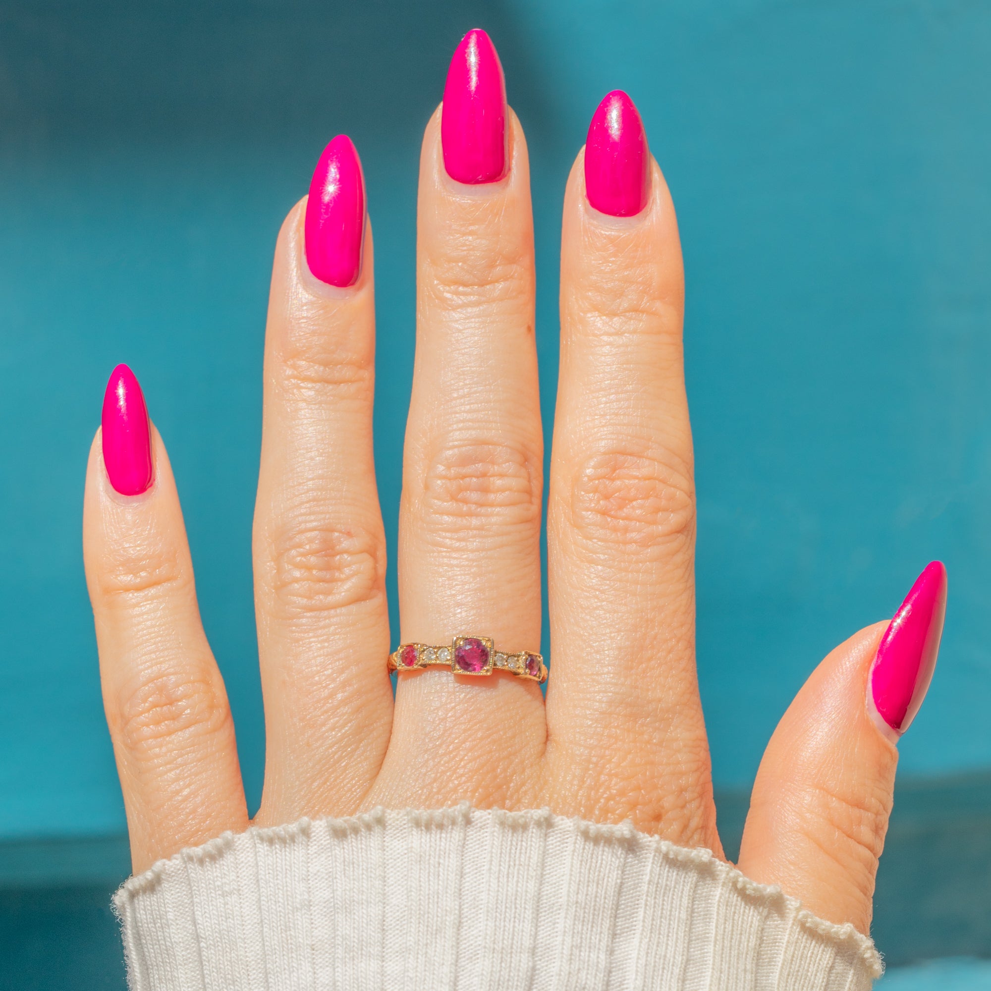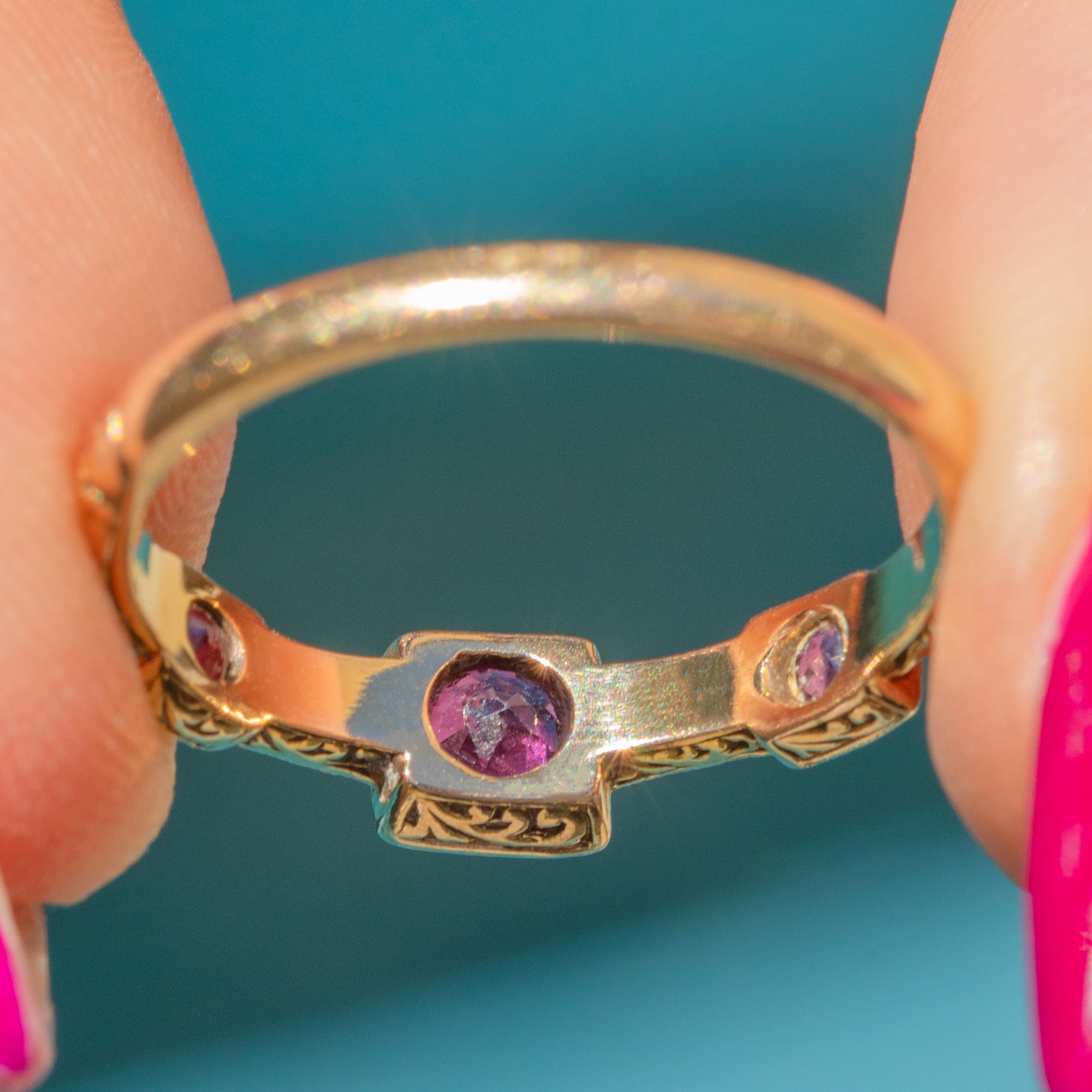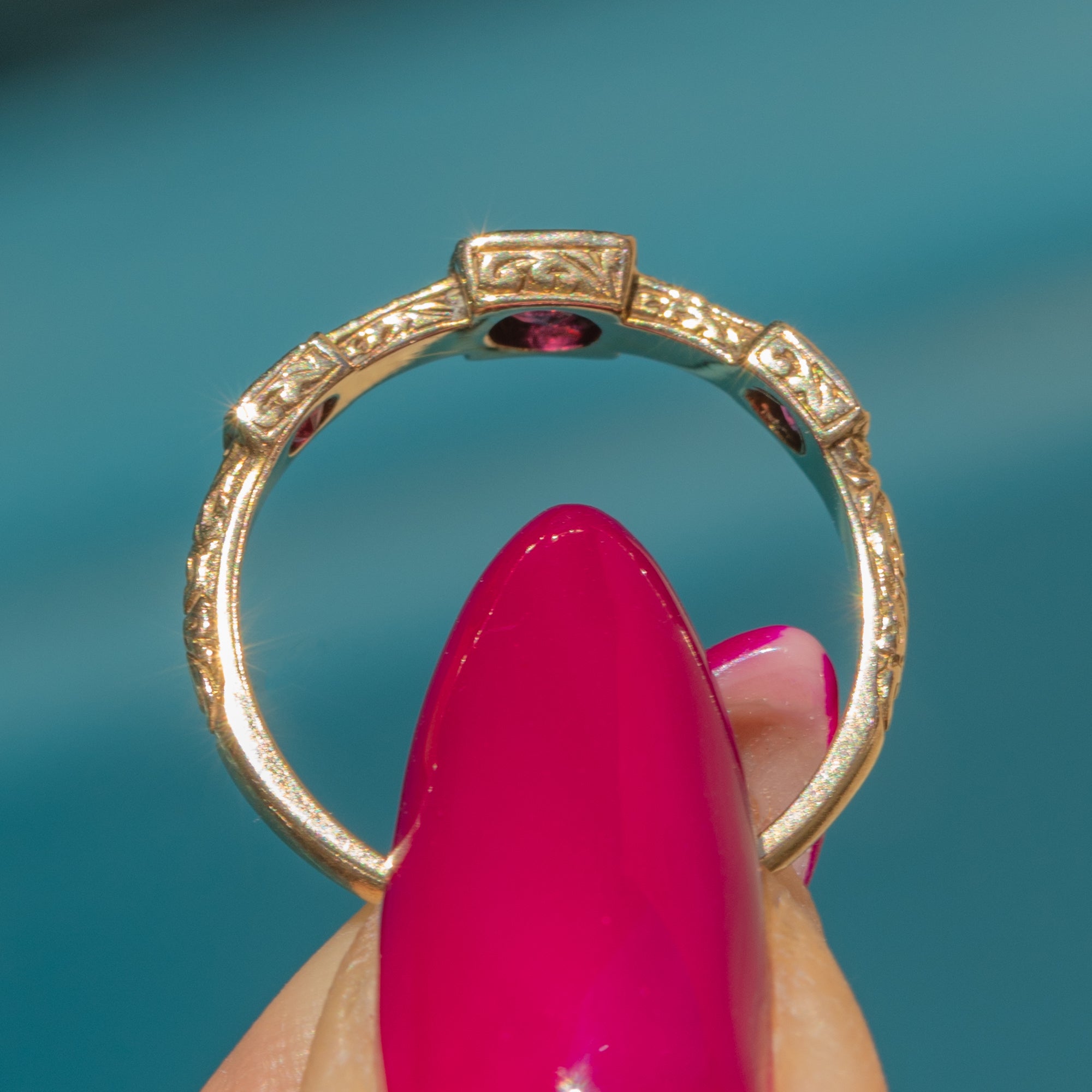 This Victorian ring features three stunning graduated Rubies, each nestled in square mounts akin to the turrets of a medieval castle, and is accented by four sparkling Diamonds!