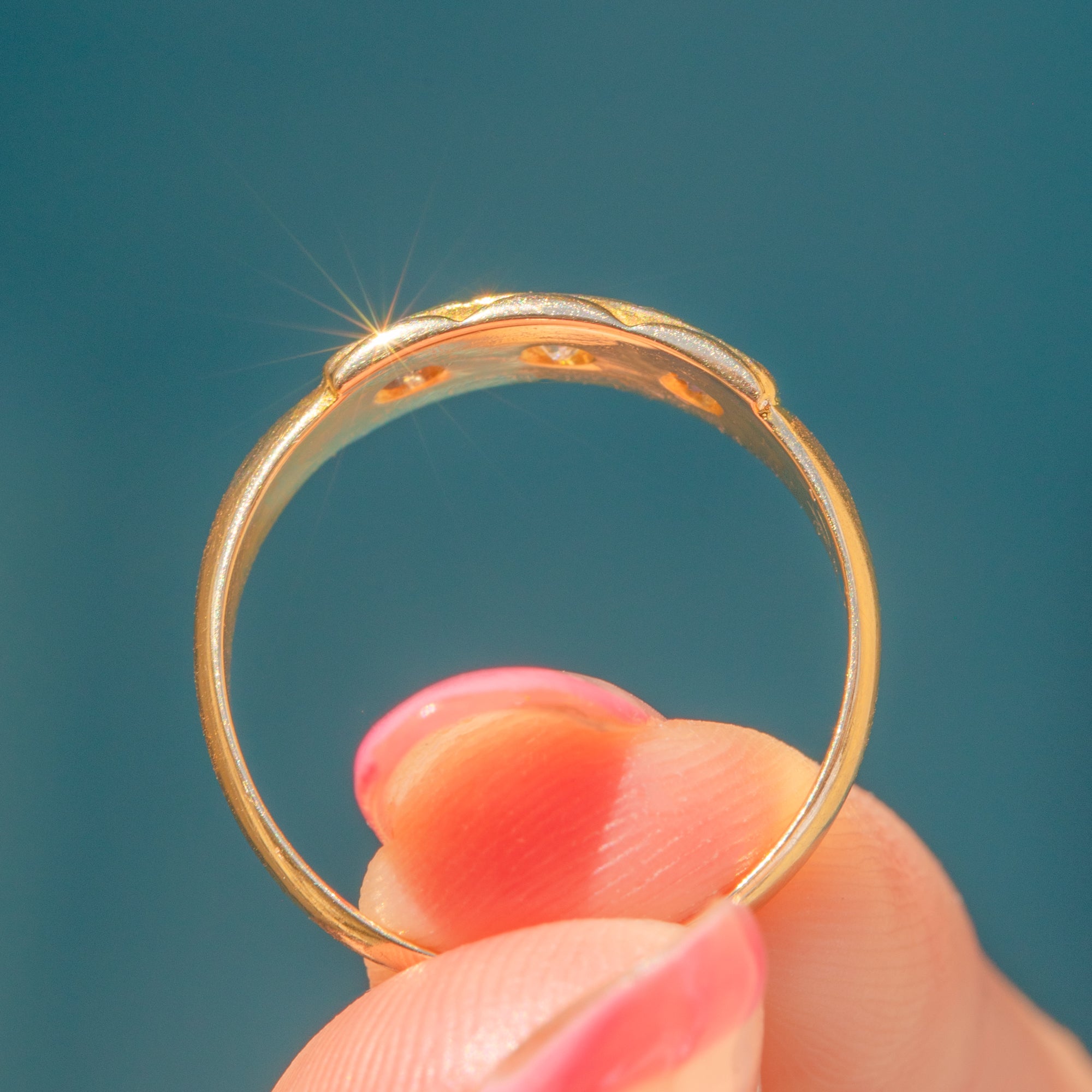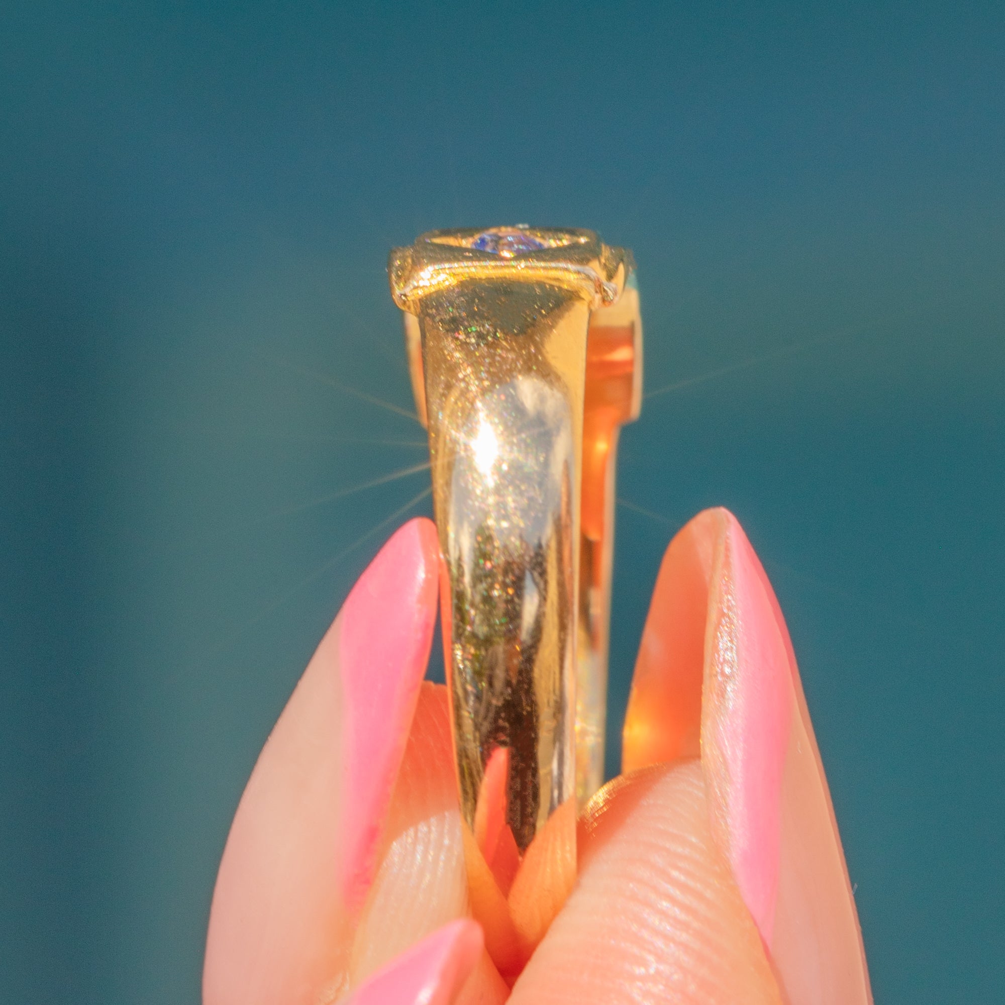 Flaunting a geometric form with a timeless appeal, you will have no problem incorporating this Victorian Sapphire Diamond ring into your ring stack. Crafted entirely from buttery 18ct Gold with a glossy finish, this antique gypsy ring glides onto your hand a dream and is the perfect piece to stack alongside your other Golden goodies or to wear alone!