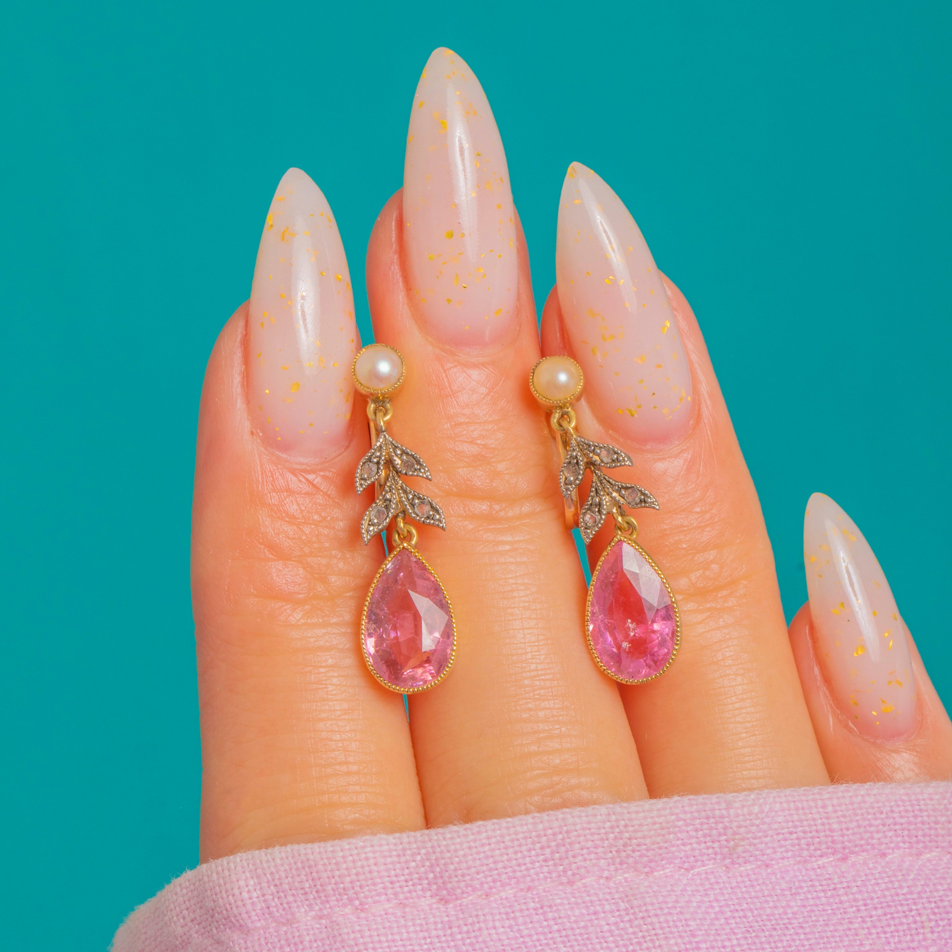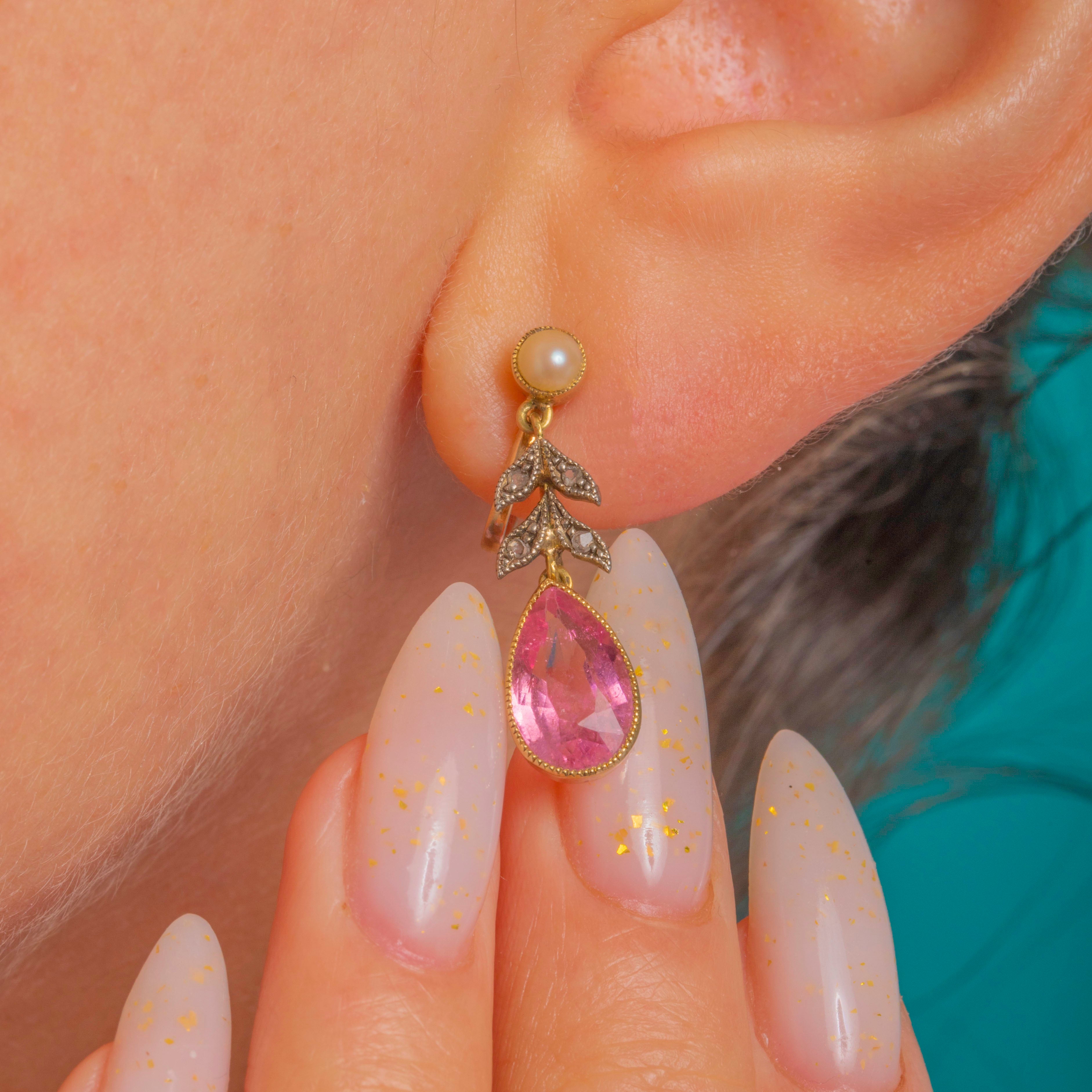 Romance meets refinement in this Victorian pair of articulated drop earrings, crafted in an elegant two‑tone palette of 15ct Gold with Silver settings. A creamy Pearl sits at the top, leading to a white‑toned foliate link sprinkled with tiny Diamonds and finished with a beautifully faceted pear‑shaped pink Tourmaline in a fine milgrain bezel. Each element is joined for graceful movement, with crisp detailing and that coveted antique finesse.